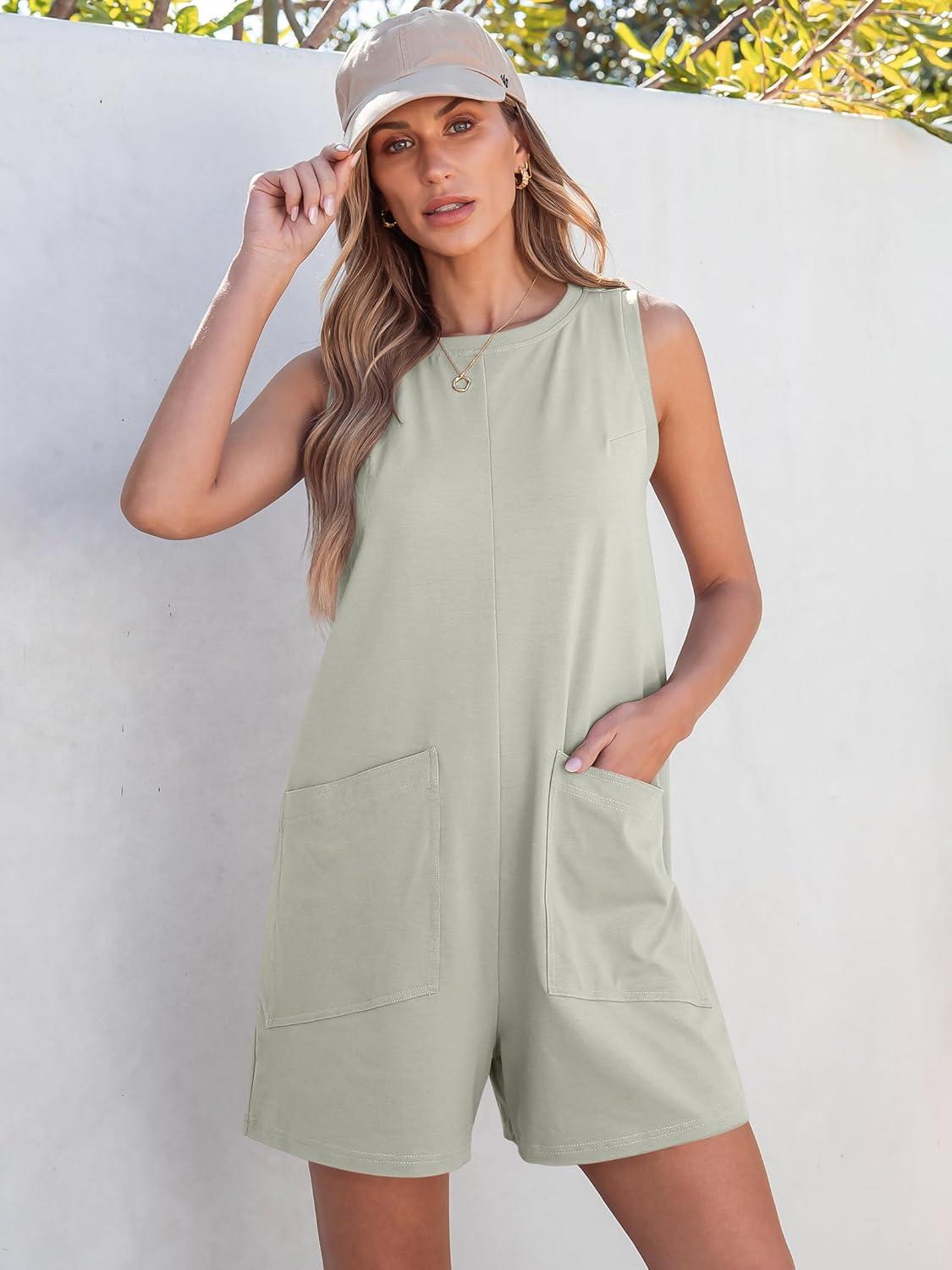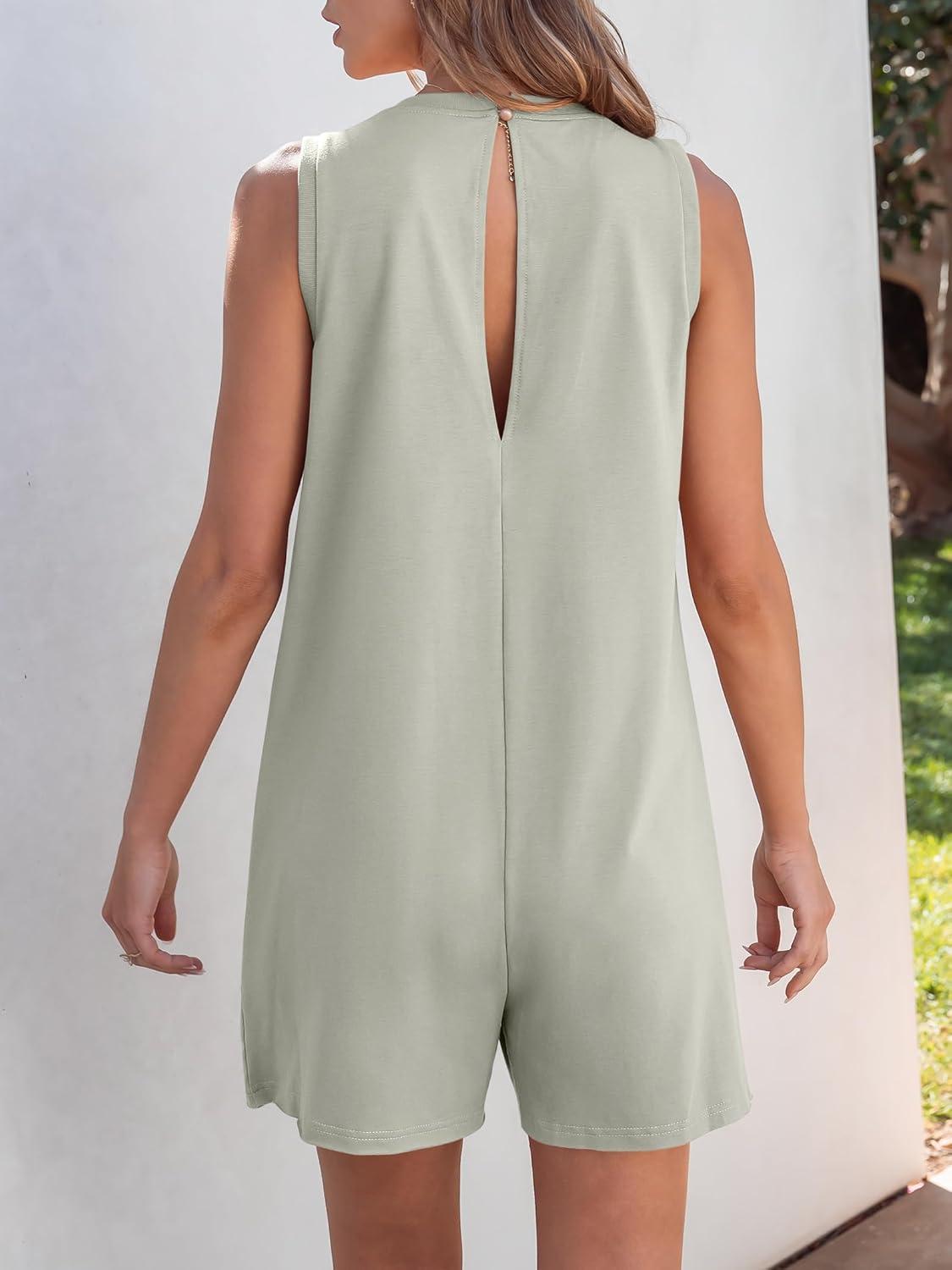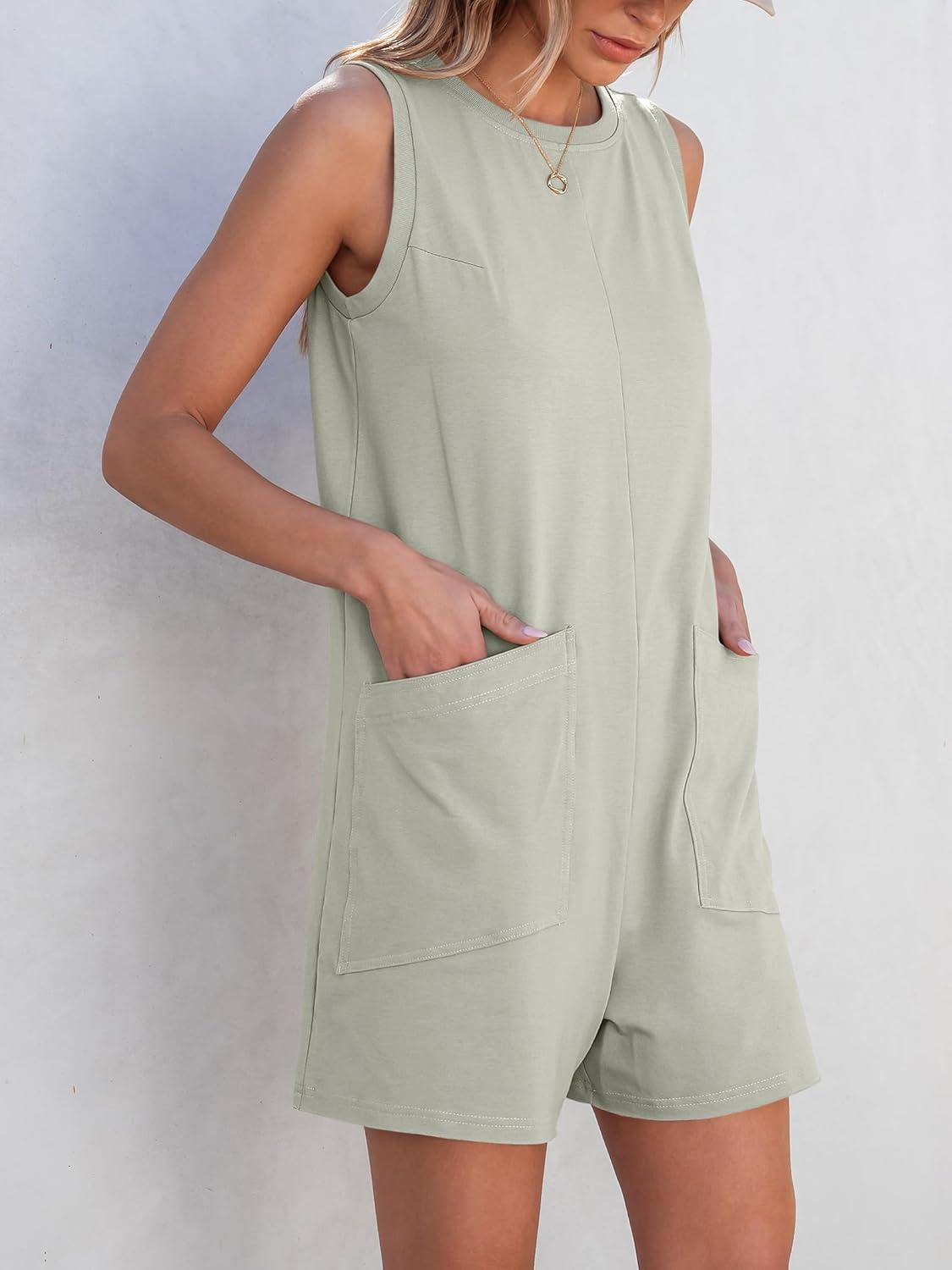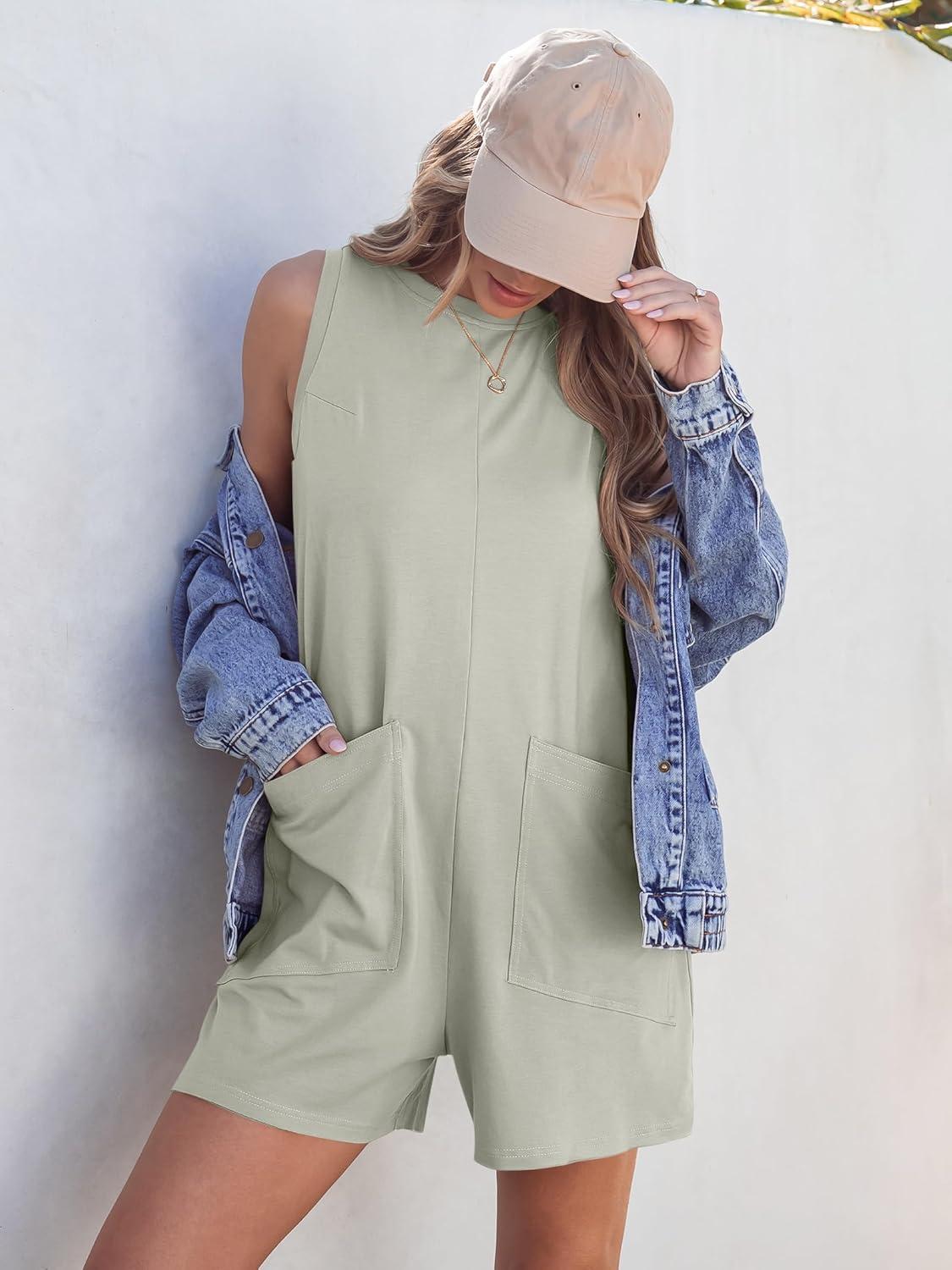 ANRABESS Womens Romper Casual Loose Sleeveless 2025 Summer One Piece Outfit Crewneck Short Jumpsuit Overall Outfits & Pockets(Light Green)