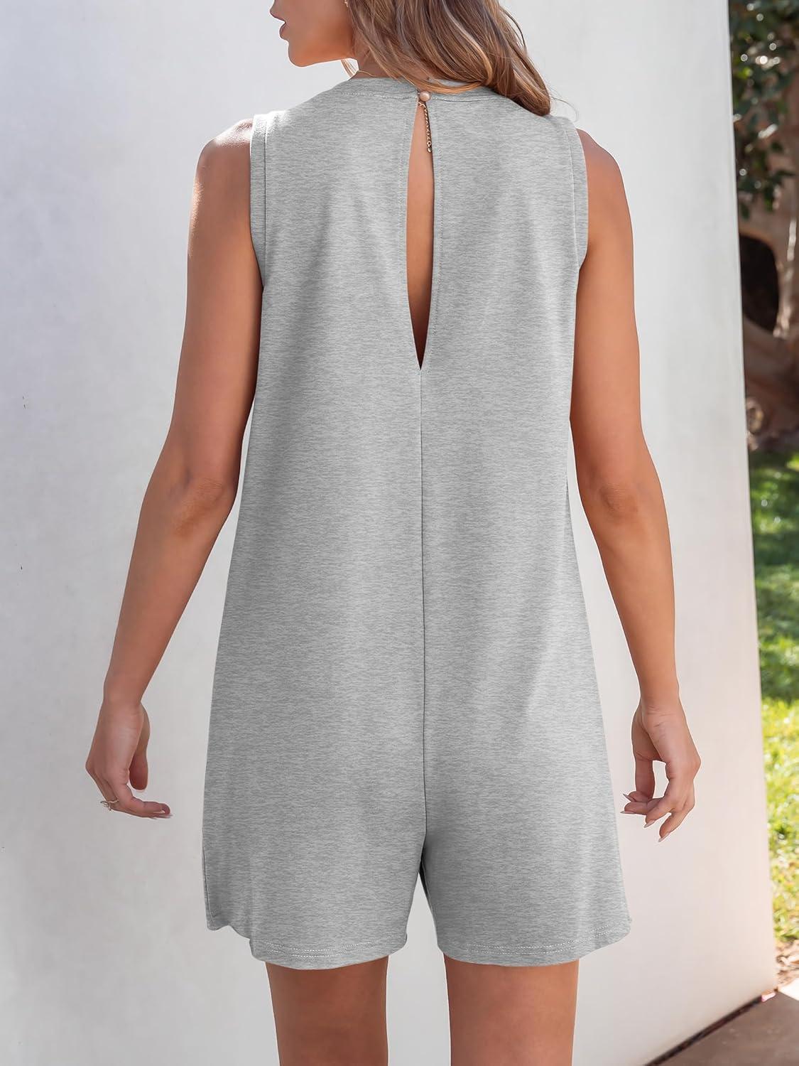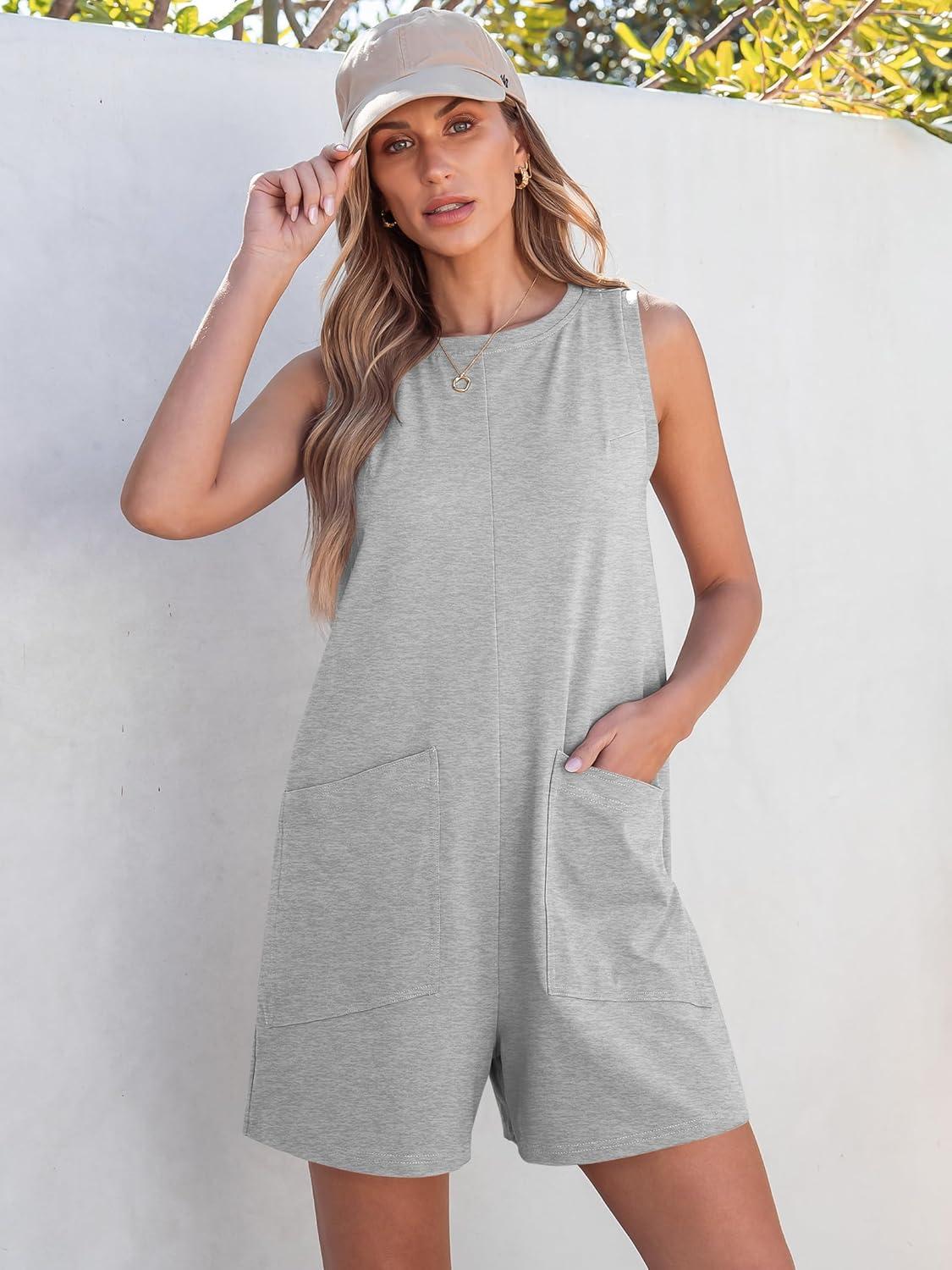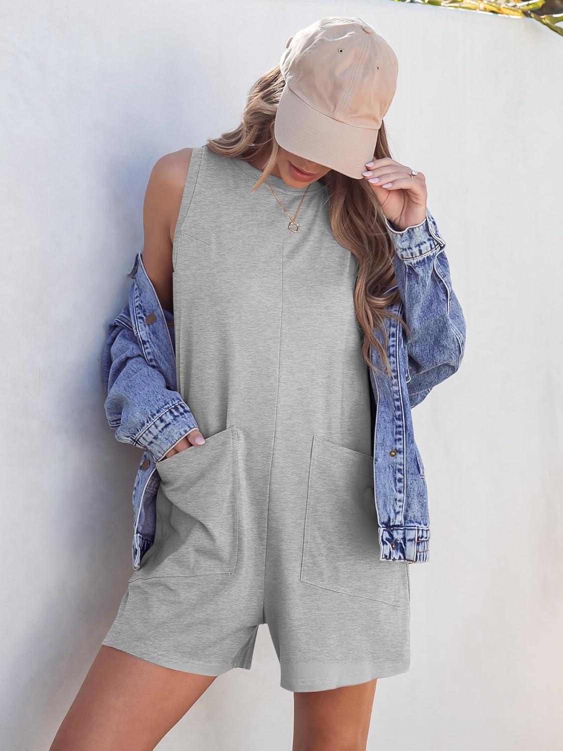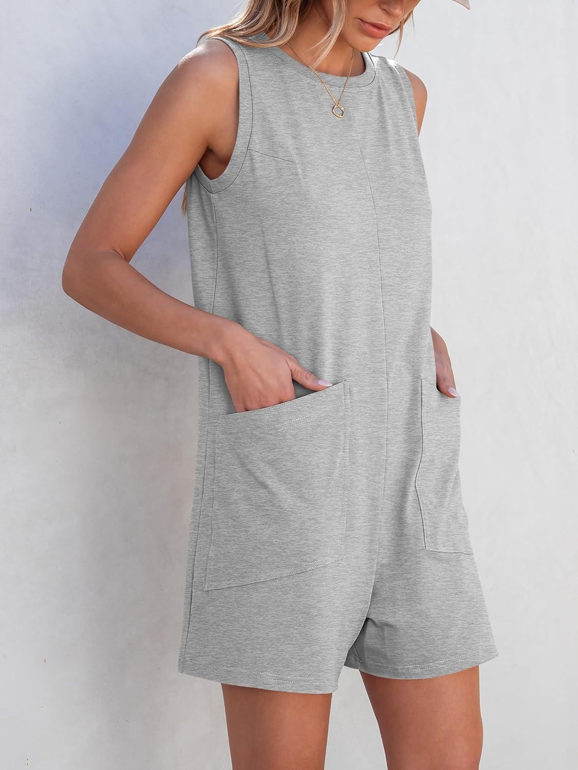 ANRABESS Womens Romper Casual Loose Sleeveless 2025 Summer One Piece Outfit Crewneck Short Jumpsuit Overall Outfits & Pockets(Light Grey)