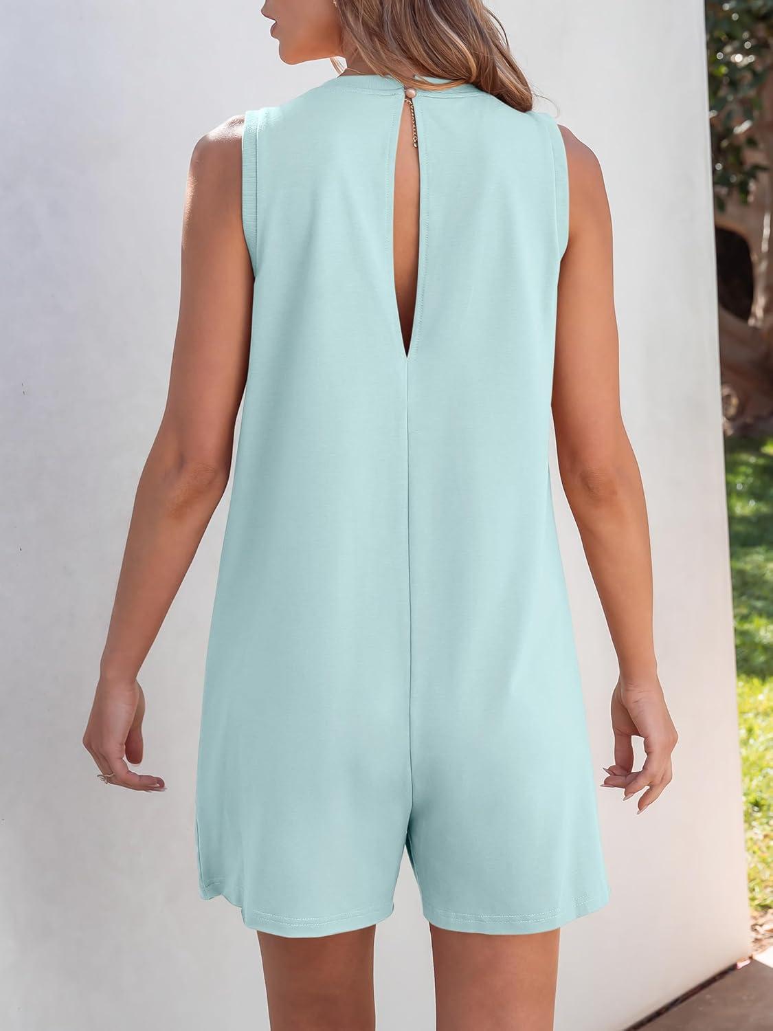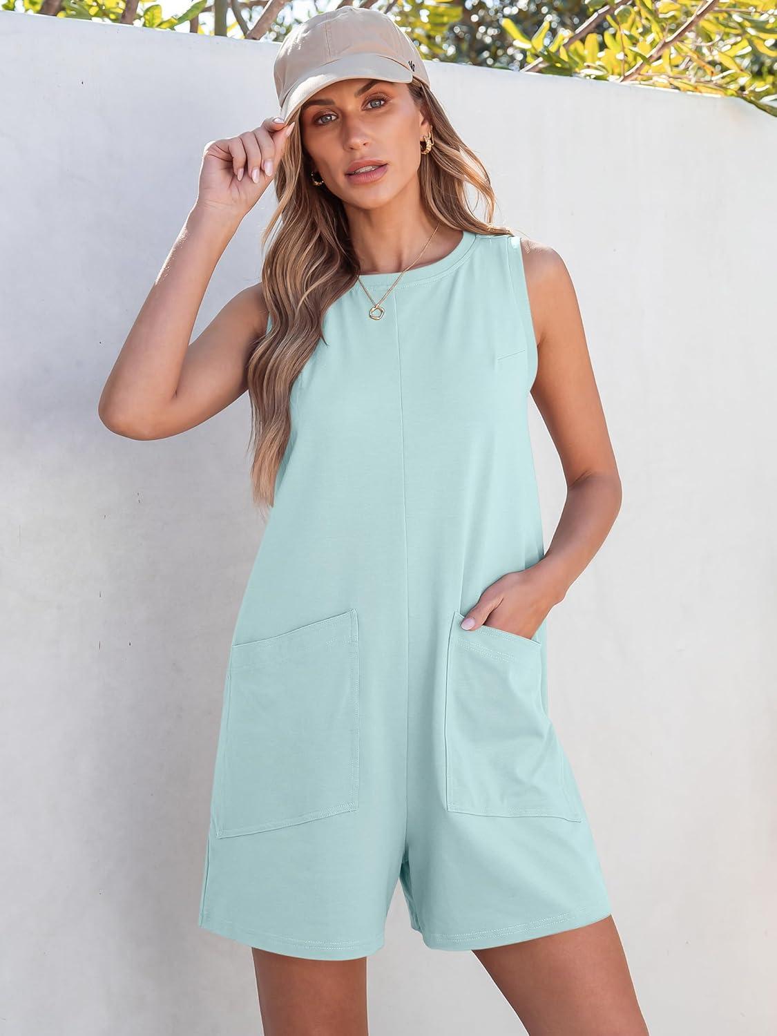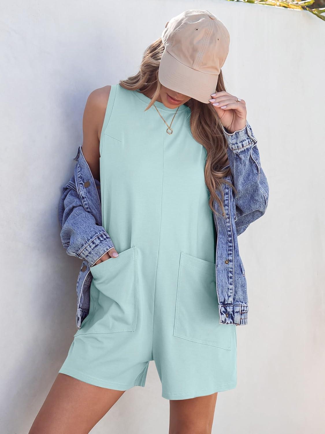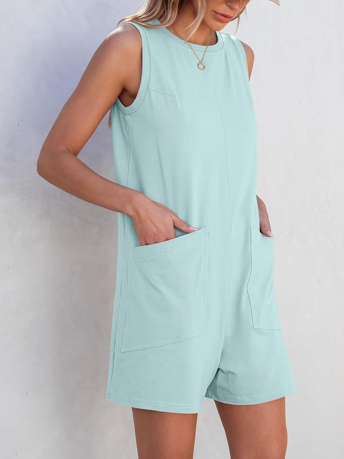 ANRABESS Womens Romper Casual Loose Sleeveless 2025 Summer One Piece Outfit Crewneck Short Jumpsuit Overall Outfits & Pockets(Mint Green)