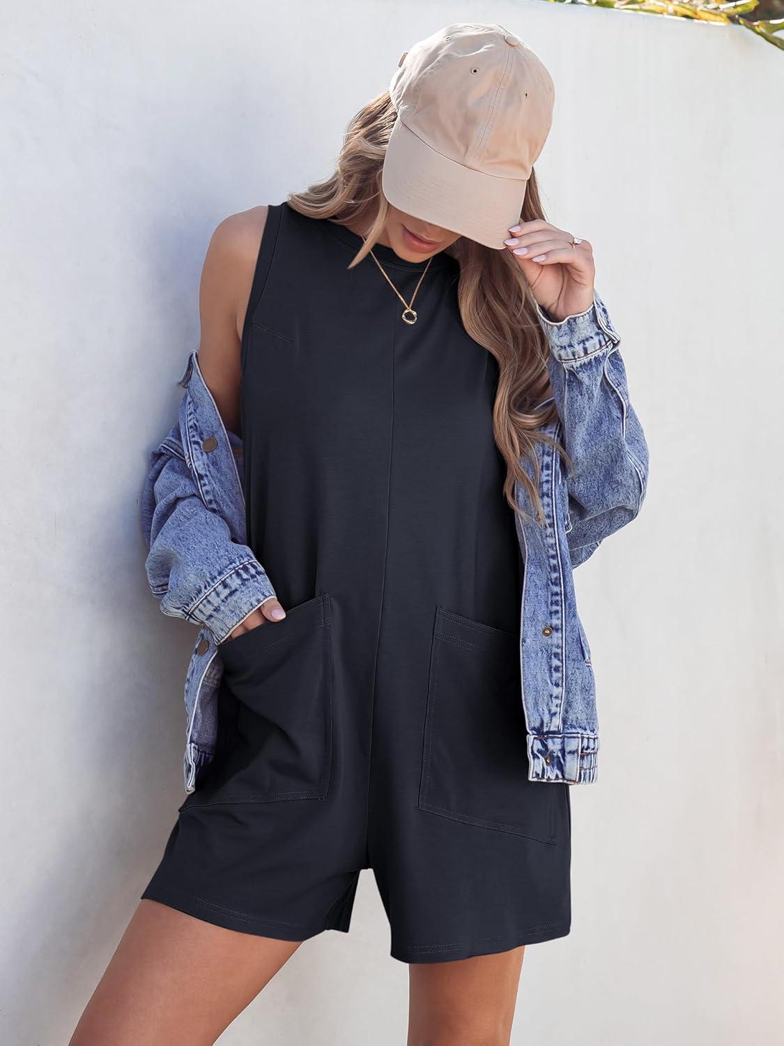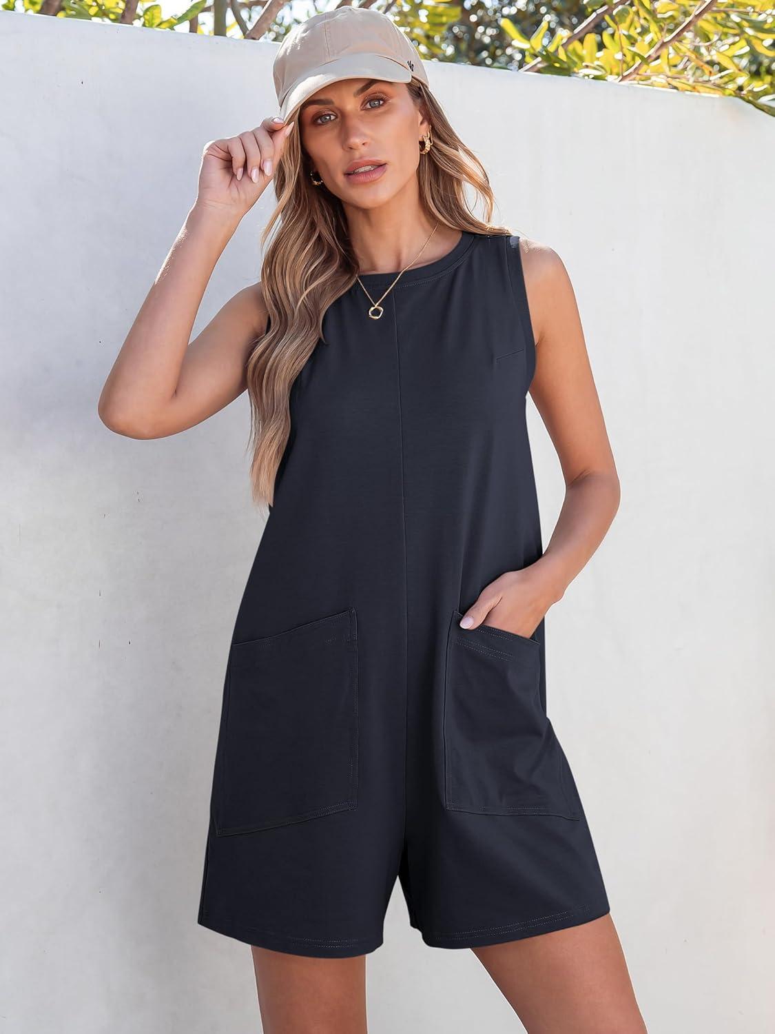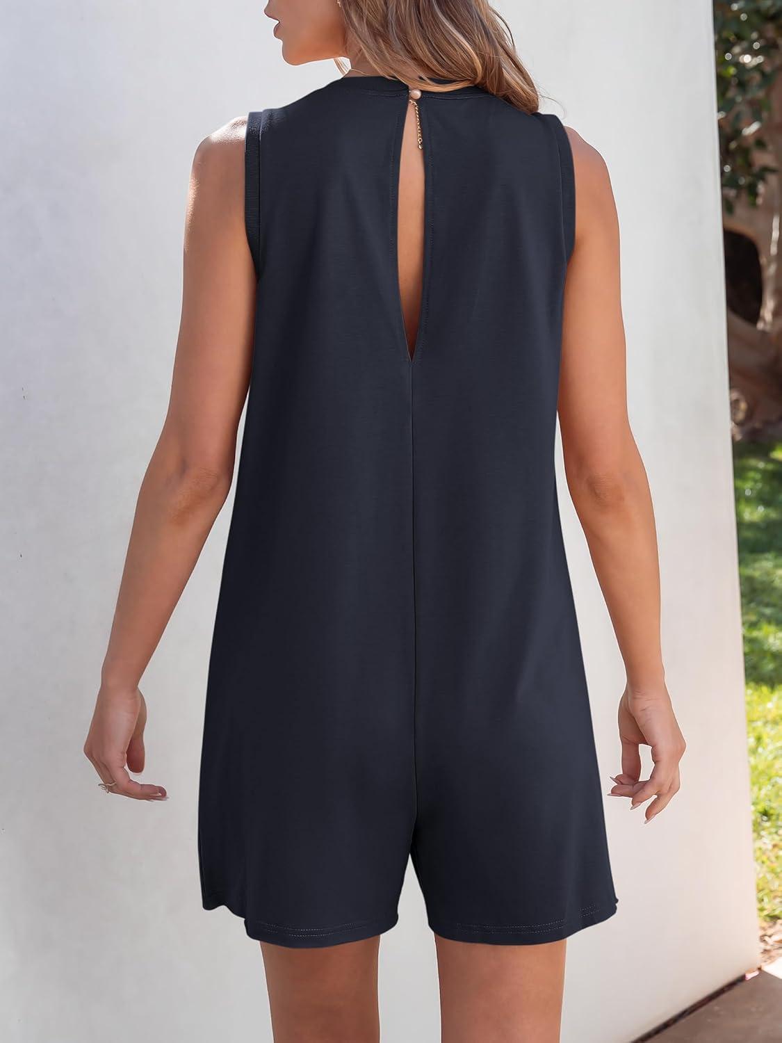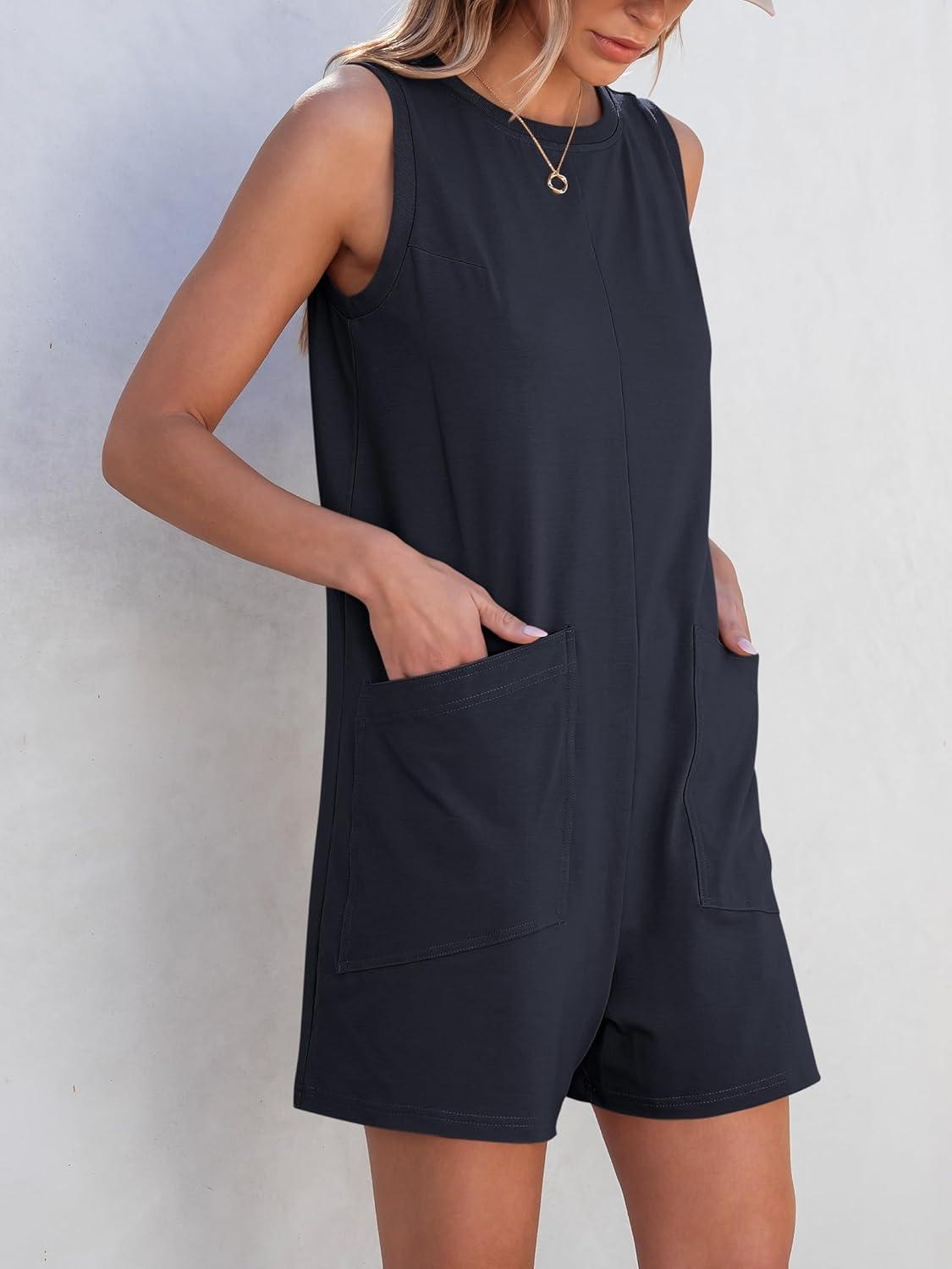 ANRABESS Womens Romper Casual Loose Sleeveless 2025 Summer One Piece Outfit Crewneck Short Jumpsuit Overall Outfits & Pockets(Navy Blue)