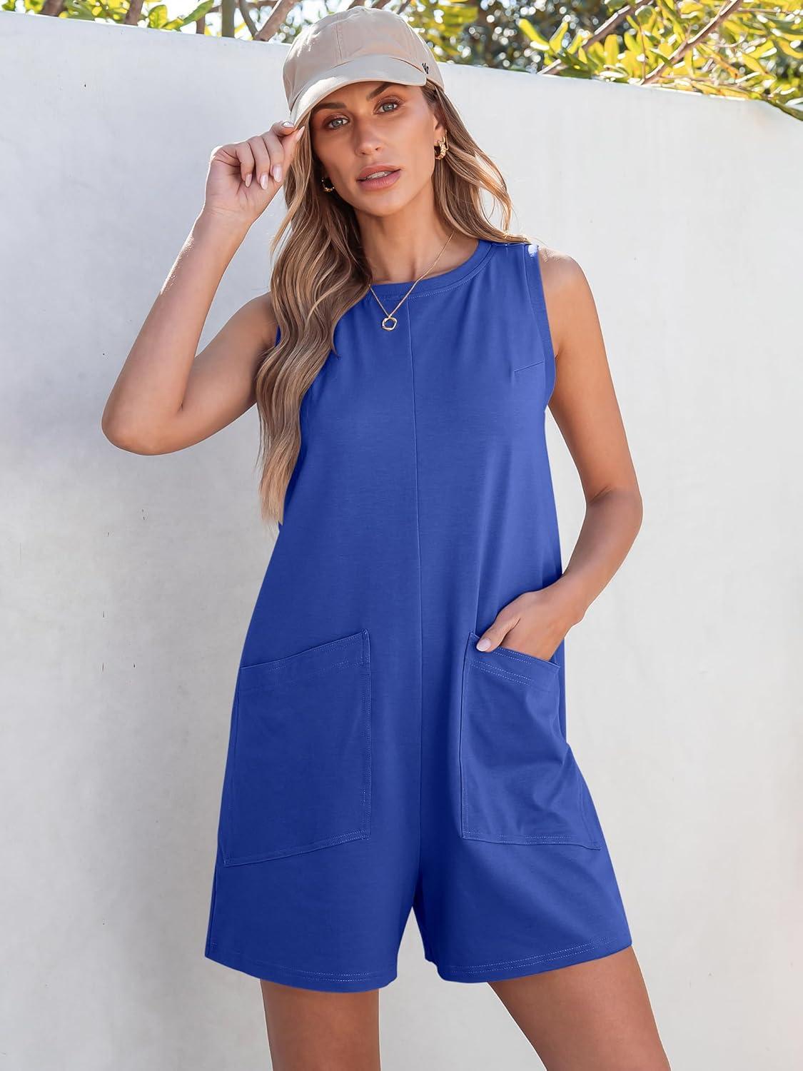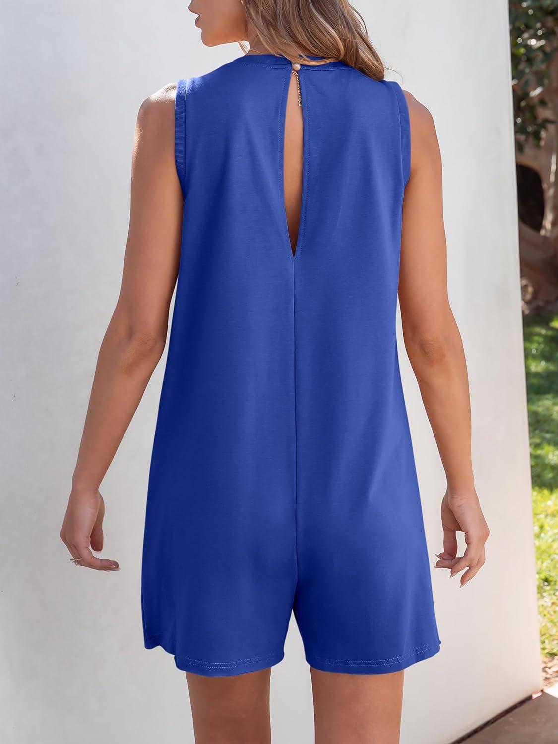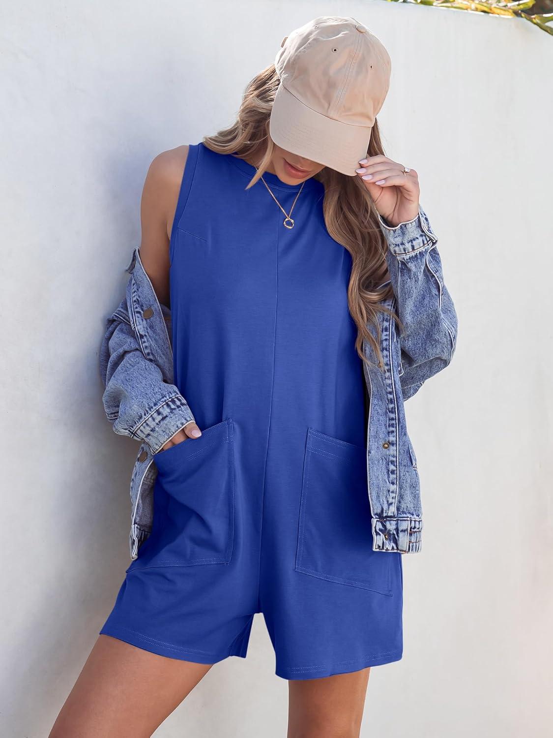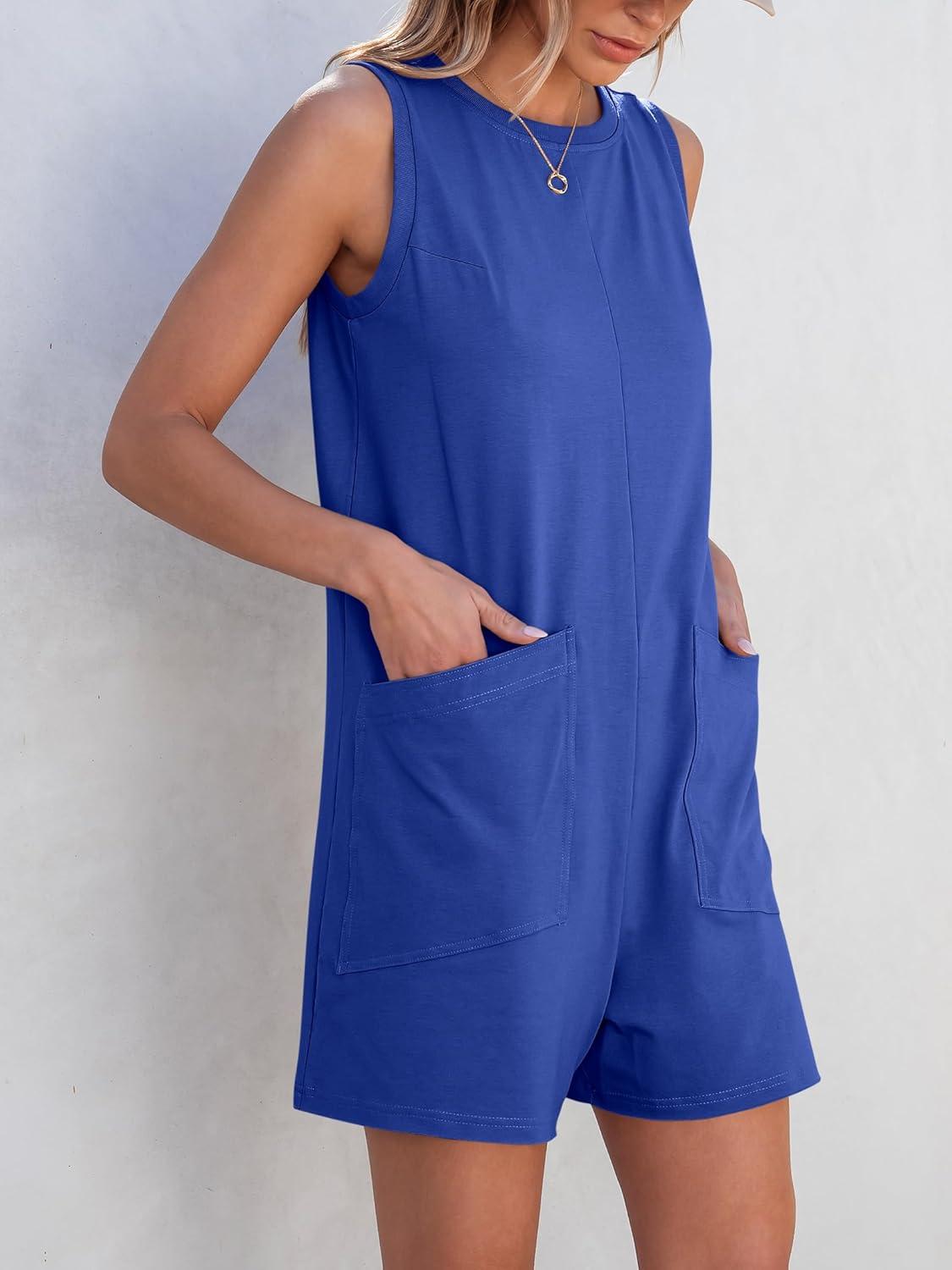 ANRABESS Womens Romper Casual Loose Sleeveless 2025 Summer One Piece Outfit Crewneck Short Jumpsuit Overall Outfits & Pockets(Royal Blue)