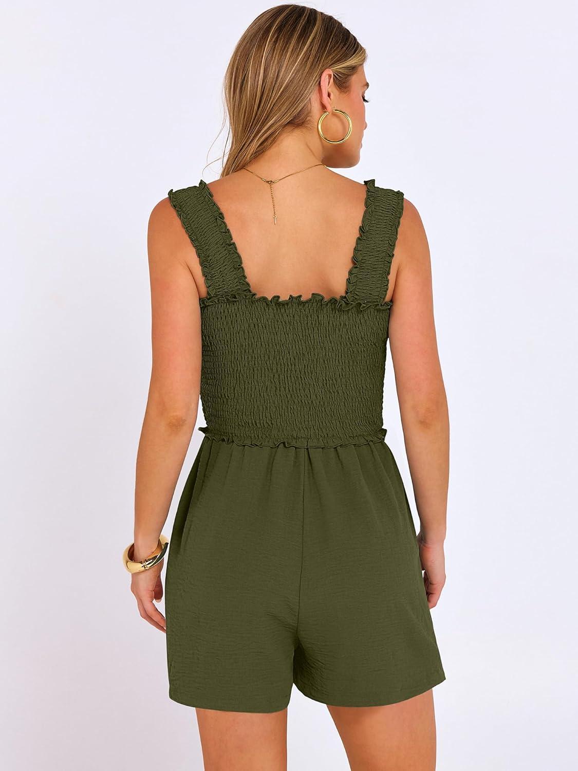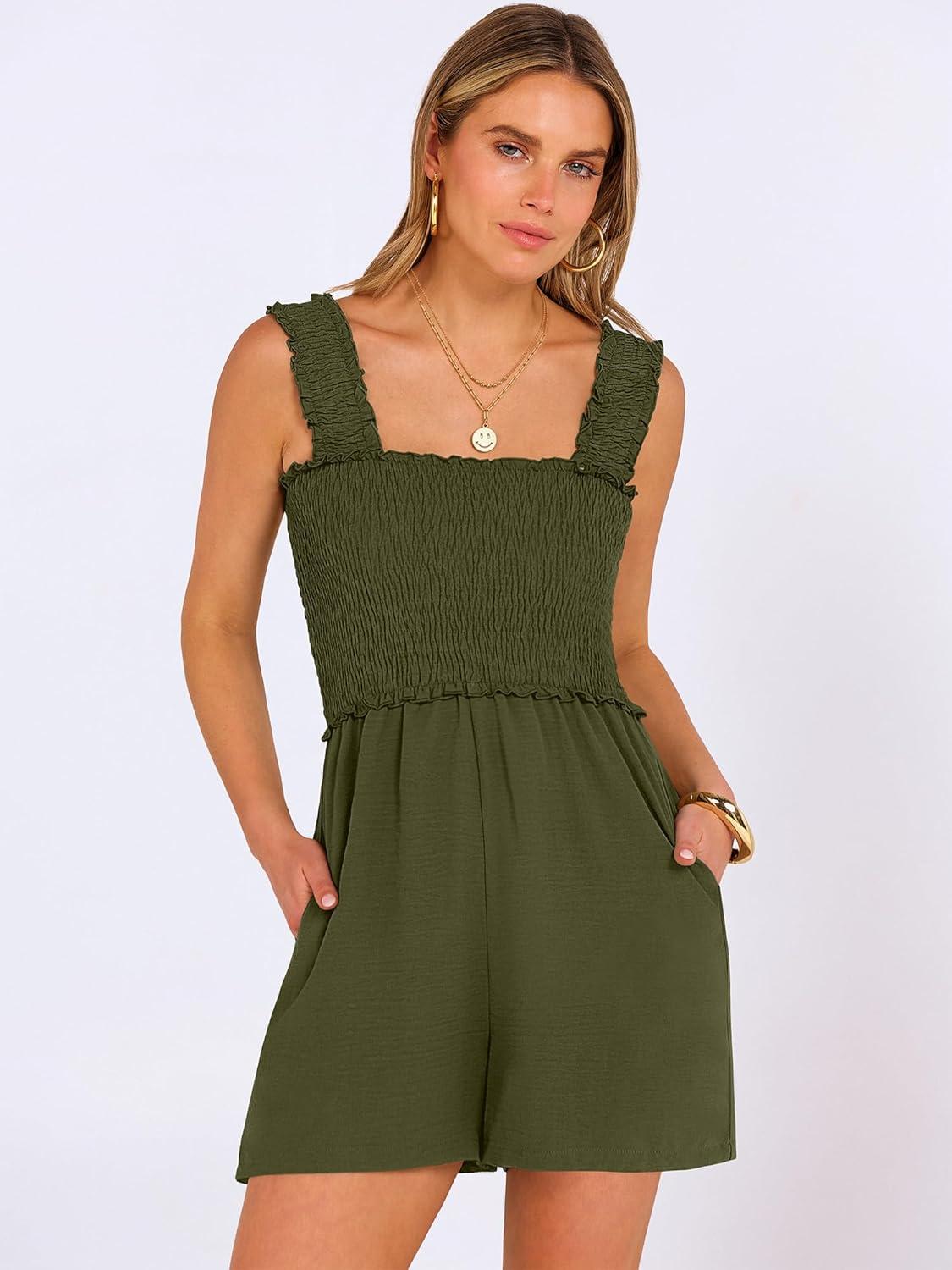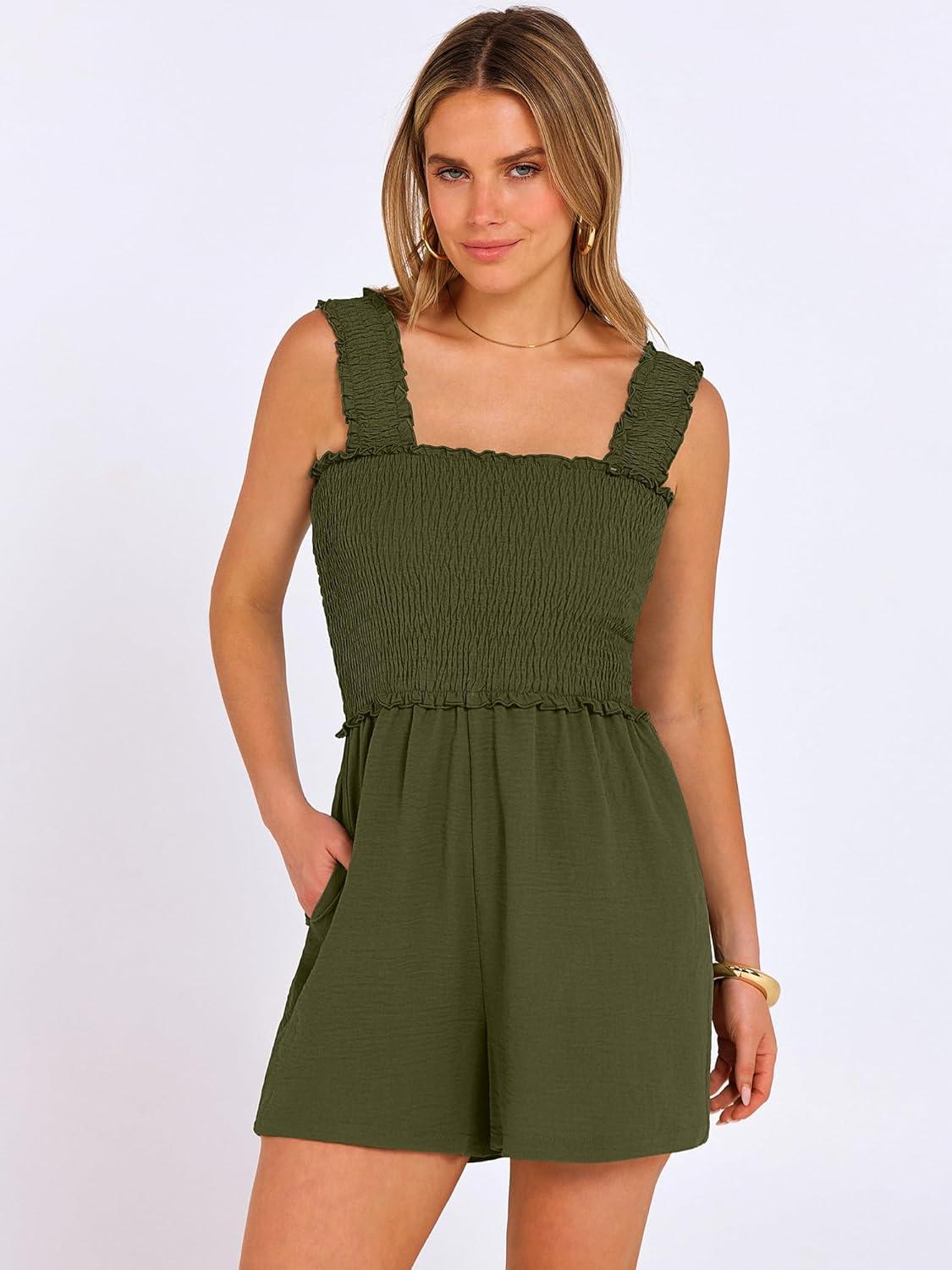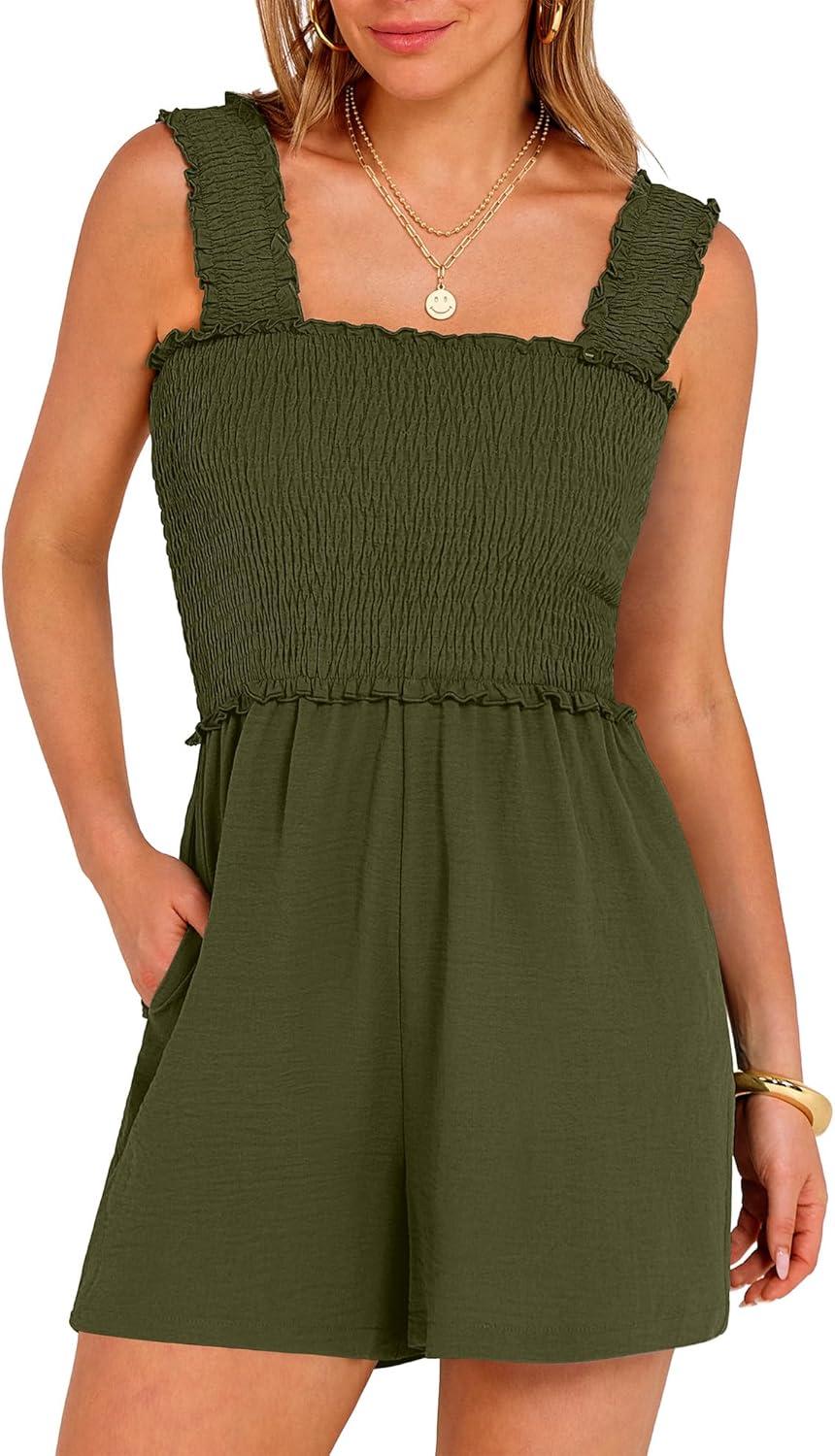 ANRABESS Women’s Rompers Summer Casual Smocked Square Neck Sleeveless Loose Shorts Jumpsuit 2026 Beach Vacation Clothes(Army Green)