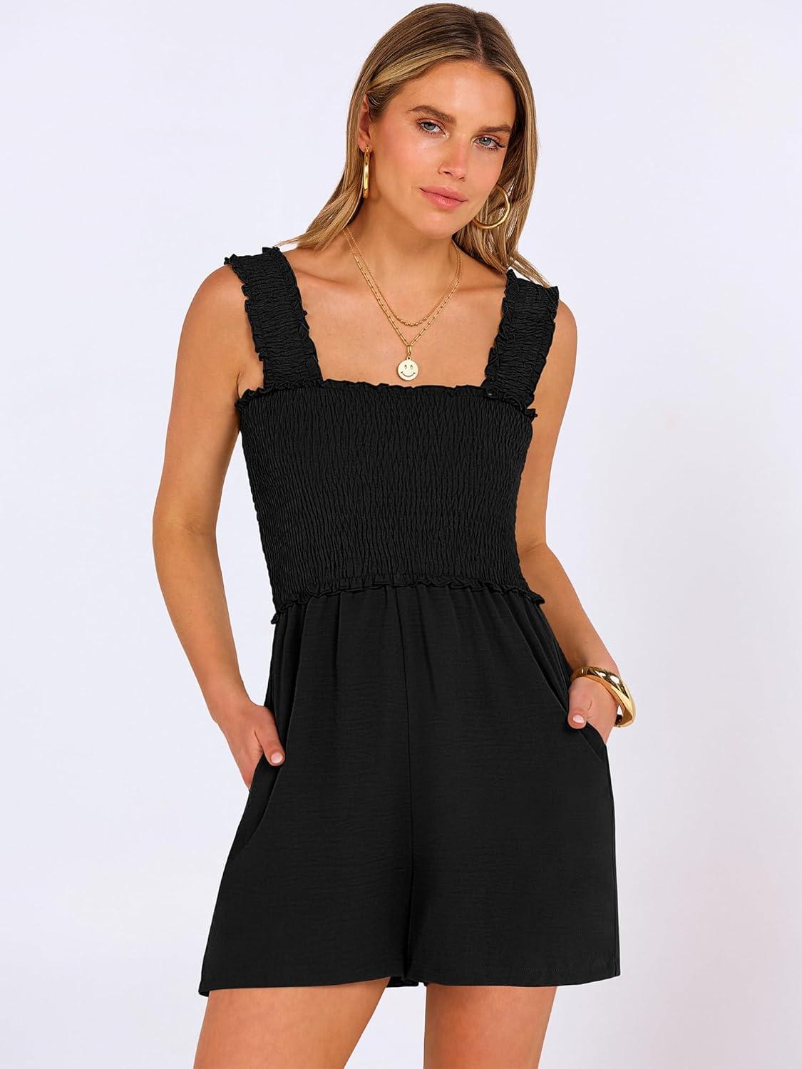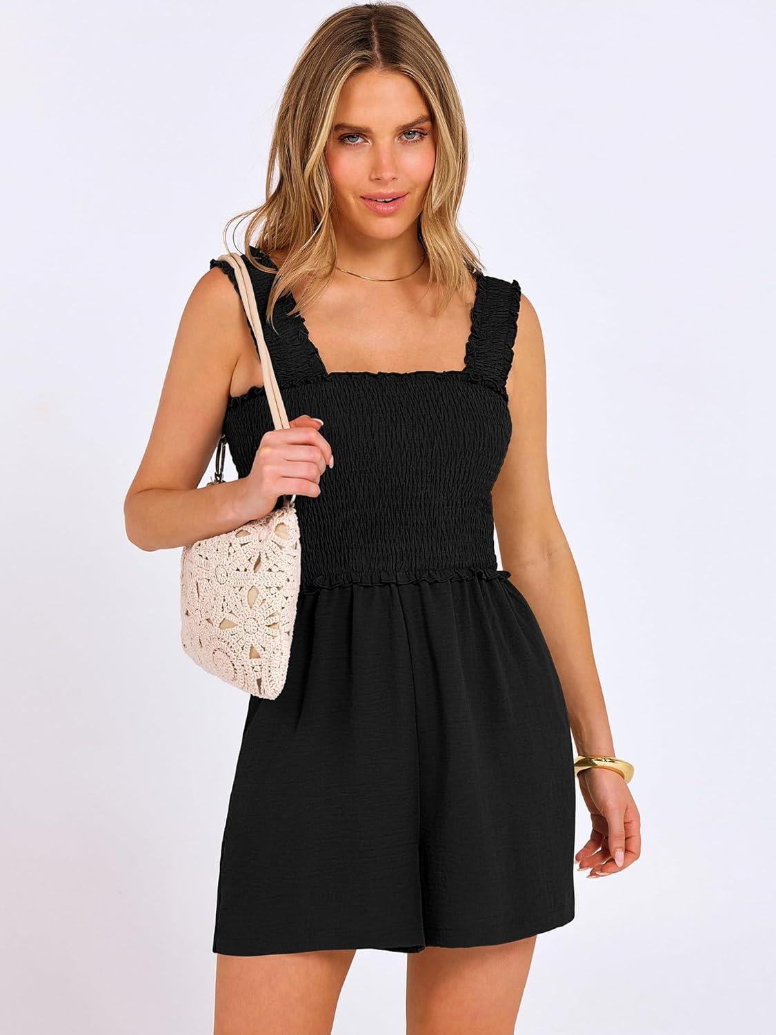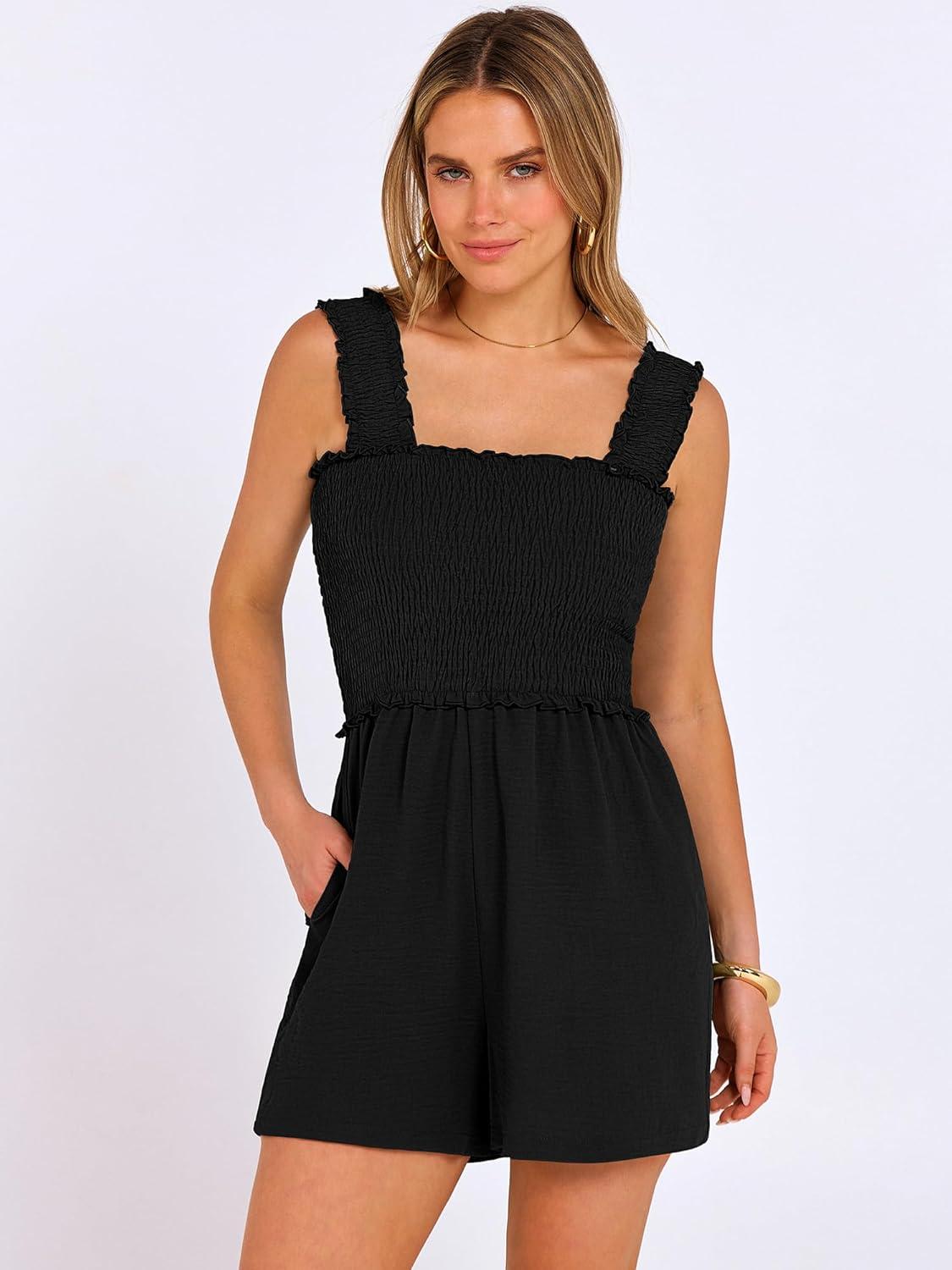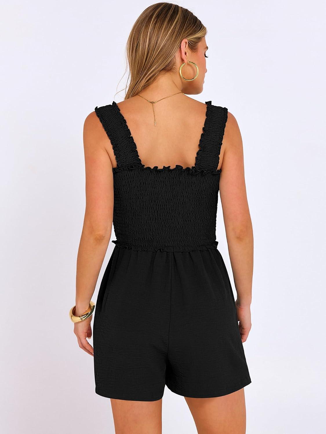 ANRABESS Women’s Rompers Summer Casual Smocked Square Neck Sleeveless Loose Shorts Jumpsuit 2026 Beach Vacation Clothes(Black)