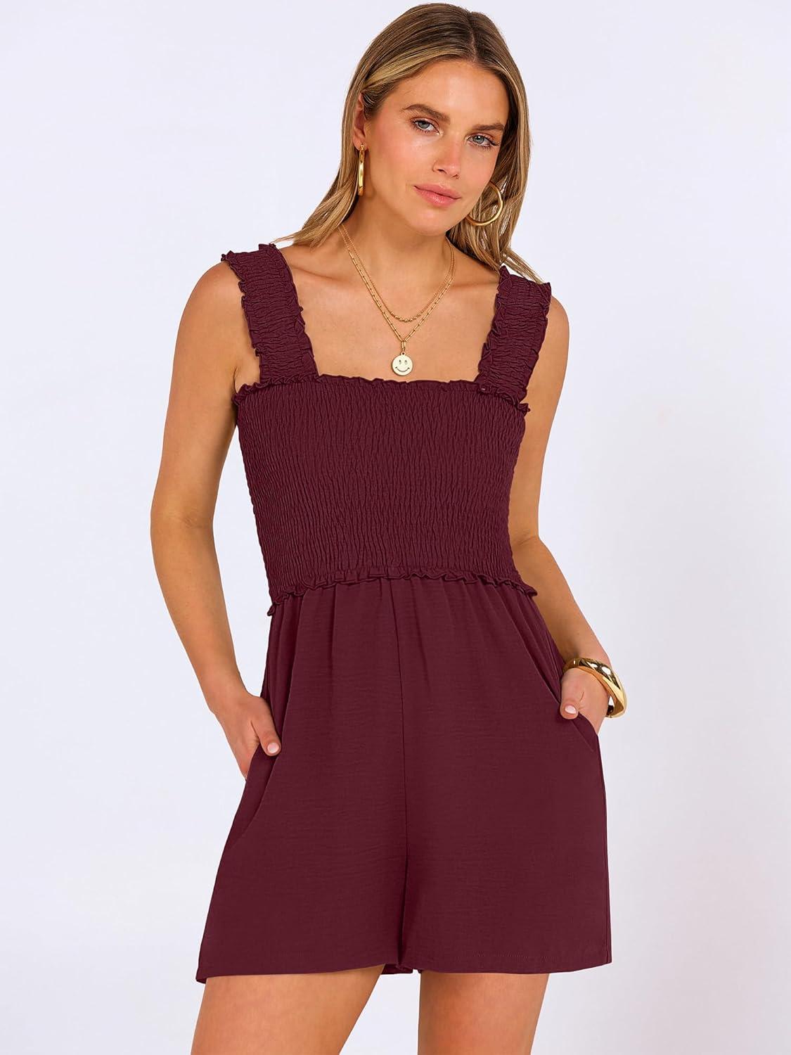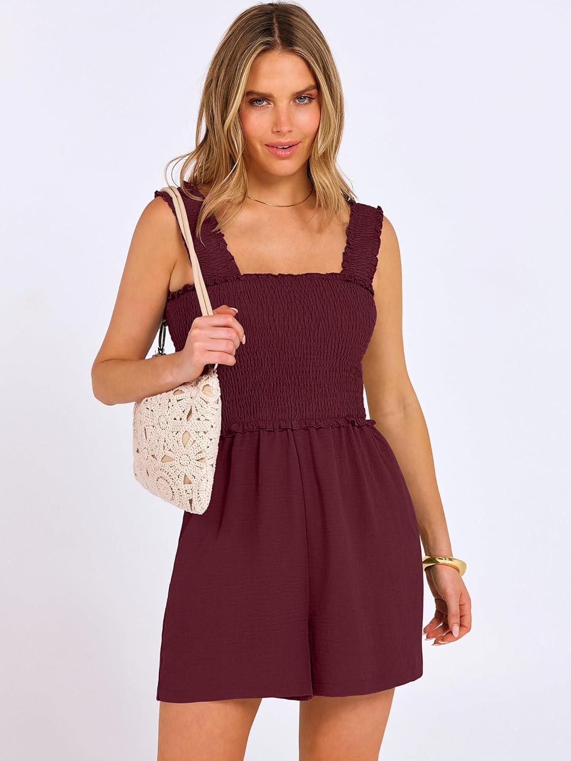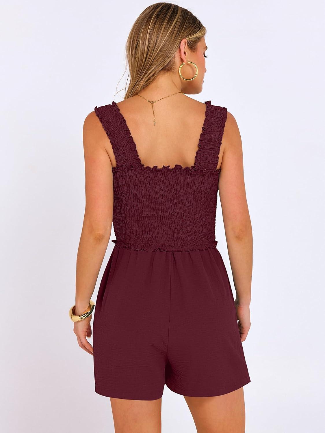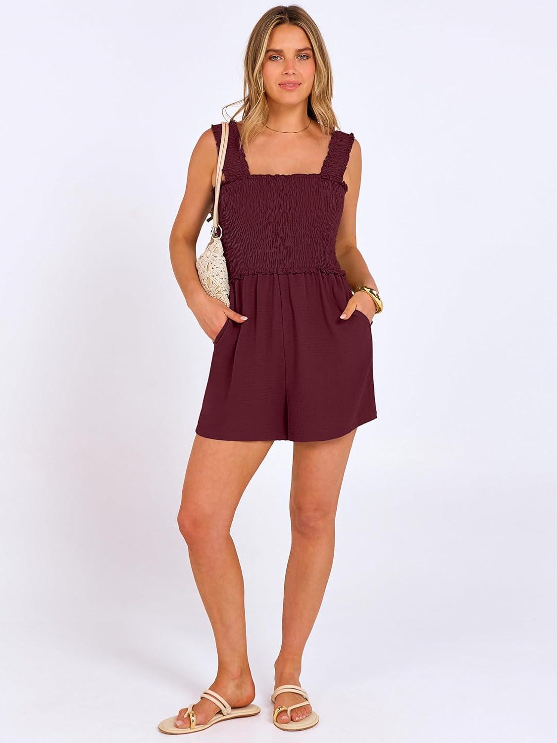 imageANRABESS Womens Rompers Summer Casual Smocked Square Neck Sleeveless Loose Shorts Jumpsuit 2026 Beach Vacation ClothesWine Red