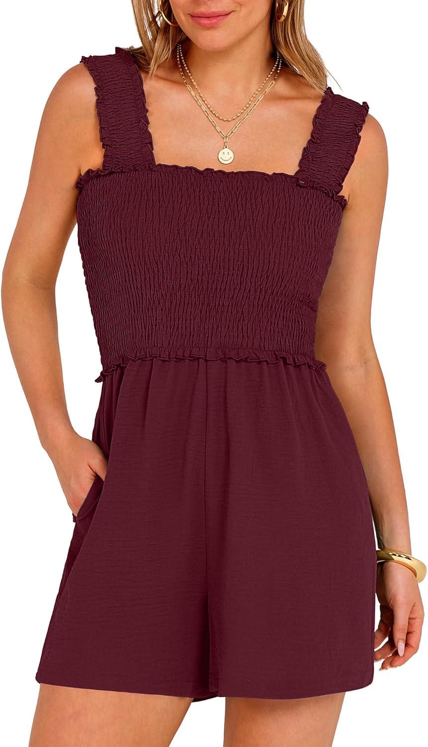 ANRABESS Women's Rompers Summer Casual Smocked Square Neck Sleeveless Loose Shorts Jumpsuit 2026 Beach Vacation Clothes(Wine Red)