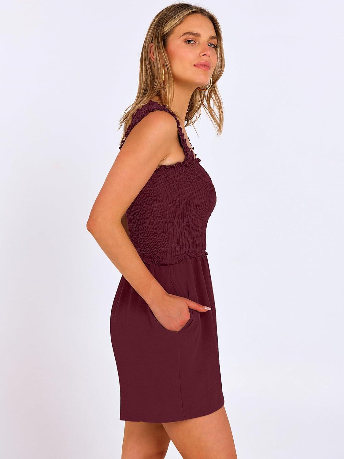 ANRABESS Women’s Rompers Summer Casual Smocked Square Neck Sleeveless Loose Shorts Jumpsuit 2026 Beach Vacation Clothes(Wine Red)