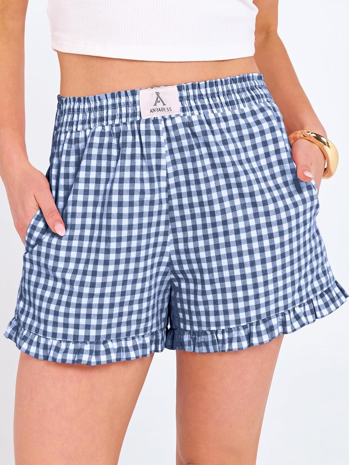 ANRABESS Womens Ruffle Boxer Shorts Pajama Gingham Shorts Summer Casual Lounge Sleep Plaid Beach Bottoms Pockets 2026 Trendy(Blue White Plaid)