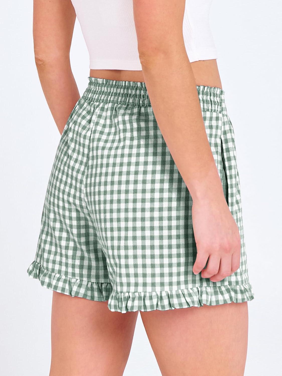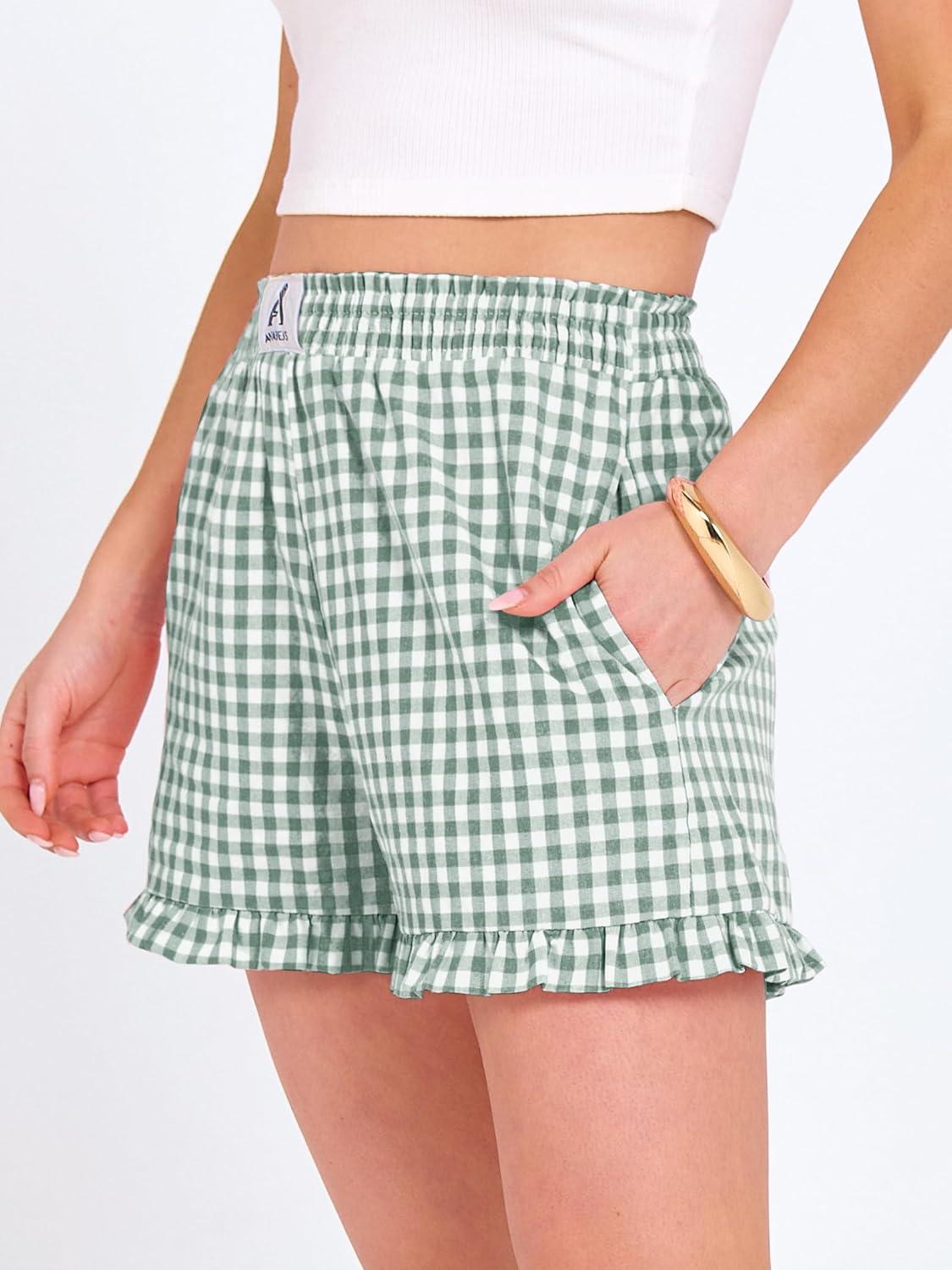 ANRABESS Womens Ruffle Boxer Shorts Pajama Gingham Shorts Summer Casual Lounge Sleep Plaid Beach Bottoms Pockets 2026 Trendy(Green White Plaid)