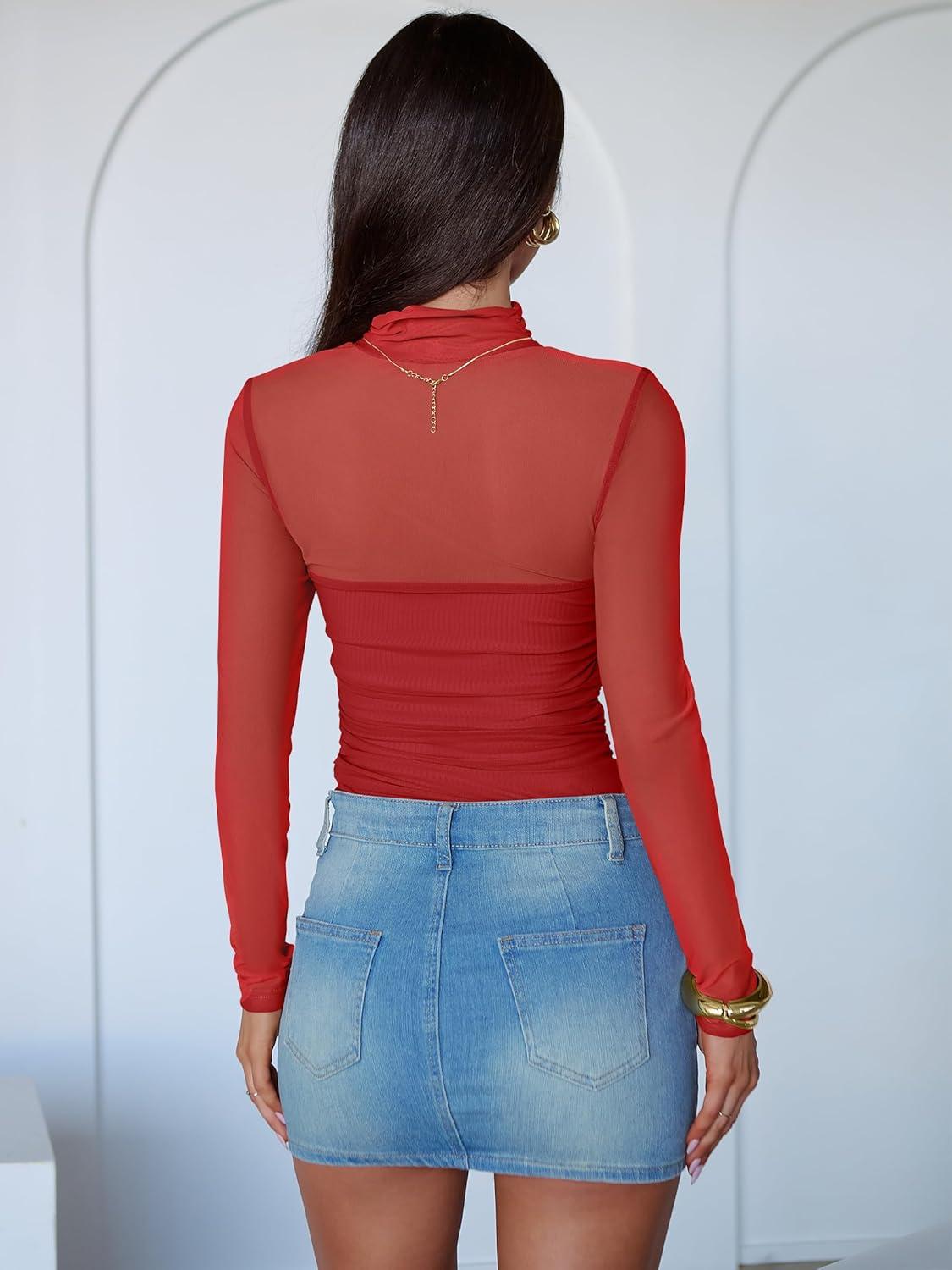 ANRABESS Womens Sexy Mesh Long Sleeve Shirts Trendy Mock Neck Sheer Ruched Going Out Tops Fall Slim Fit Blouses 2025(Red)