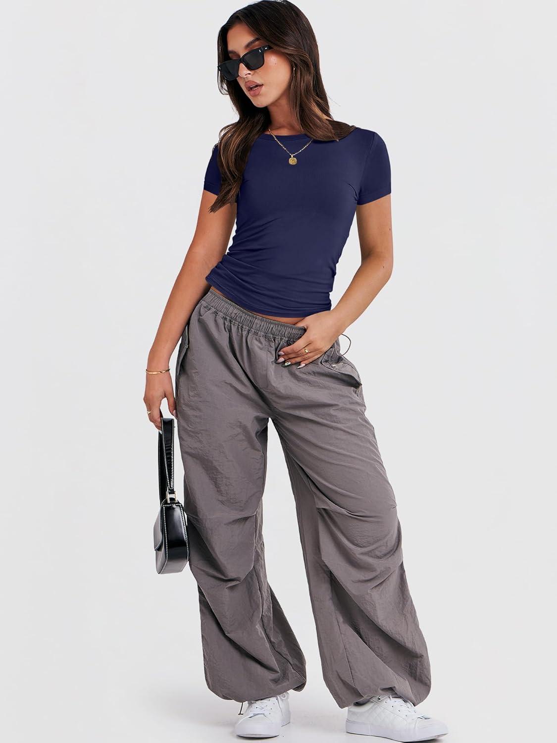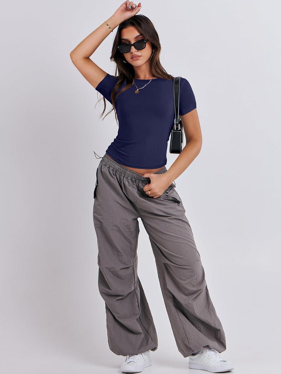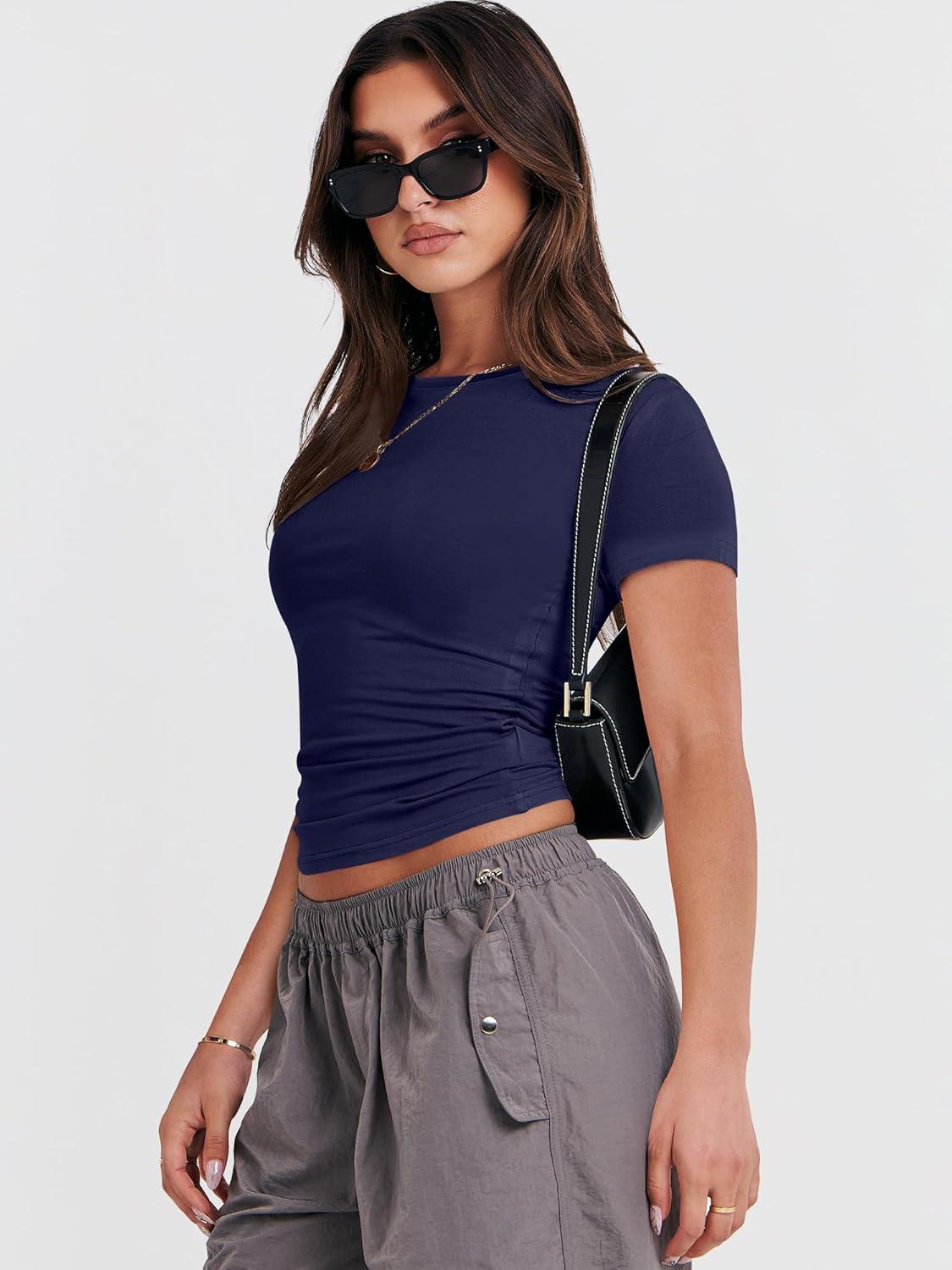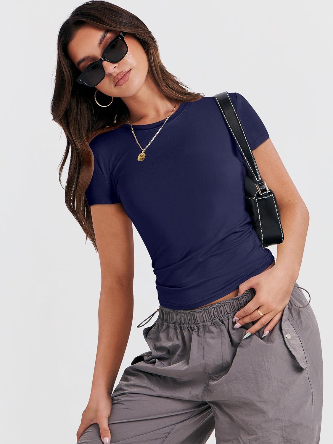 ANRABESS Women’s Short Sleeve Summer T Shirts Crew Neck Slim Fit Basic Tees 2025 Crop Tops Y2k Clothes Outfits(Dark Blue)
