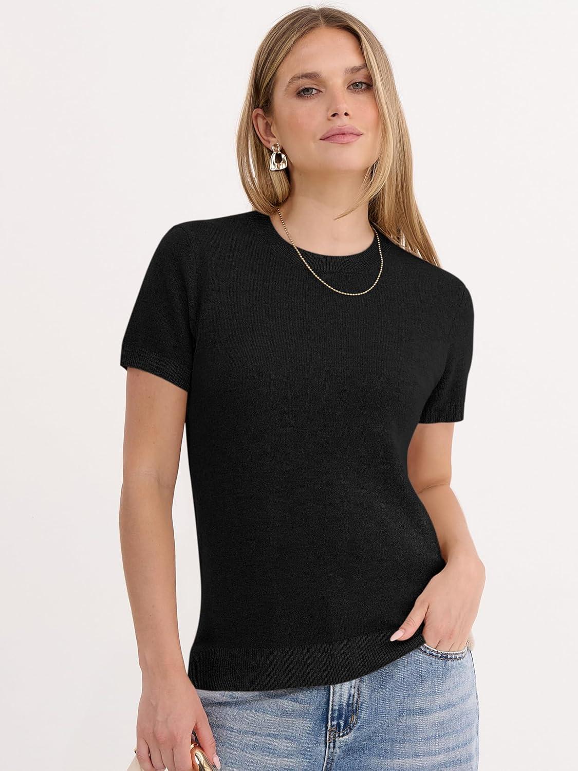 ANRABESS Women’s Short Sleeve Sweater,100% Wool Sweaters Top,Casual for Work Office,Versatile for Summer Spring Early Fall(Black)