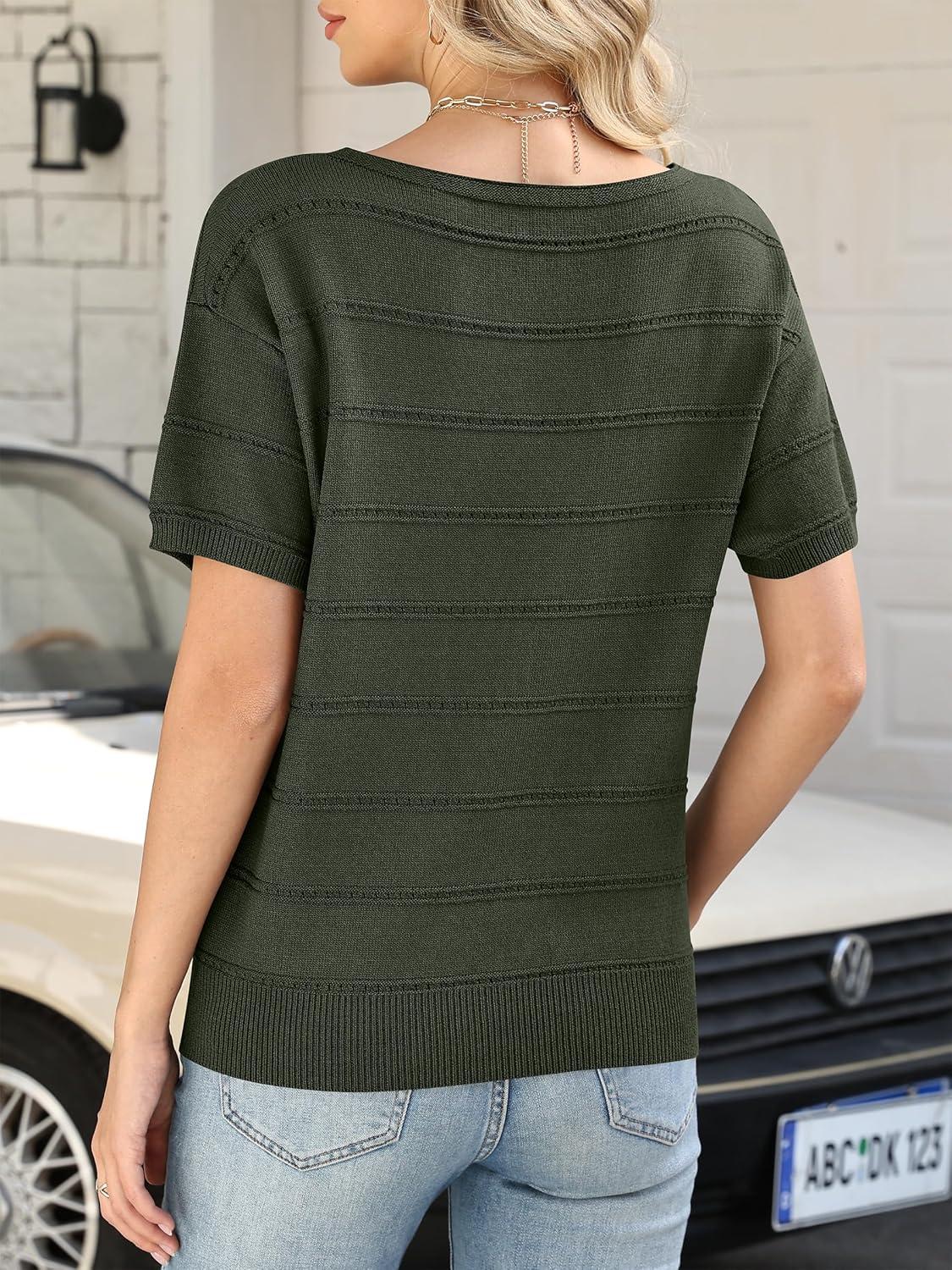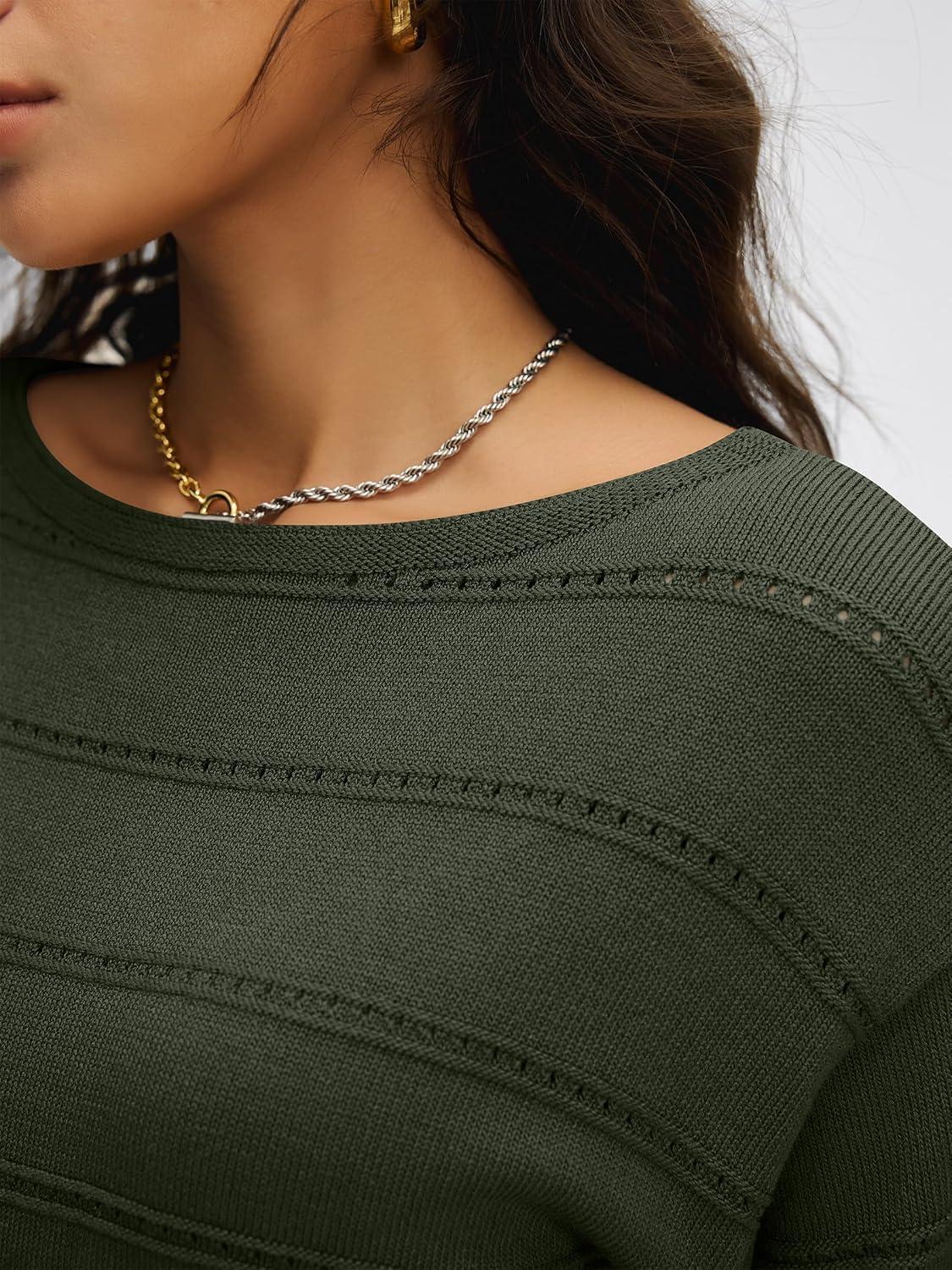 ANRABESS Womens Short Sleeve Sweater Crochet Boat Neck Lightweight Business Casual Tops 2026 Summer Beach Vacation Clothes(Army Green)