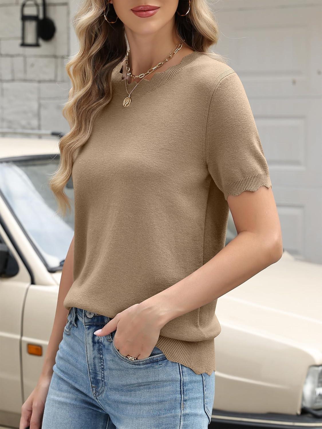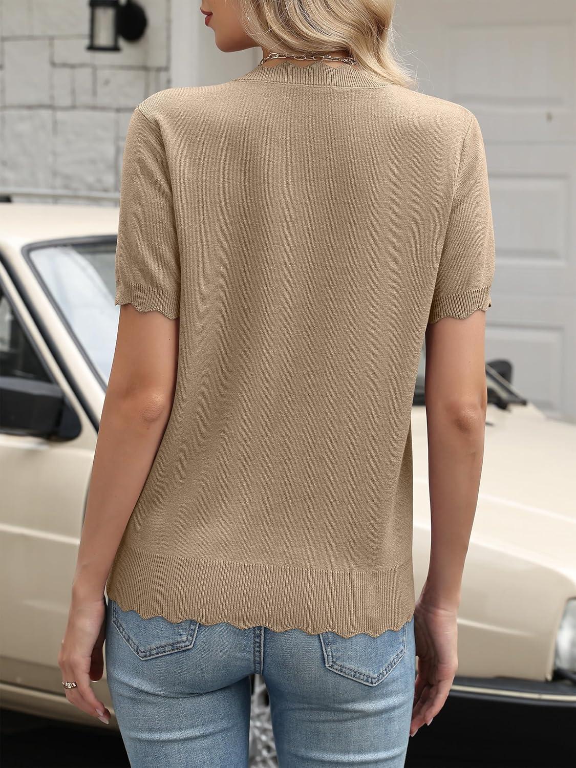 ANRABESS Womens Short Sleeve Sweater Wool Blend Scalloped Cute Summer Dressy Tops Business Casual Loose Vacation Outfits 2026(Khaki)