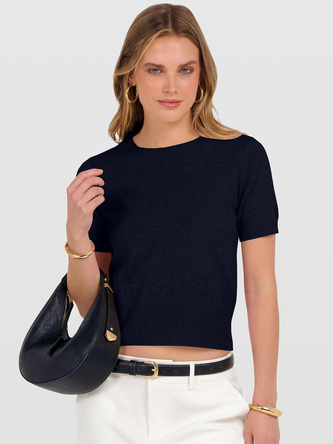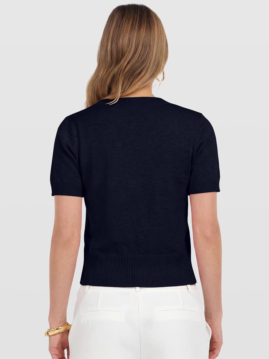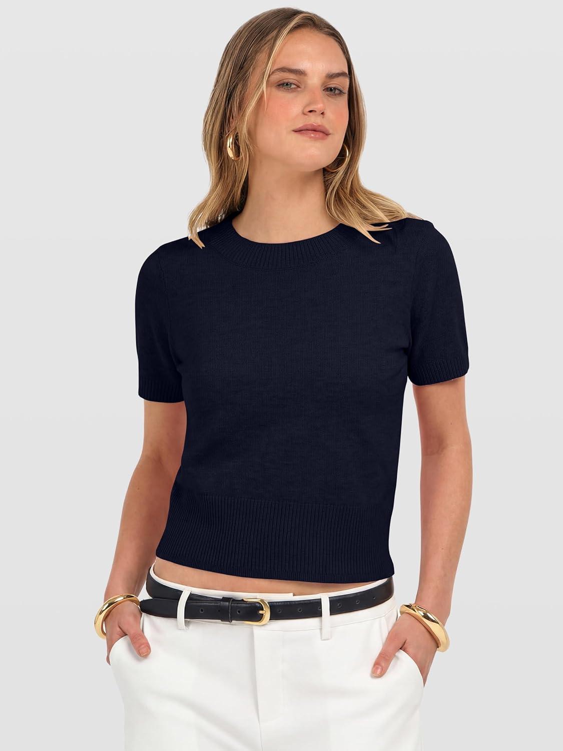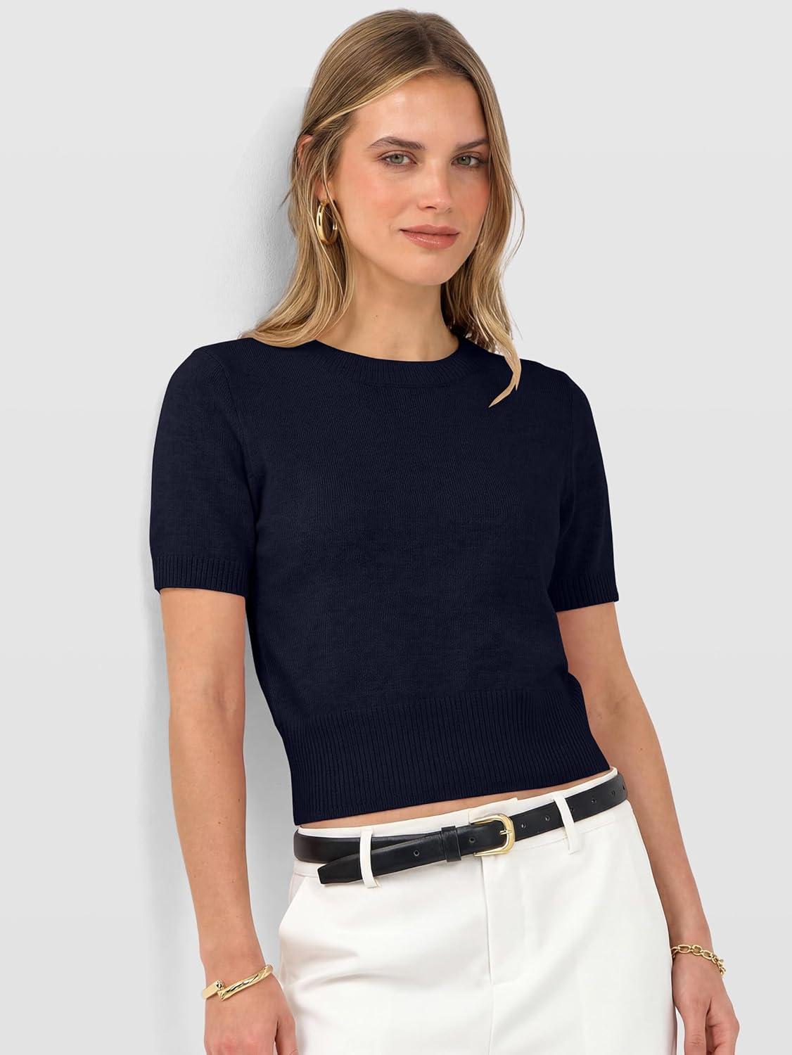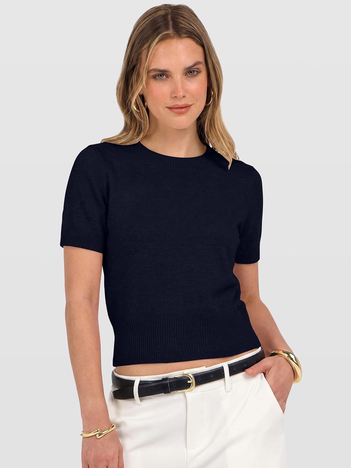 ANRABESS Womens Short Sleeve Sweaters Cropped Crew Neck Business Casual Lightweight Sweater Tops 2026 Spring Summer Outfits(Navy Blue)