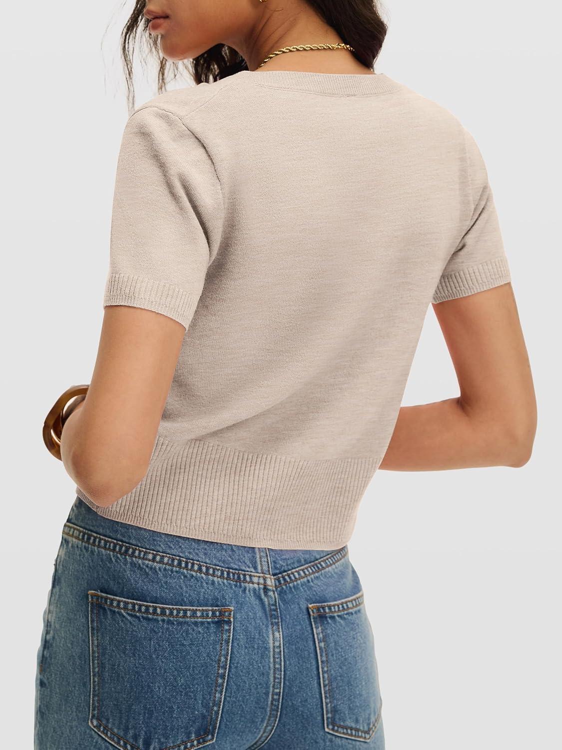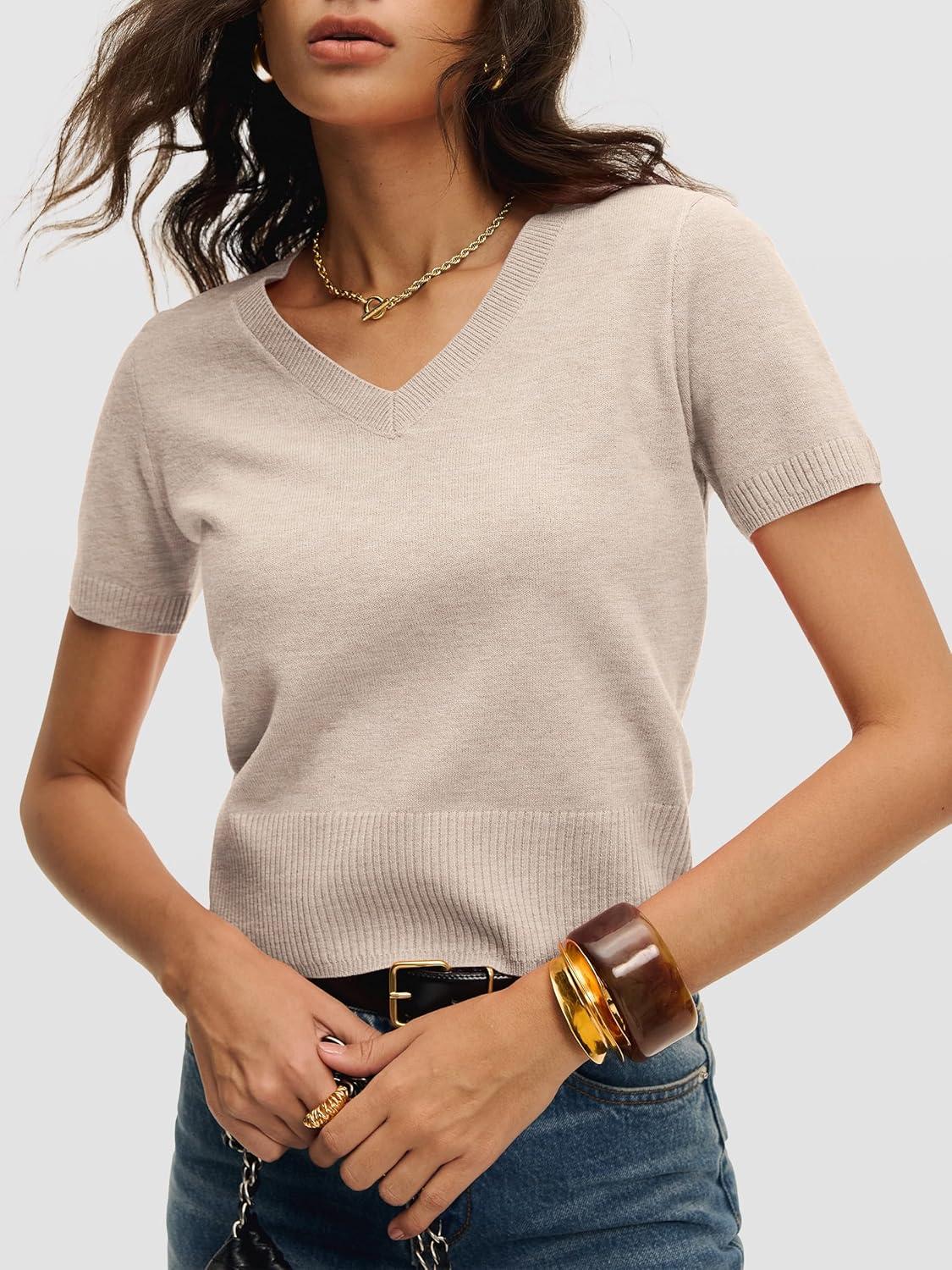 imageANRABESS Womens Short Sleeve Sweaters Cropped V Neck Business Casual Lightweight Sweater Tops Summer Spring Clothes 2026Almond