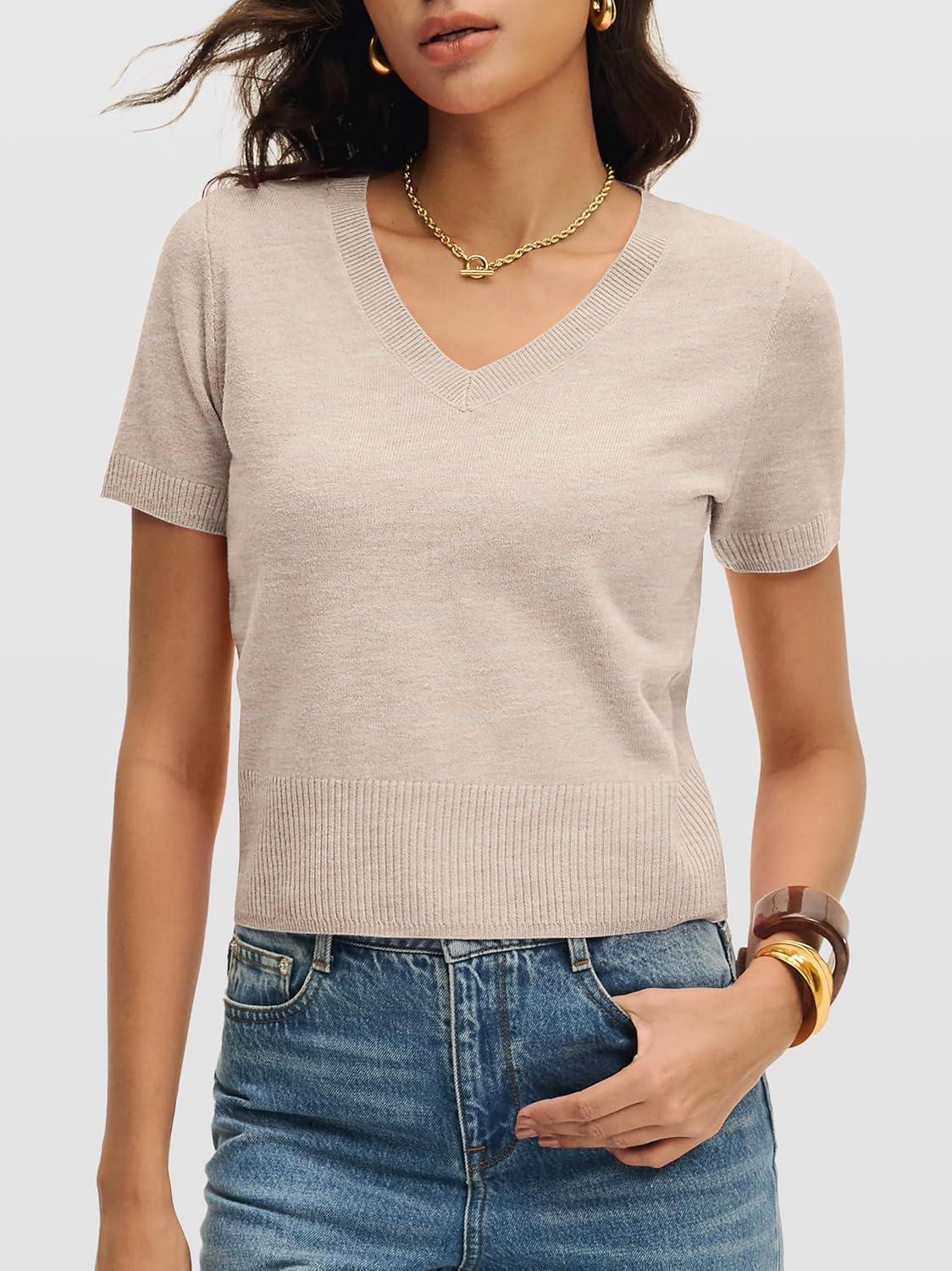 ANRABESS Womens Short Sleeve Sweaters Cropped V Neck Business Casual Lightweight Sweater Tops Summer Spring Clothes 2026(Almond)