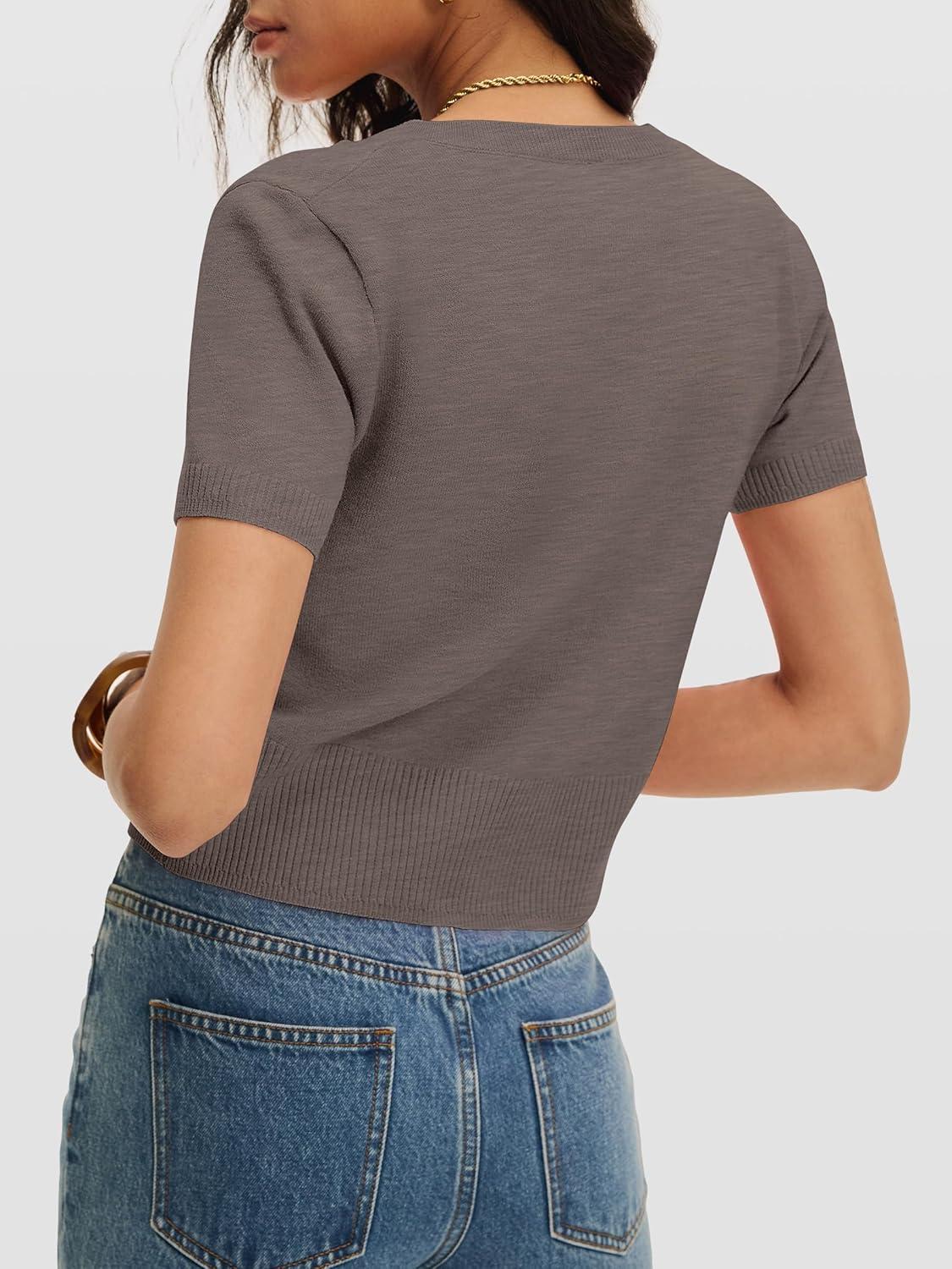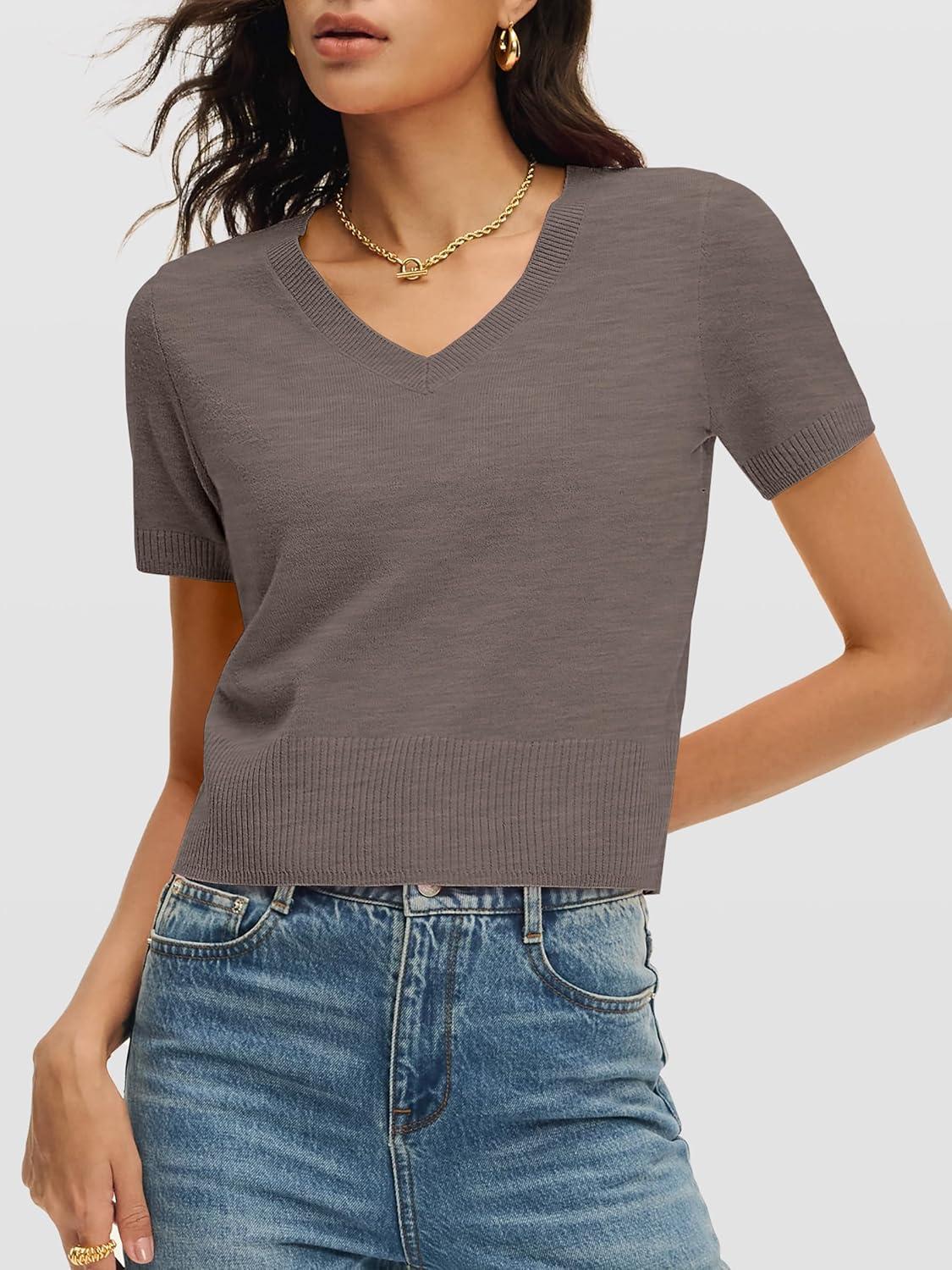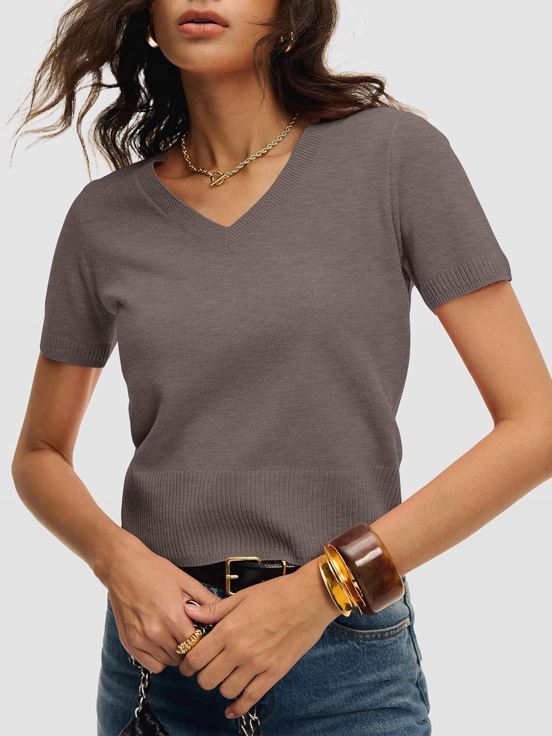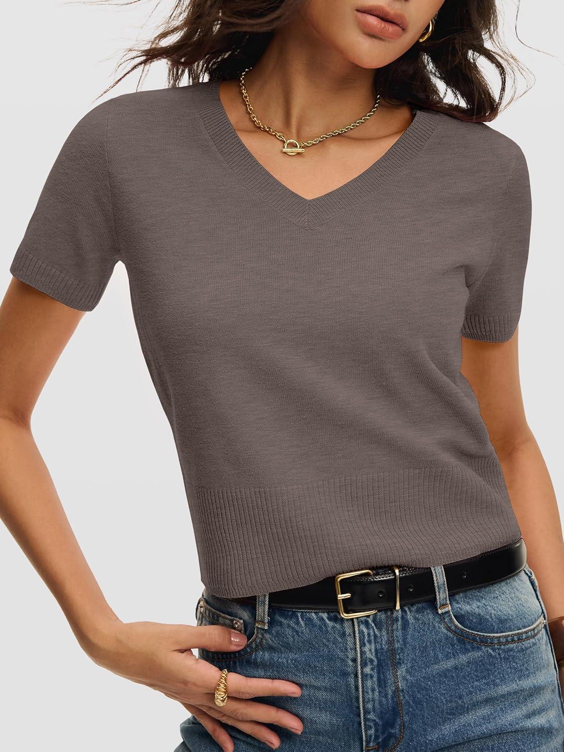 imageANRABESS Womens Short Sleeve Sweaters Cropped V Neck Business Casual Lightweight Sweater Tops Summer Spring Clothes 2026Light Coffee