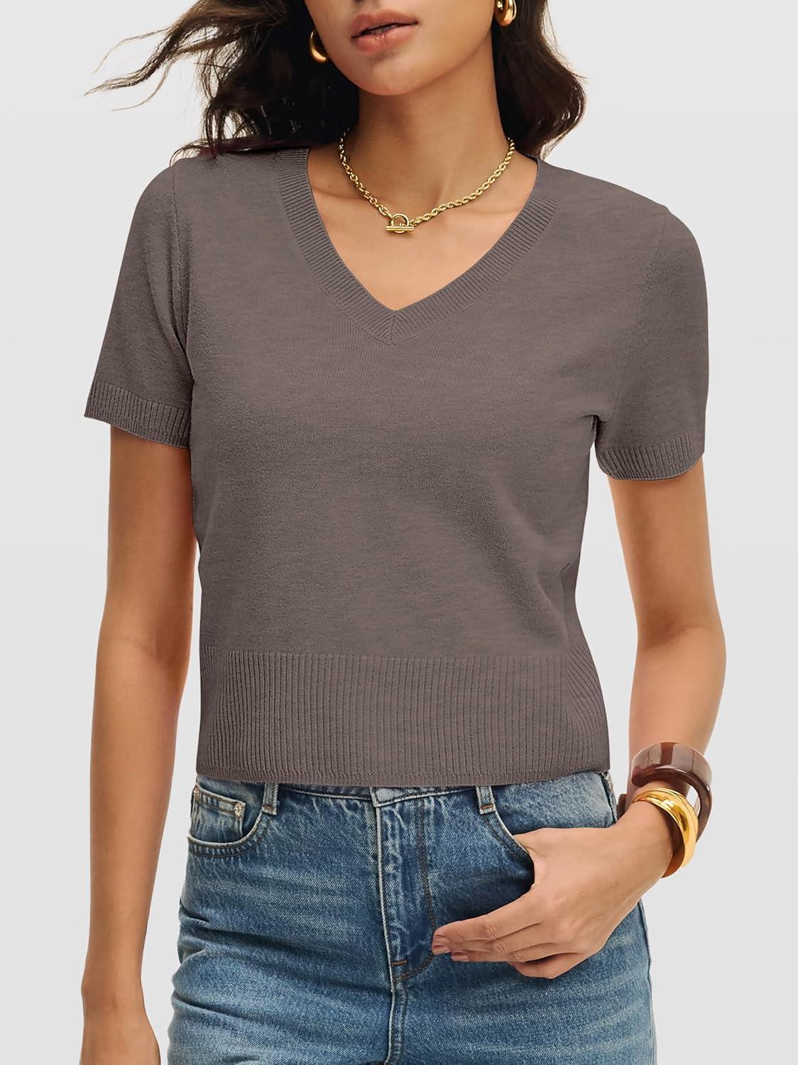 ANRABESS Womens Short Sleeve Sweaters Cropped V Neck Business Casual Lightweight Sweater Tops Summer Spring Clothes 2026(Light Coffee)