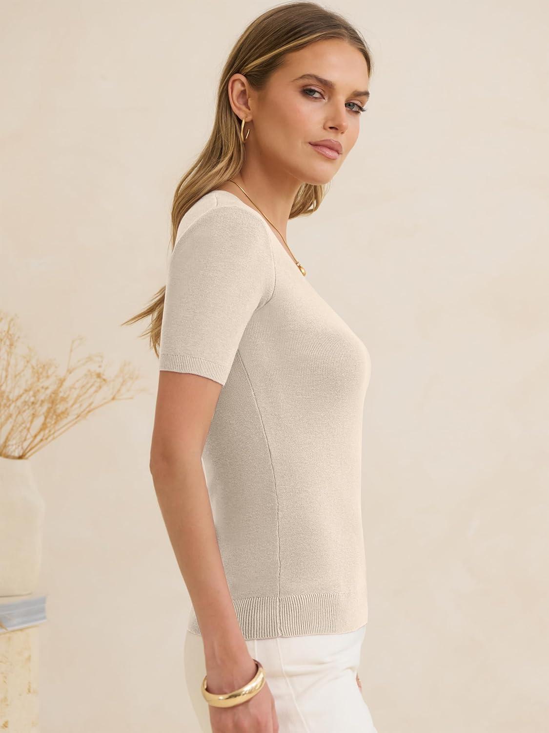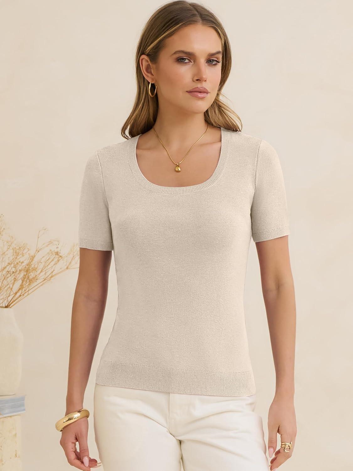 ANRABESS Womens Short Sleeve Sweaters Summer Scoop Neck Casual Basic Shirts Knit Pullover Work Tops 2026 Spring Outfits(Parchment)
