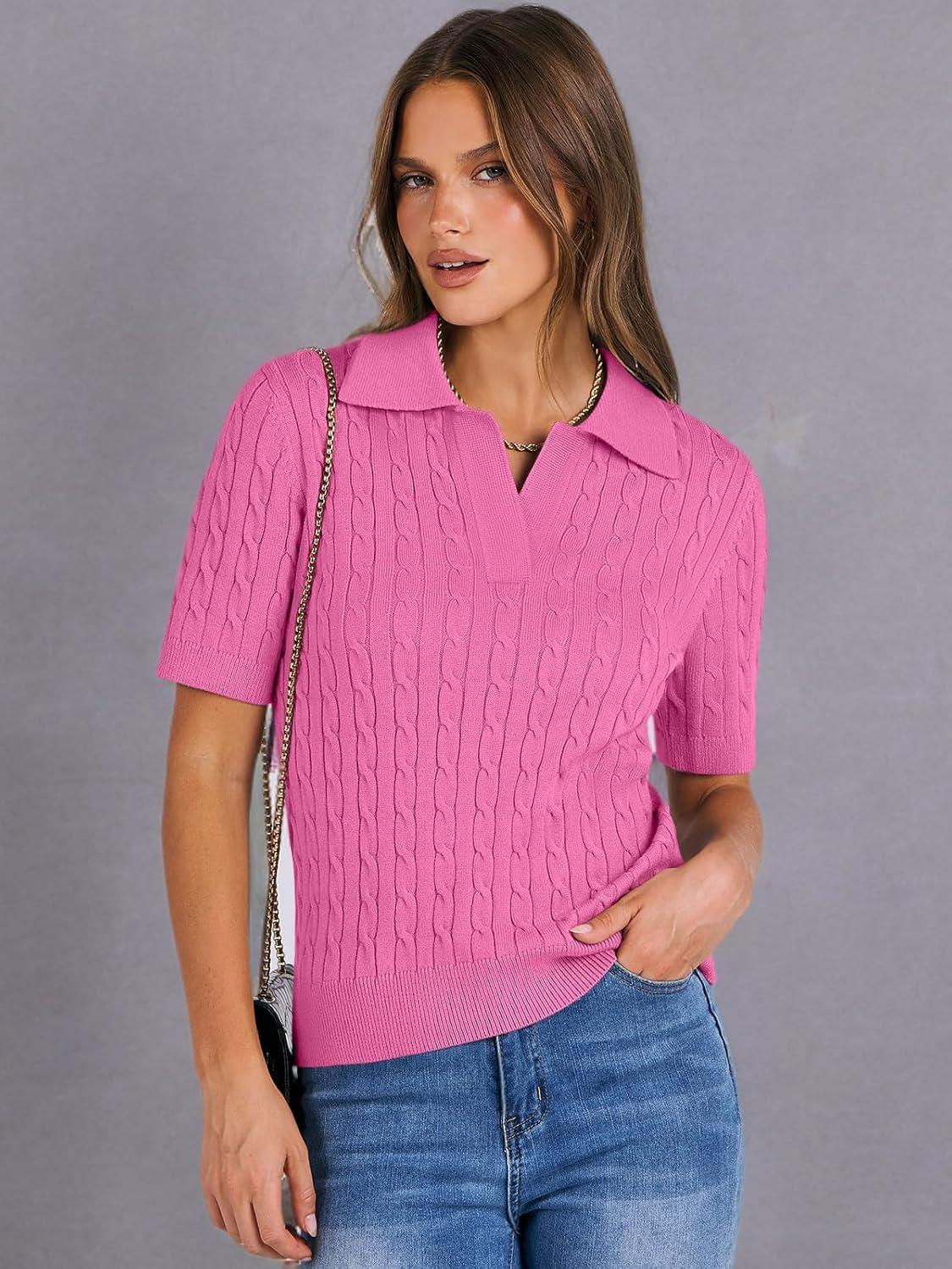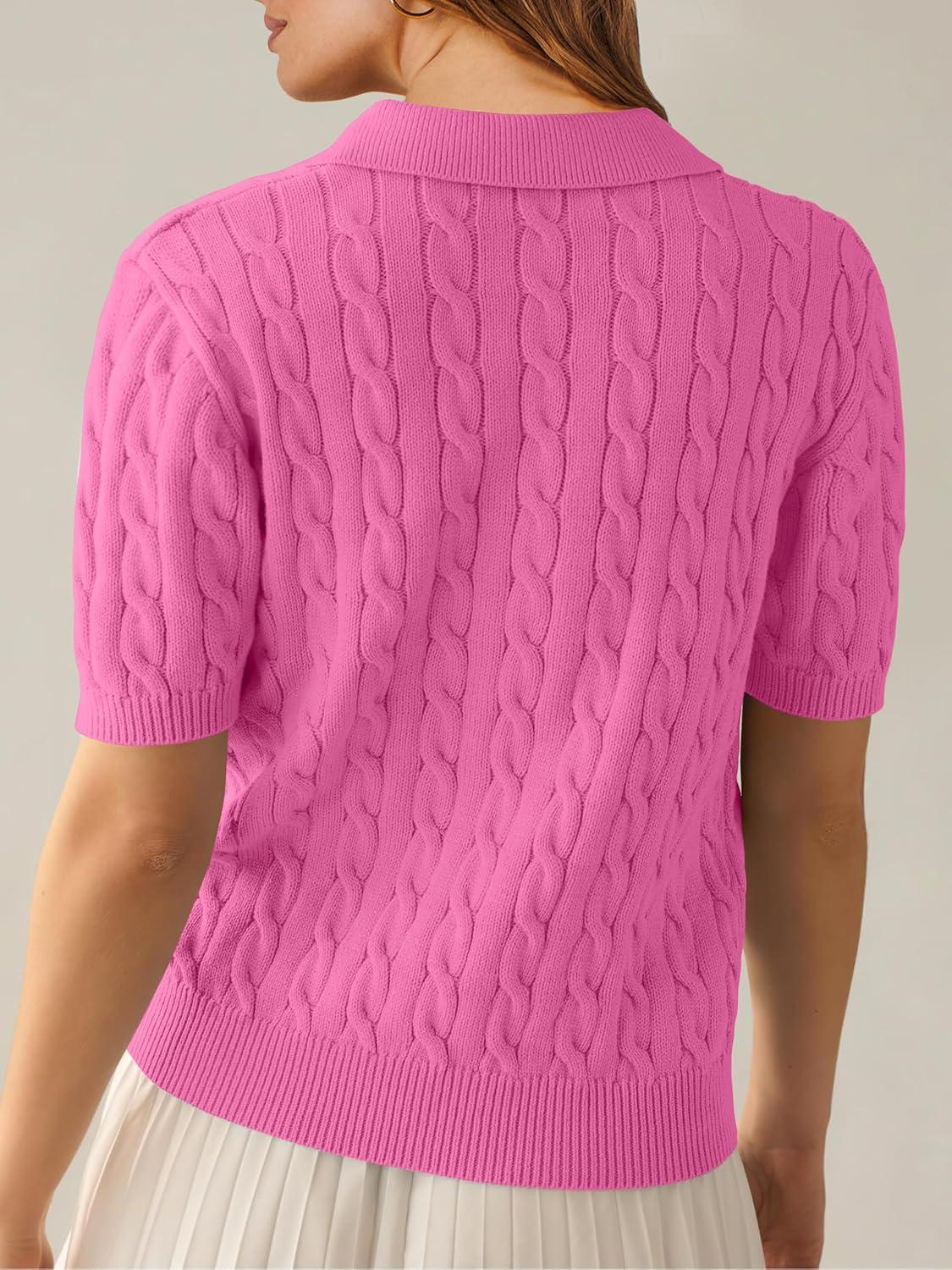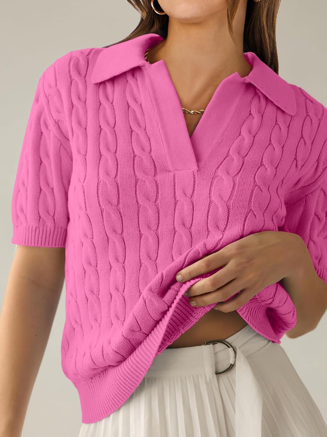 ANRABESS Women's Short Sleeve Sweaters Tops Polo V Neck Cable Knit Casual Soft Pullover Shirts 2026 Summer Outfits(Bright Pink)