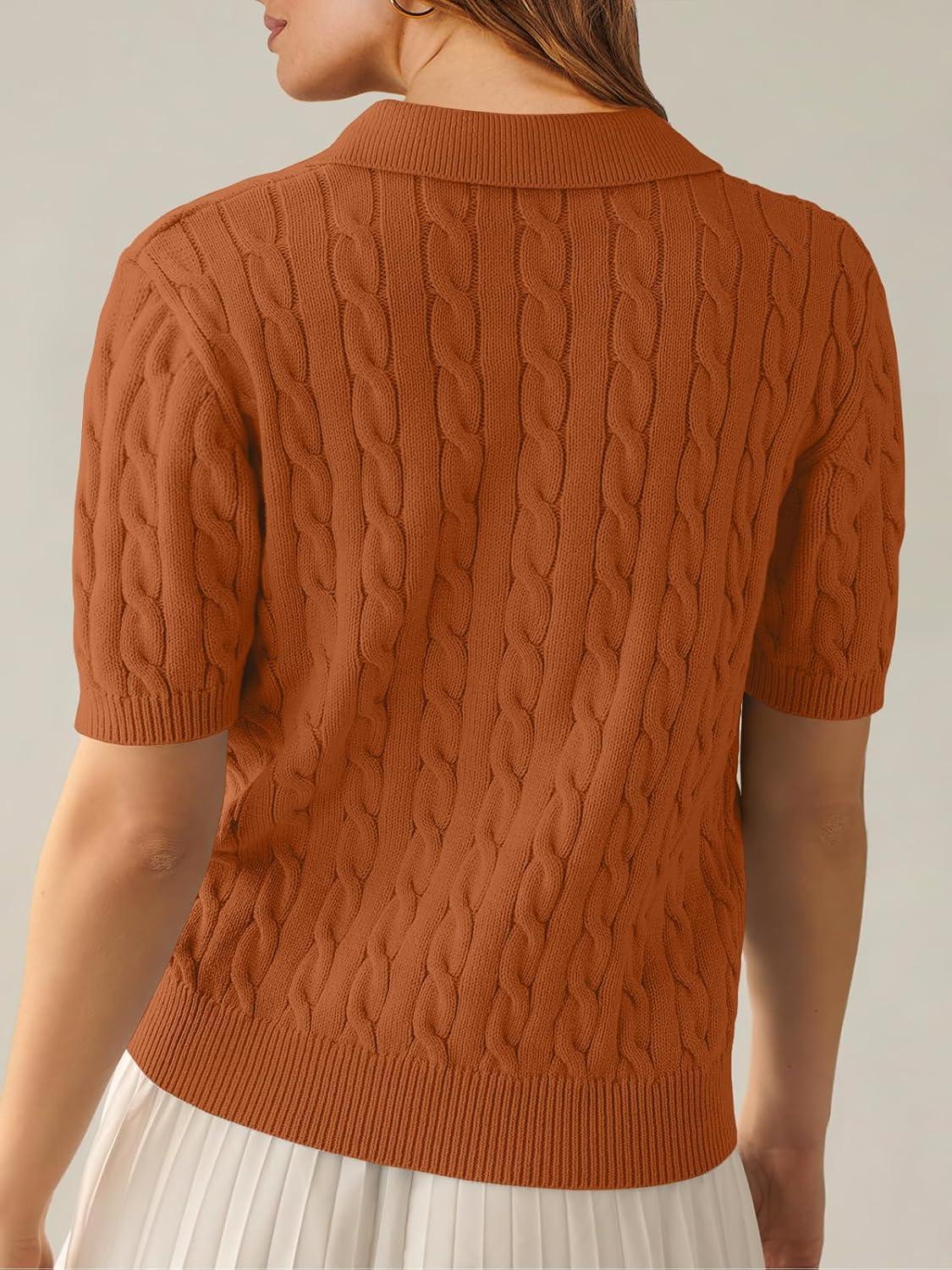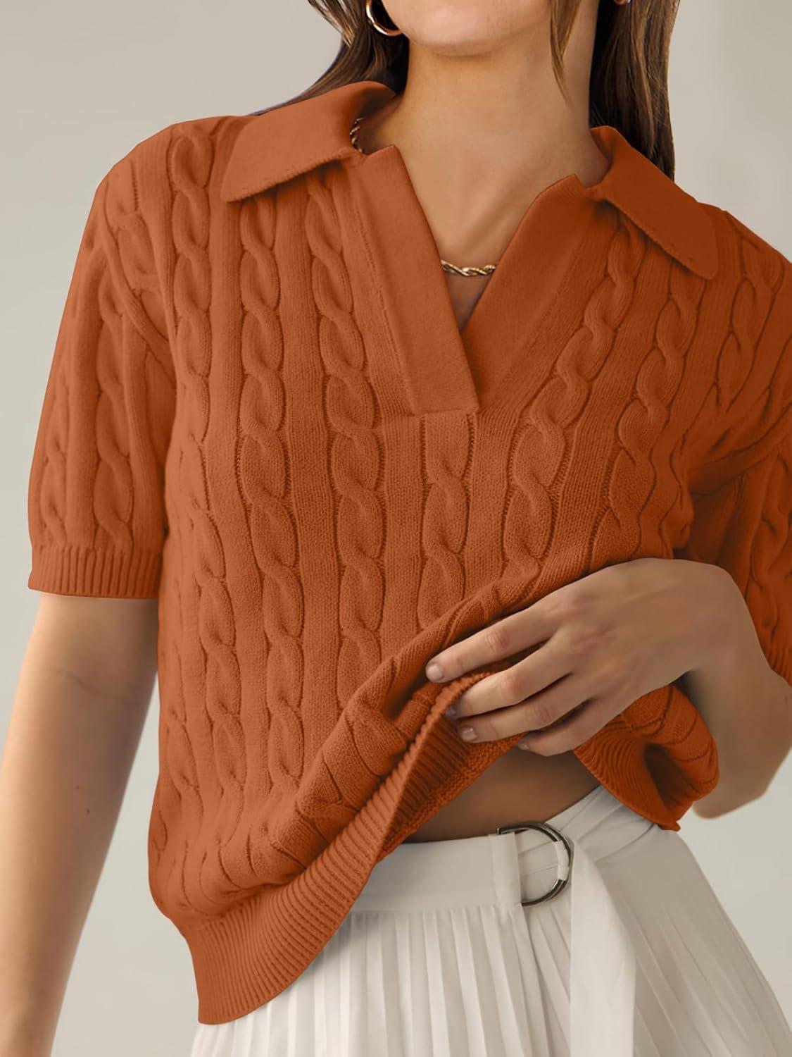 ANRABESS Women's Short Sleeve Sweaters Tops Polo V Neck Cable Knit Casual Soft Pullover Shirts 2026 Summer Outfits(Rust)