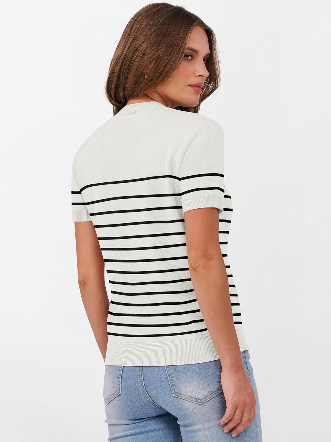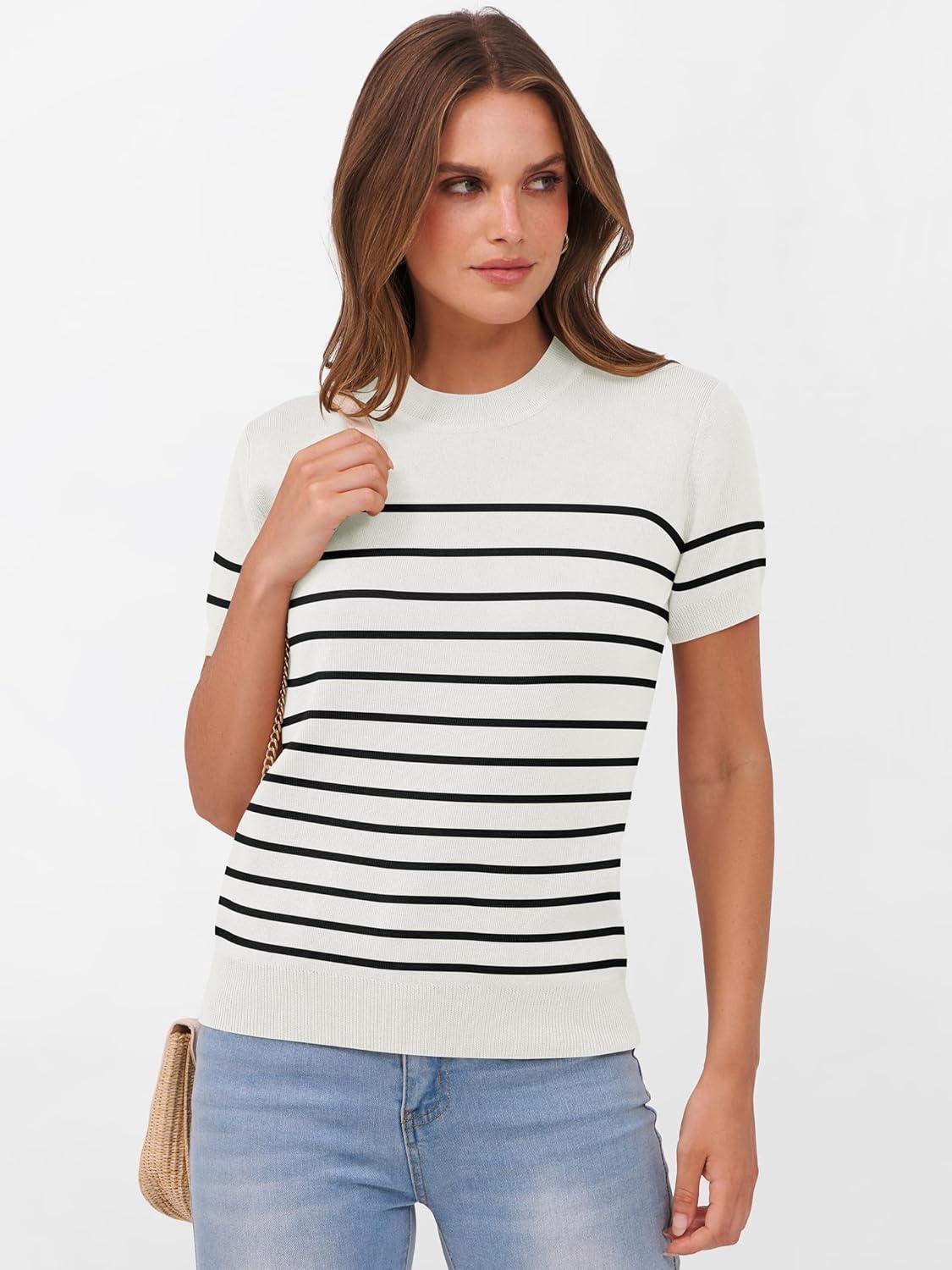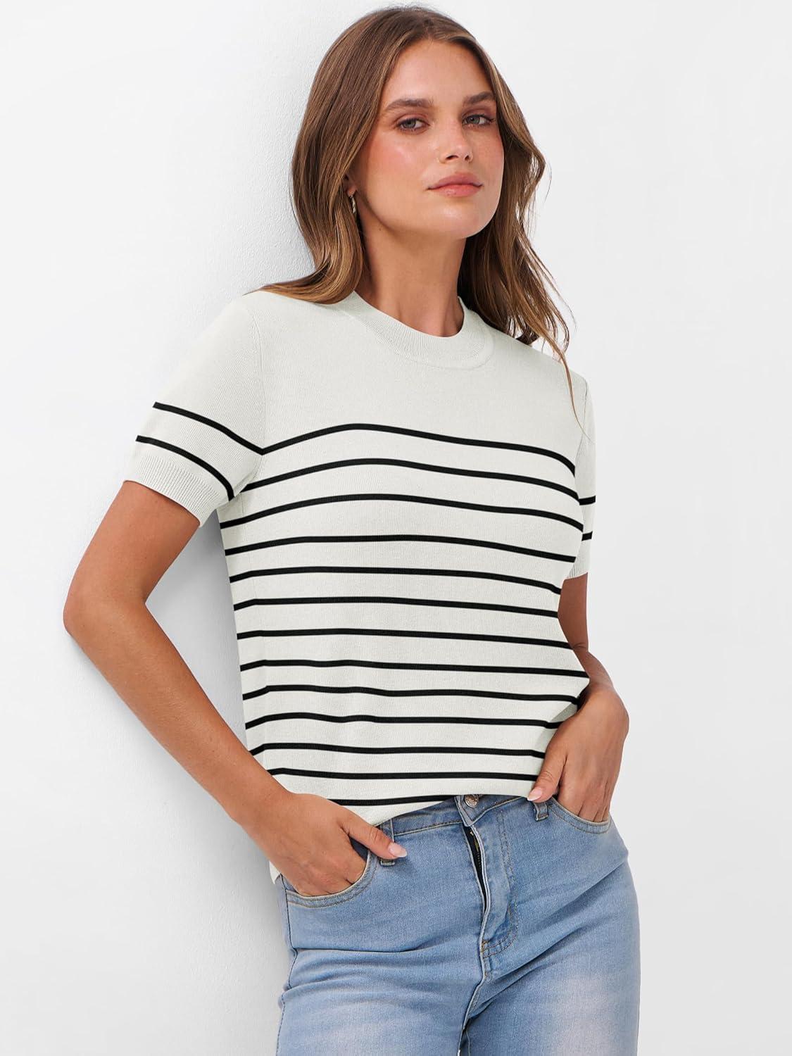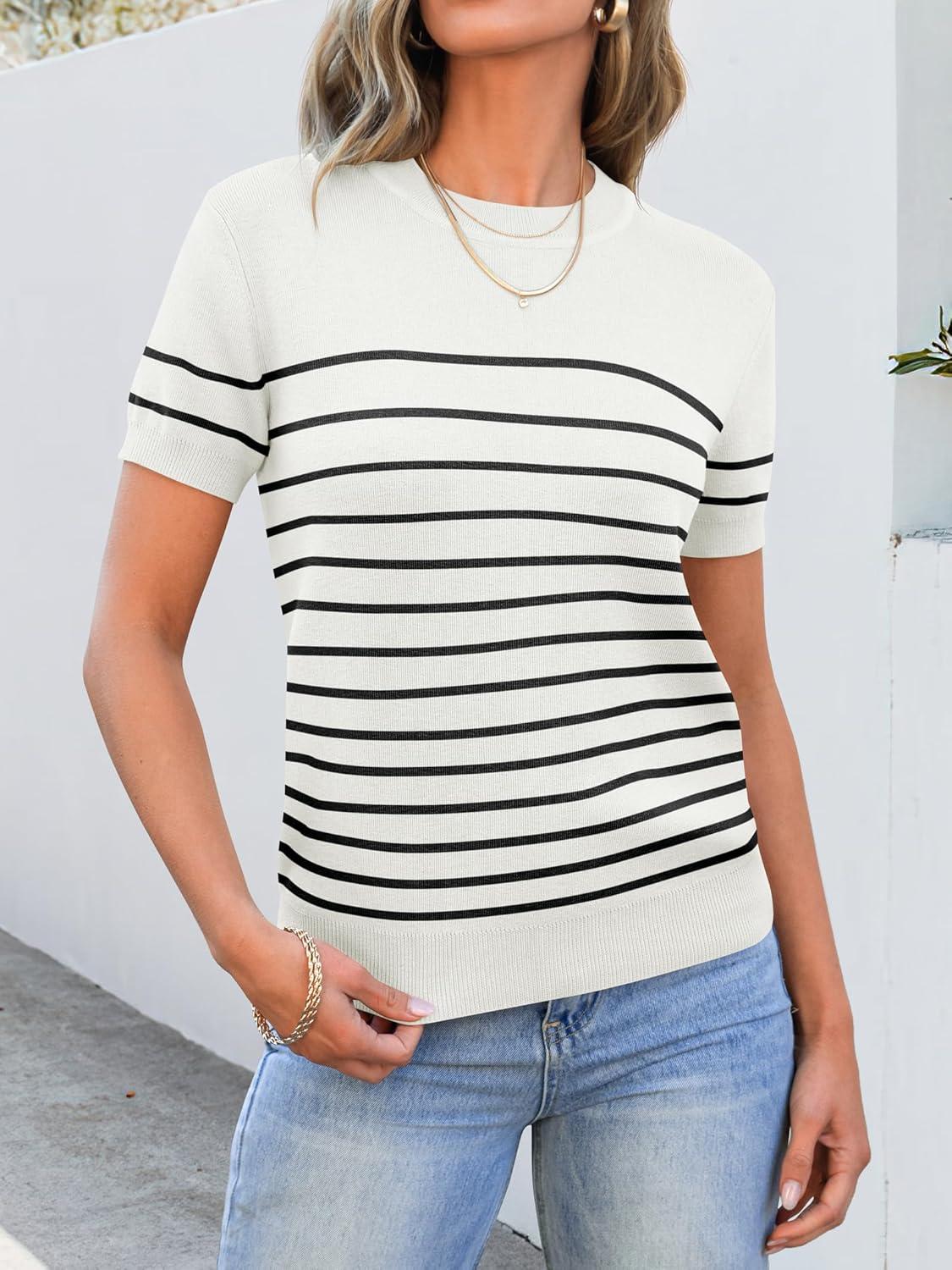 ANRABESS Womens Short Sleeve Sweaters Wool Blend Crew Neck Sweater Shirts Business Casual Work Tops 2025 Summer Outfits(White Black Stripe)