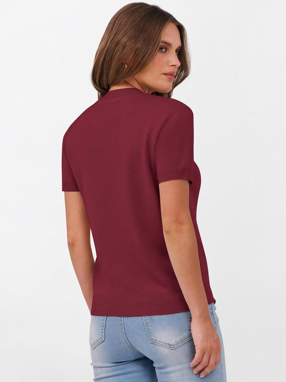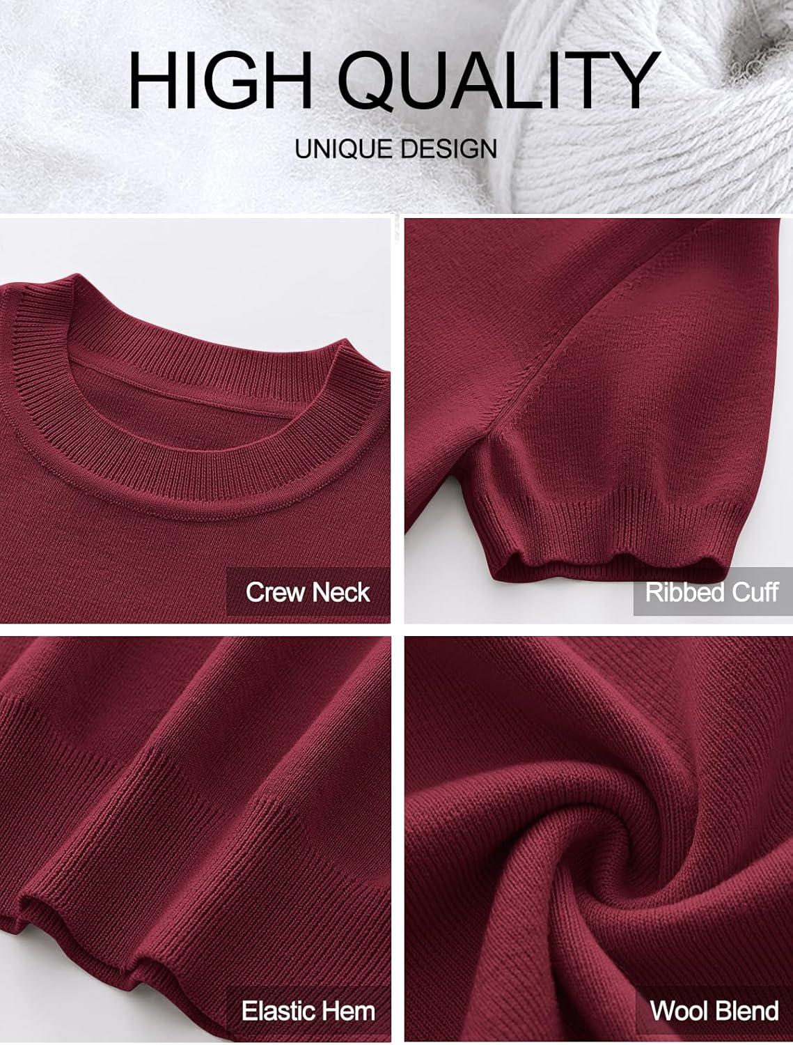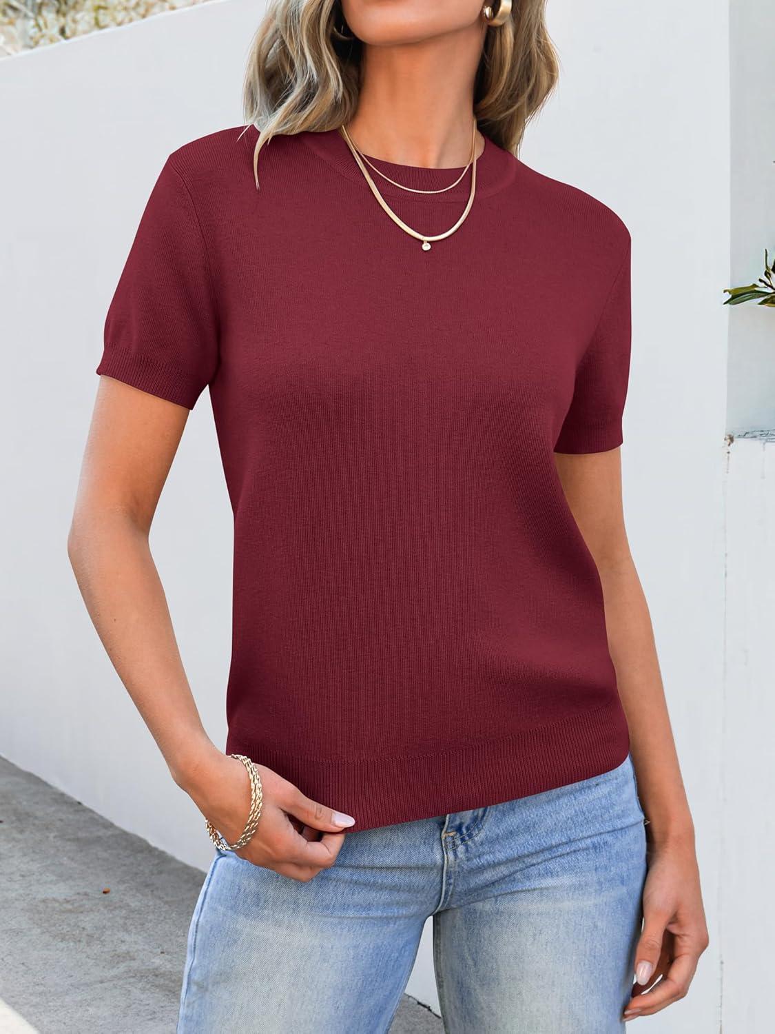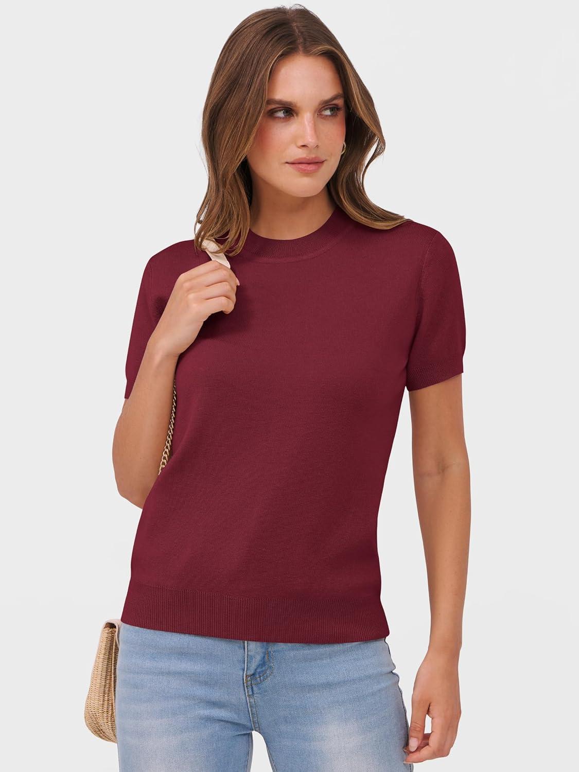 ANRABESS Womens Short Sleeve Sweaters Wool Blend Crew Neck Sweater Shirts Business Casual Work Tops 2026 Summer Outfits(Wine Red)