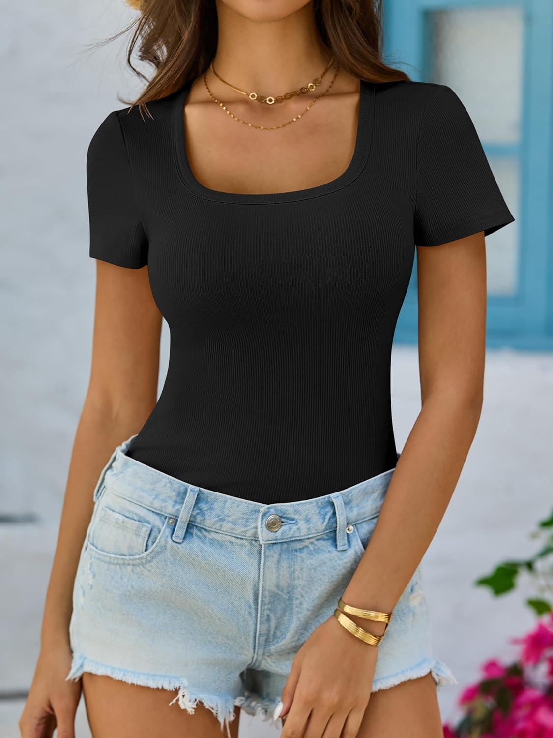 ANRABESS Womens Short Sleeve Tops Built in Bra Summer T Shirts Scoop Neck Ribbed Knit Fitted Basic Tee Casual Going Out Top(Black)