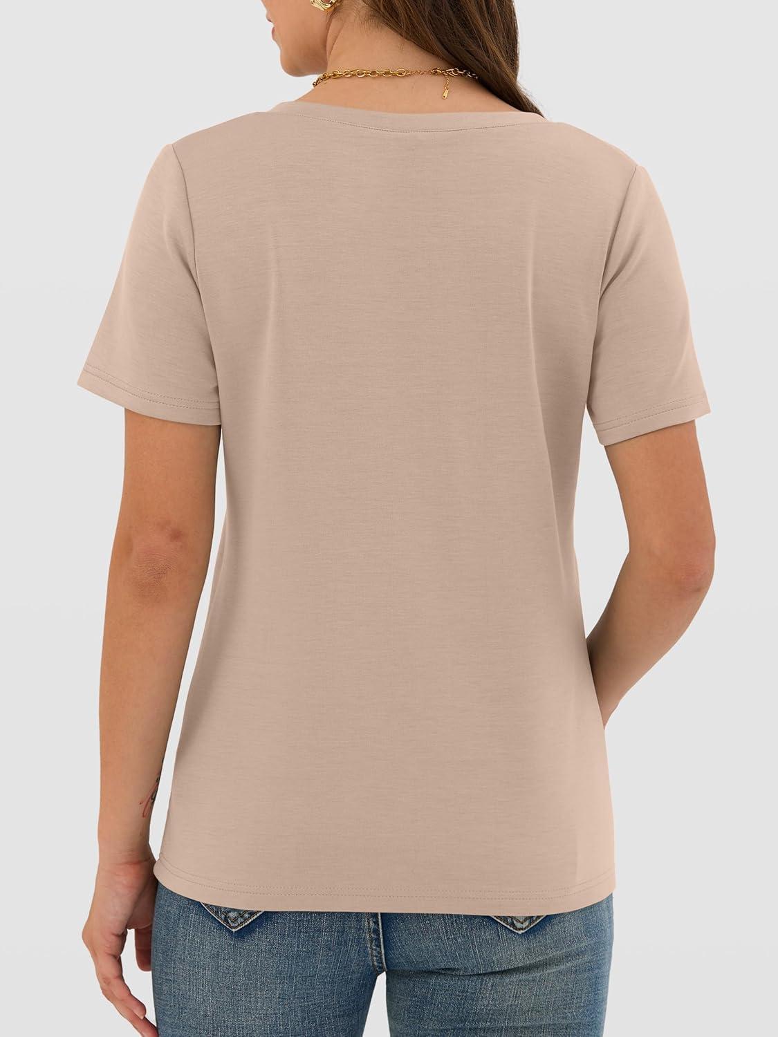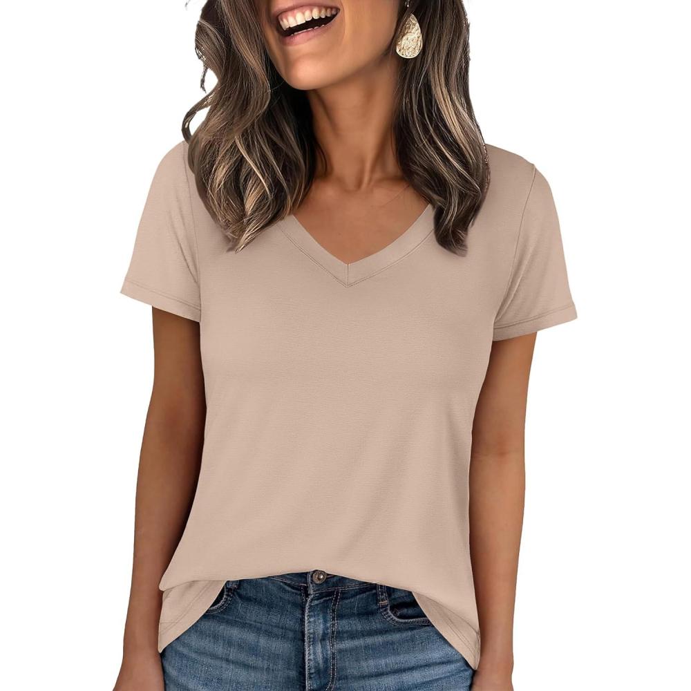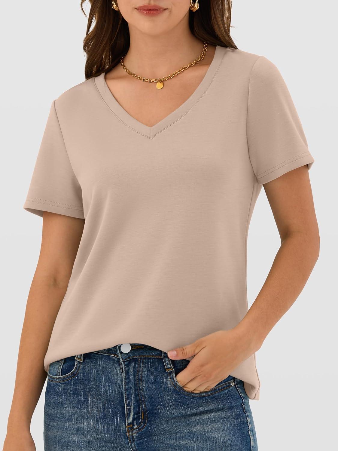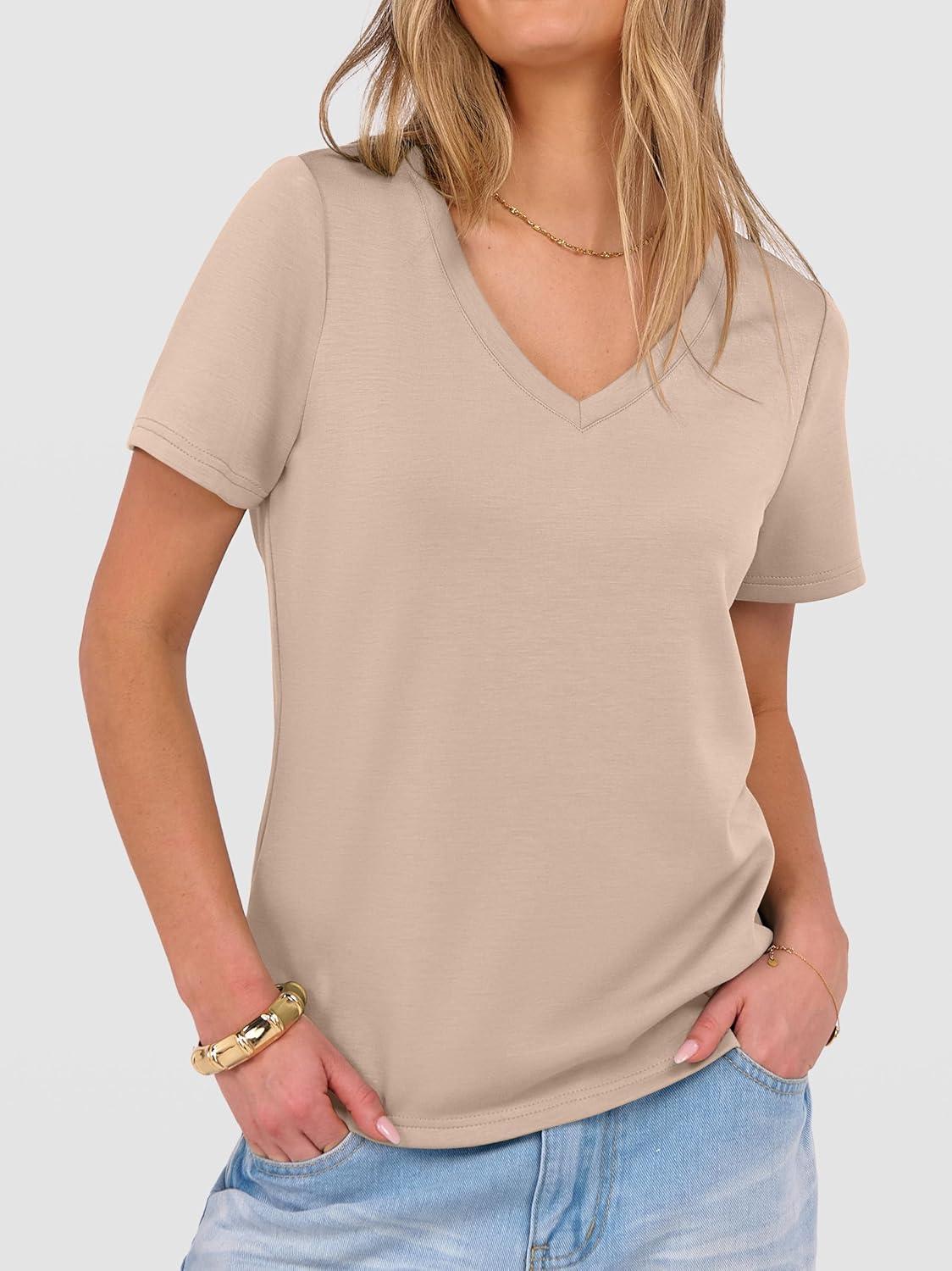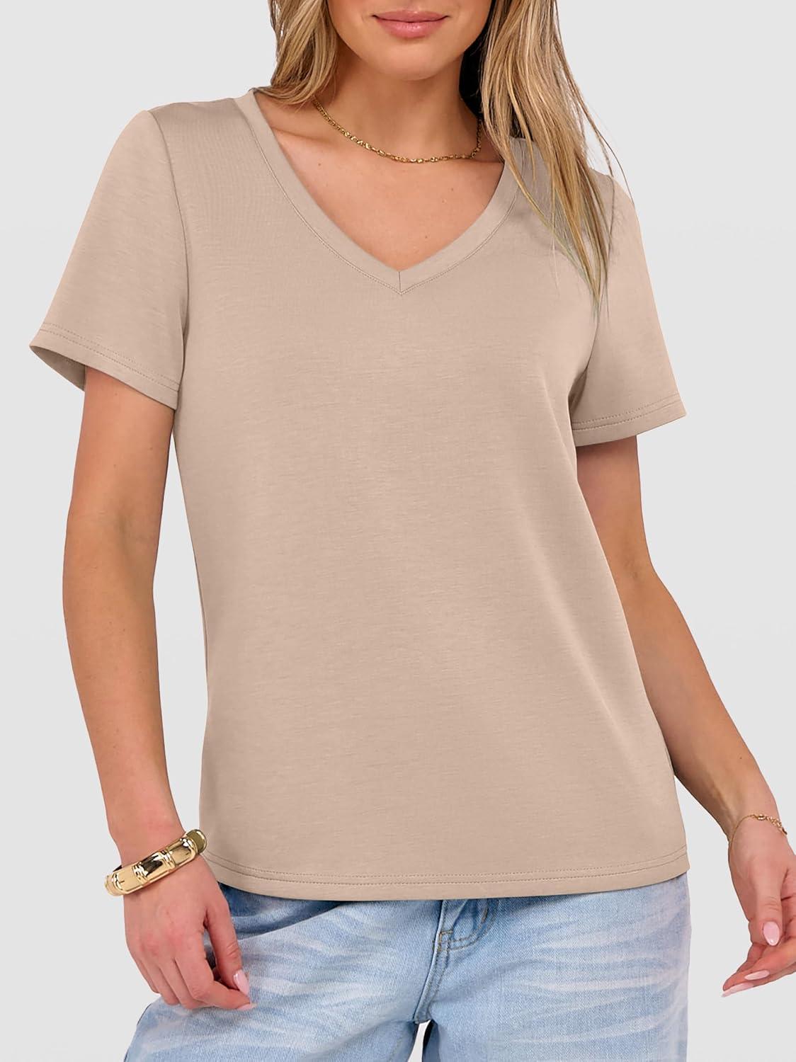 ANRABESS Womens Short Sleeve Tops Casual V Neck Wrinkle - Free Basic T Shirts Summer Cute Tee 2026 Spring Fashion Clothes(Almond)
