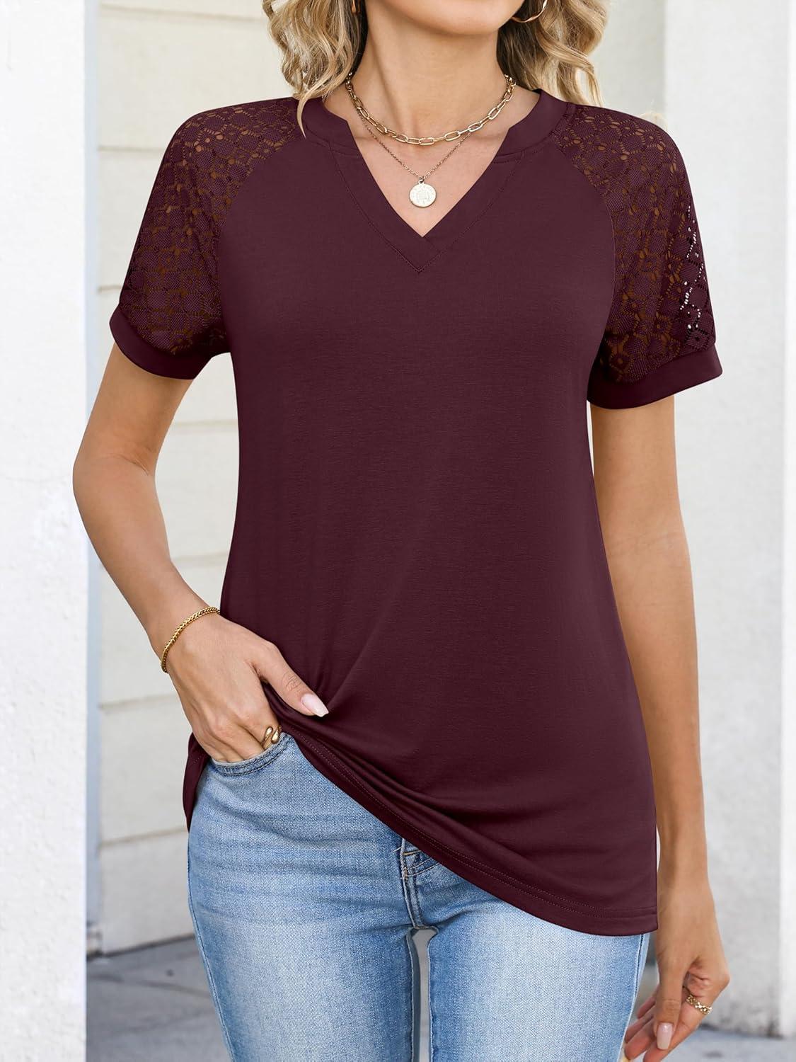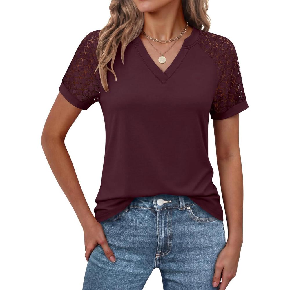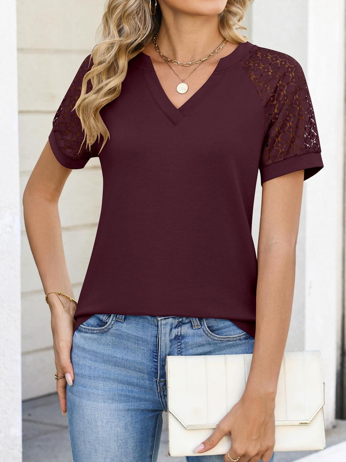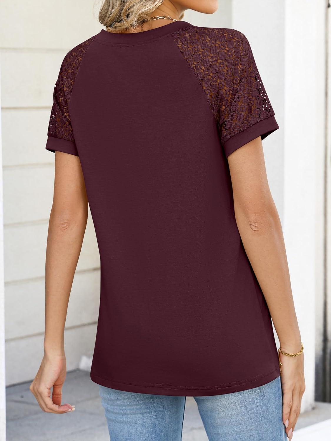 ANRABESS Womens Short Sleeve V Neck Shirts Lace Dressy Casual Blouse 2026 Summer Business Work Tops Vacation Trendy T-Shirts(Wine Red)