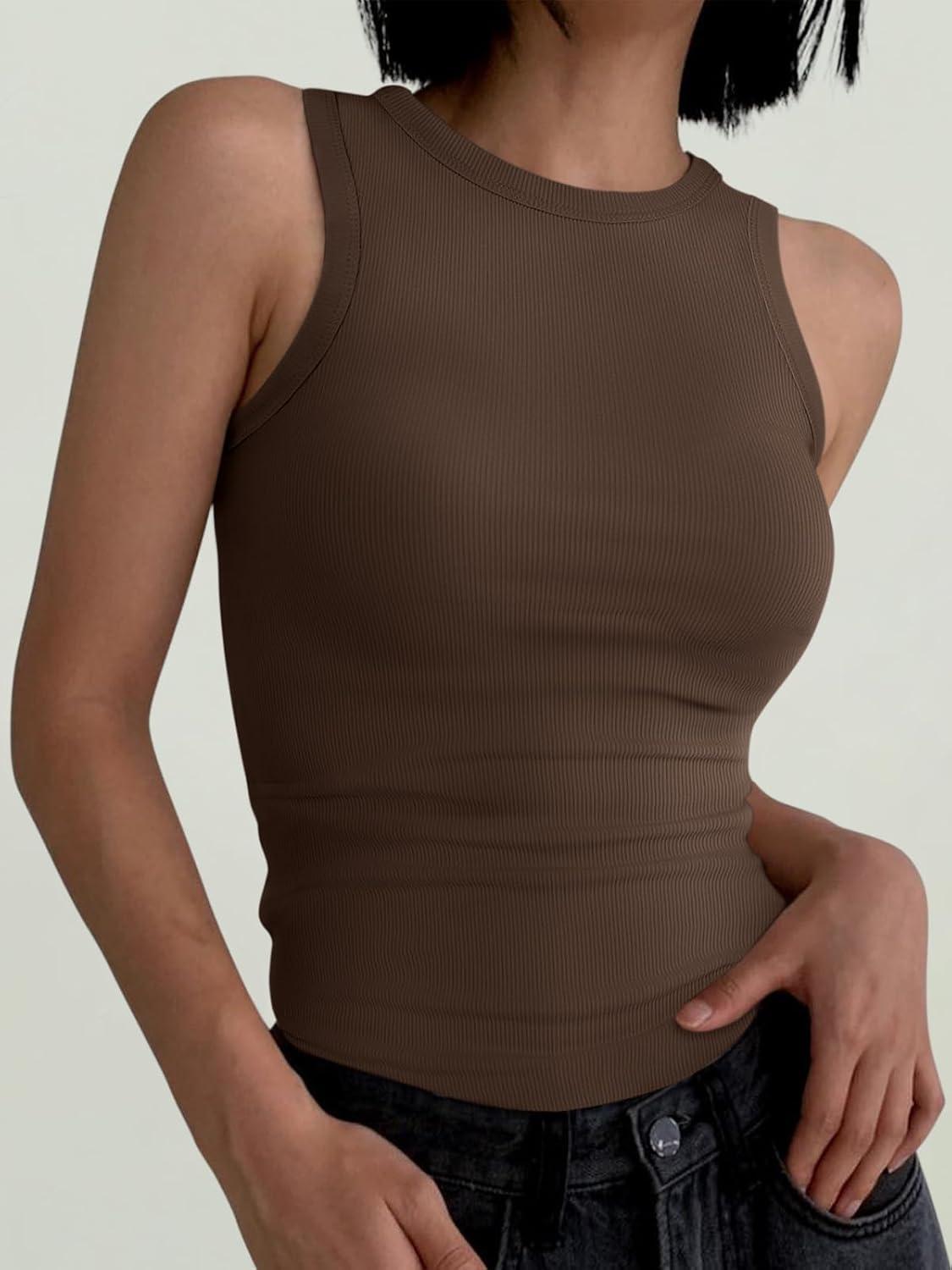 ANRABESS Womens Sleeveless High Neck Tank Tops Fashion Summer Casual Basic Slim Fit Ribbed Racerback Top Shirt Clothes(Brown)