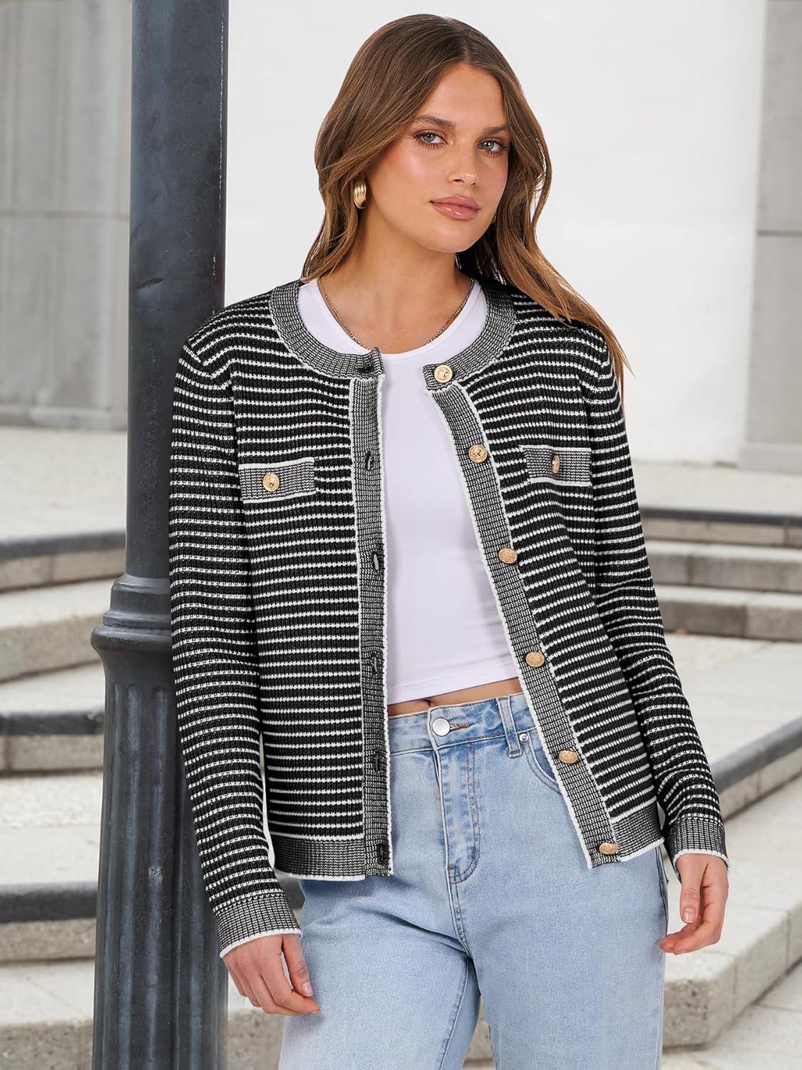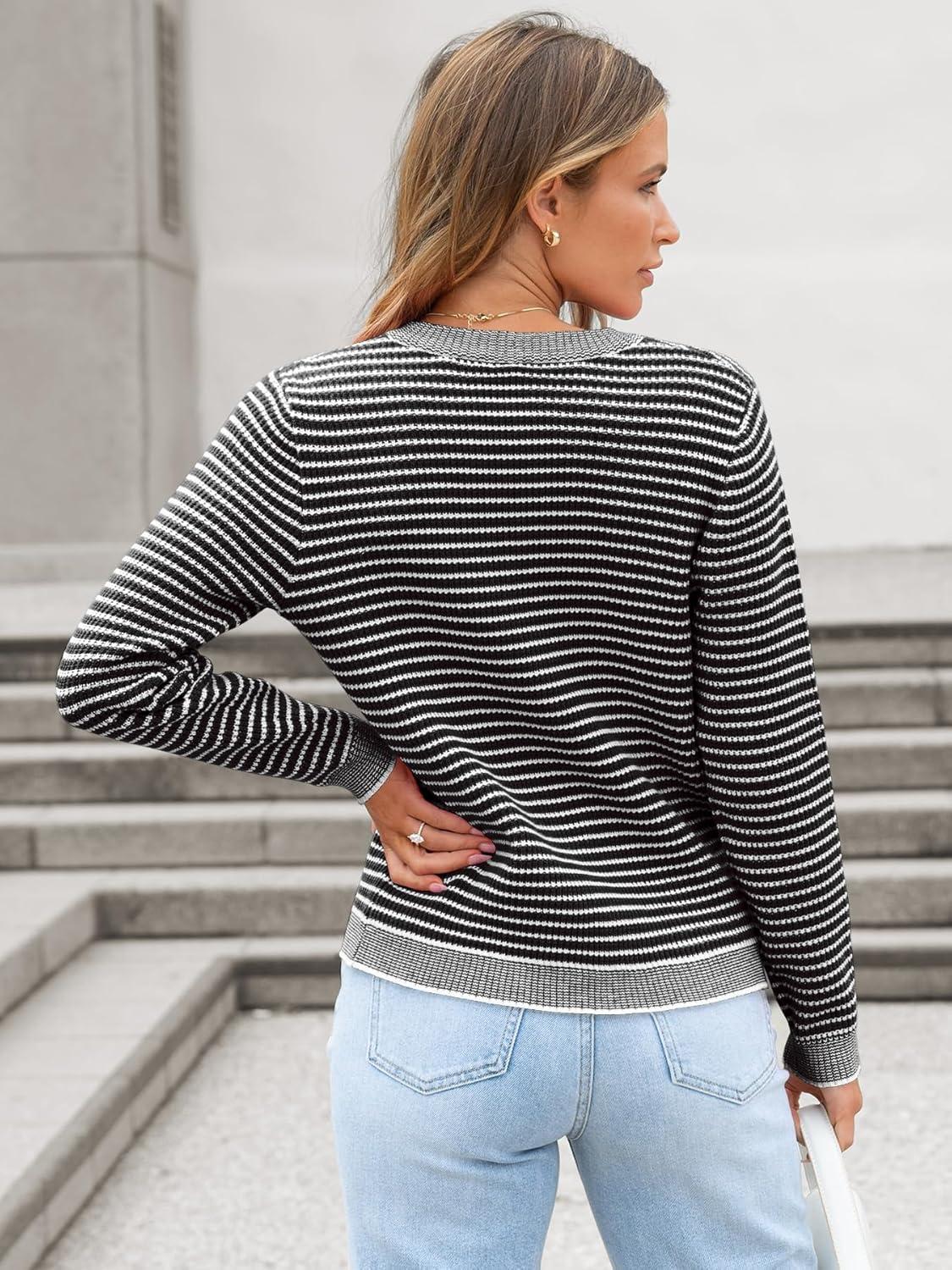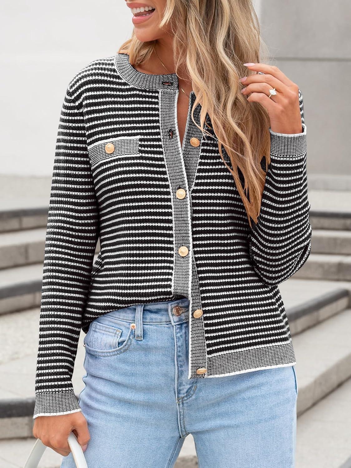 ANRABESS Women's Striped Cardigan Sweaters Casual Long Sleeve Open Front Button Down Knit Cropped Jackets Fall Coat Outerwear(Stripe Black)
