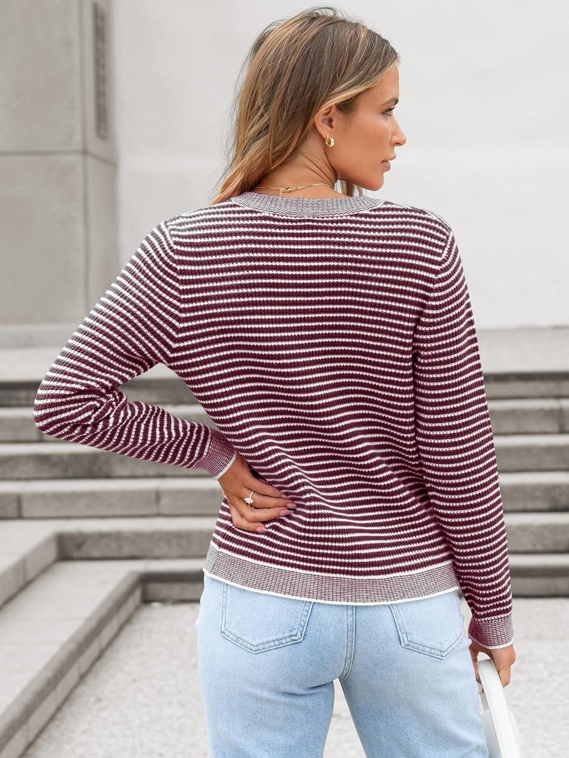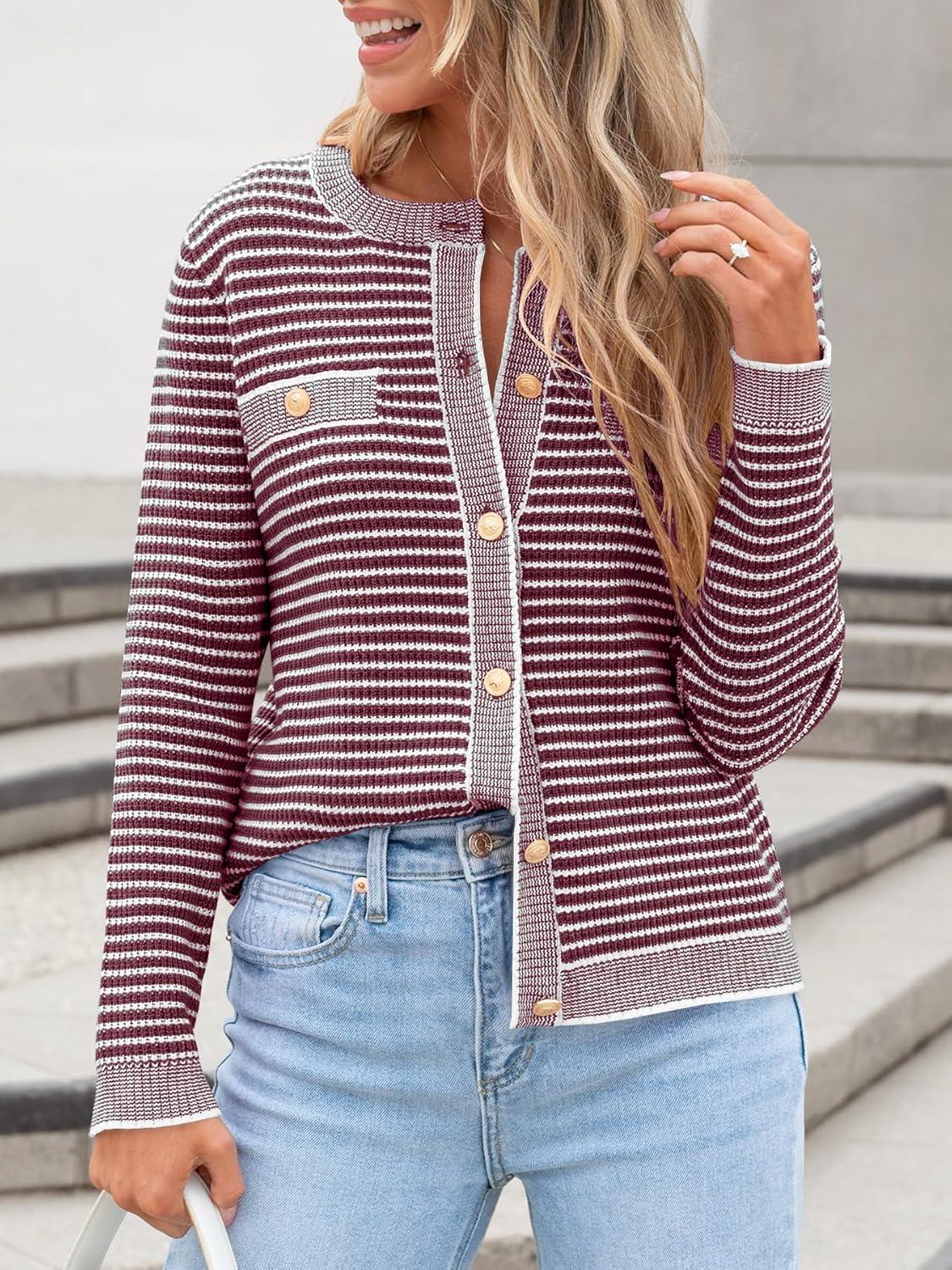 ANRABESS Women's Striped Cardigan Sweaters Casual Long Sleeve Open Front Button Down Knit Cropped Jackets Fall Coat Outerwear(Stripe Burgundy)