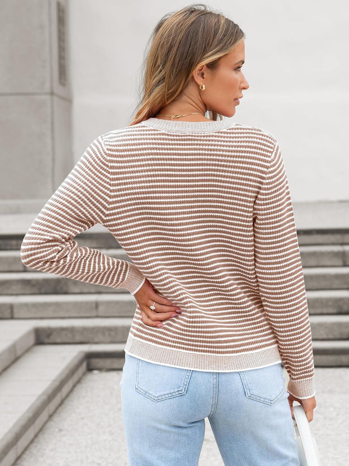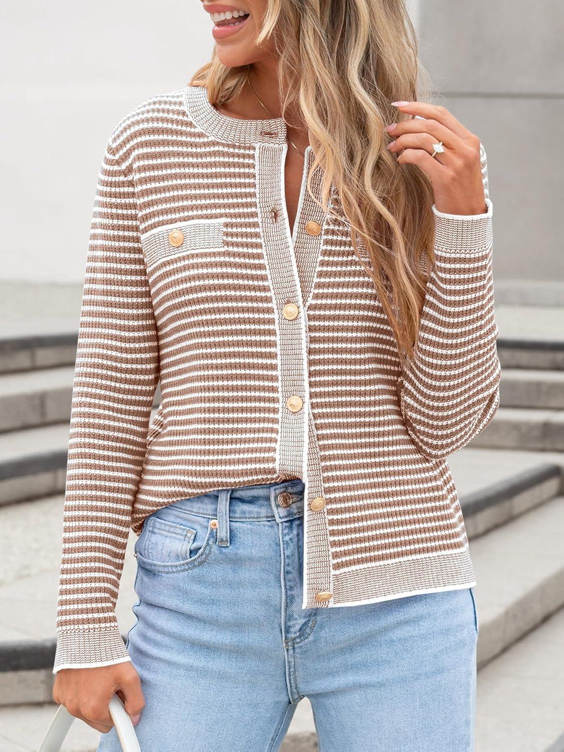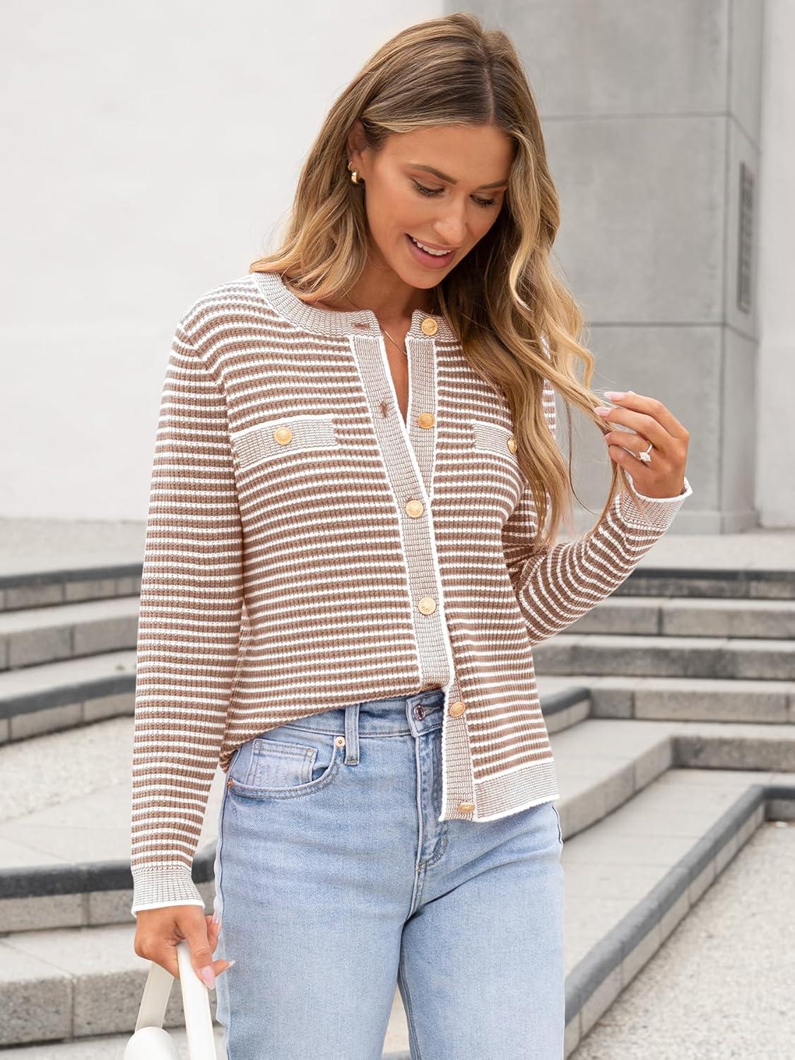 ANRABESS Women's Striped Cardigan Sweaters Casual Long Sleeve Open Front Button Down Knit Cropped Jackets Fall Coat Outerwear(Stripe Khaki)