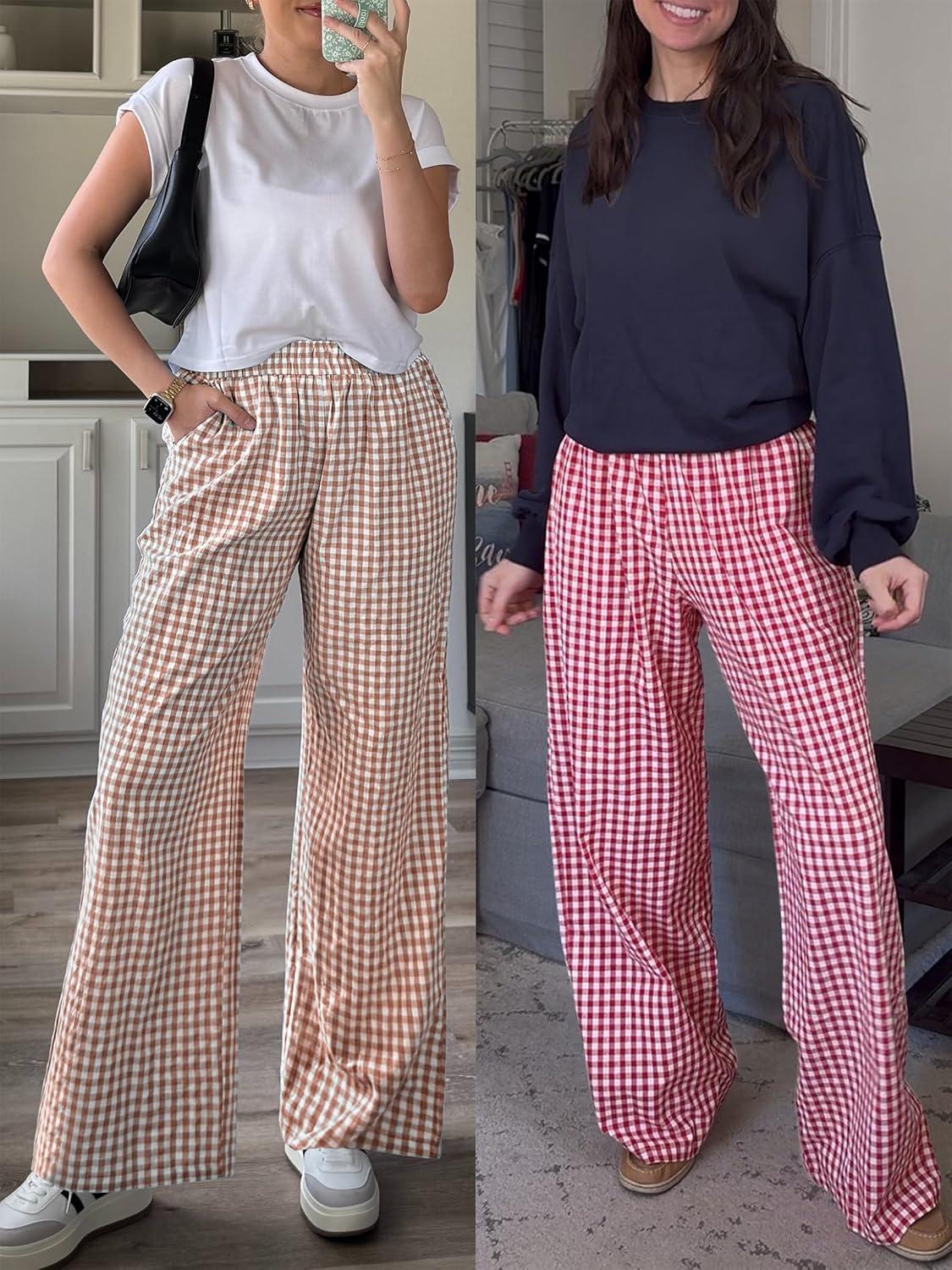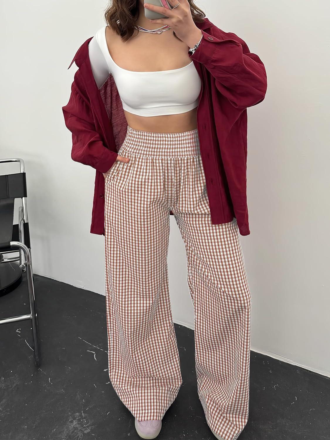 ANRABESS Womens Striped Gingham Palazzo Pants Wide Leg High Waisted Lounge Pajama Pants Cute Casual Trousers with Pockets(Light Brown White Plaid)