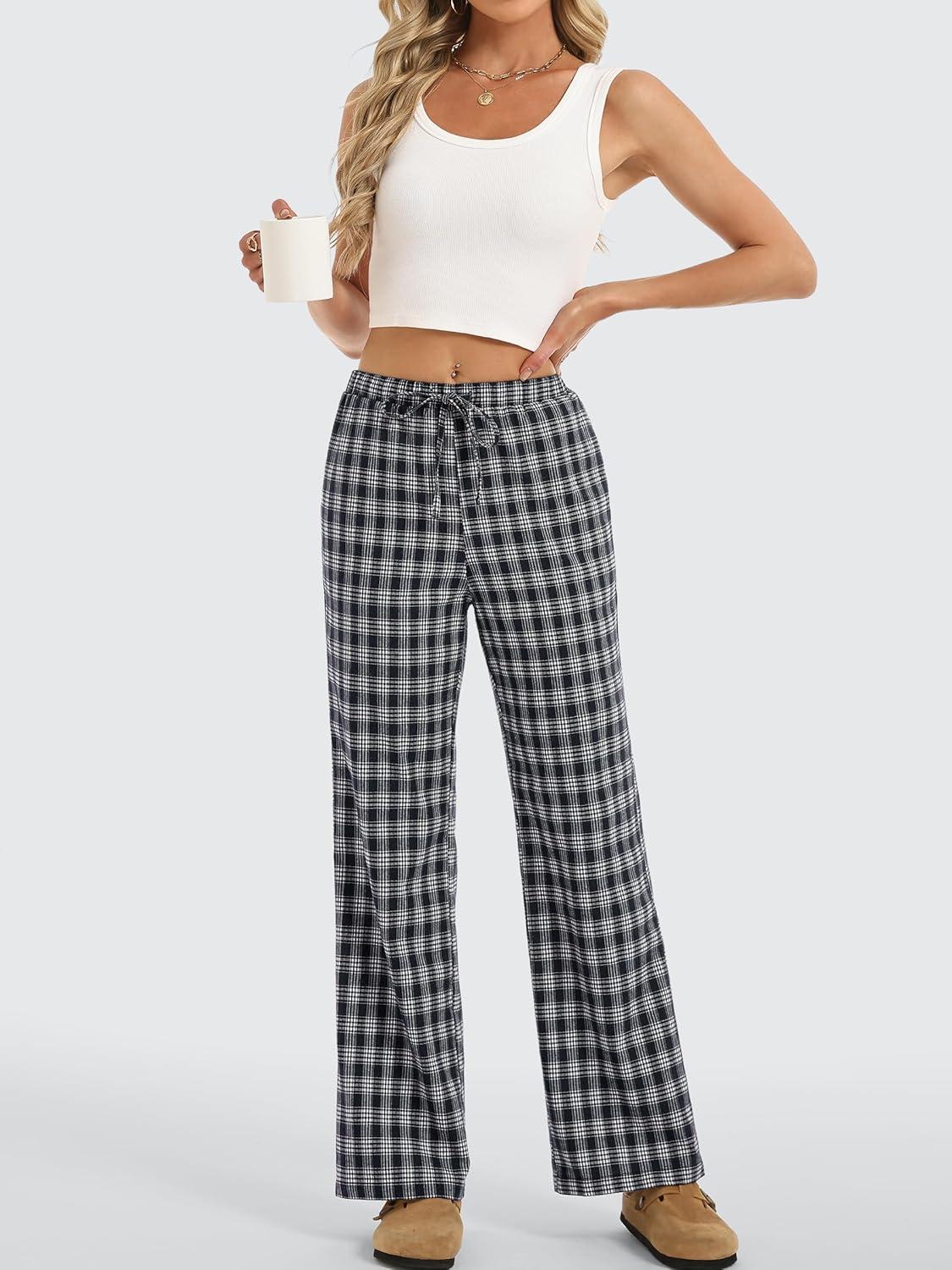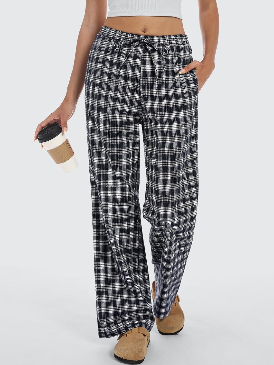 ANRABESS Women's Striped Gingham Pants 2025 Fall Pajama Lounge Boxer Pants Casual Wide Leg Drawstring PJ Bottoms Trousers(Multi Black Plaid)