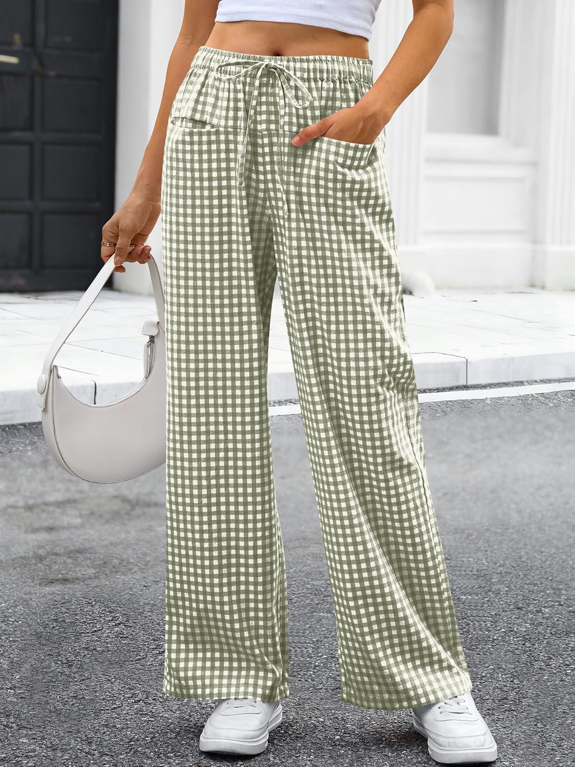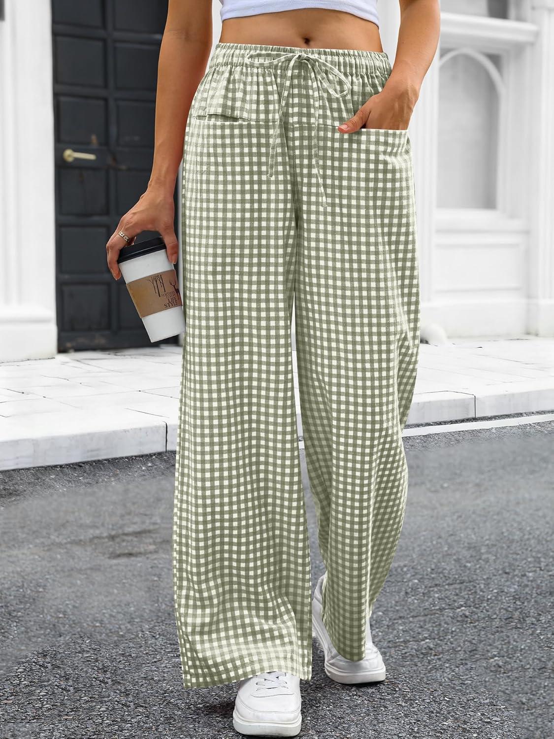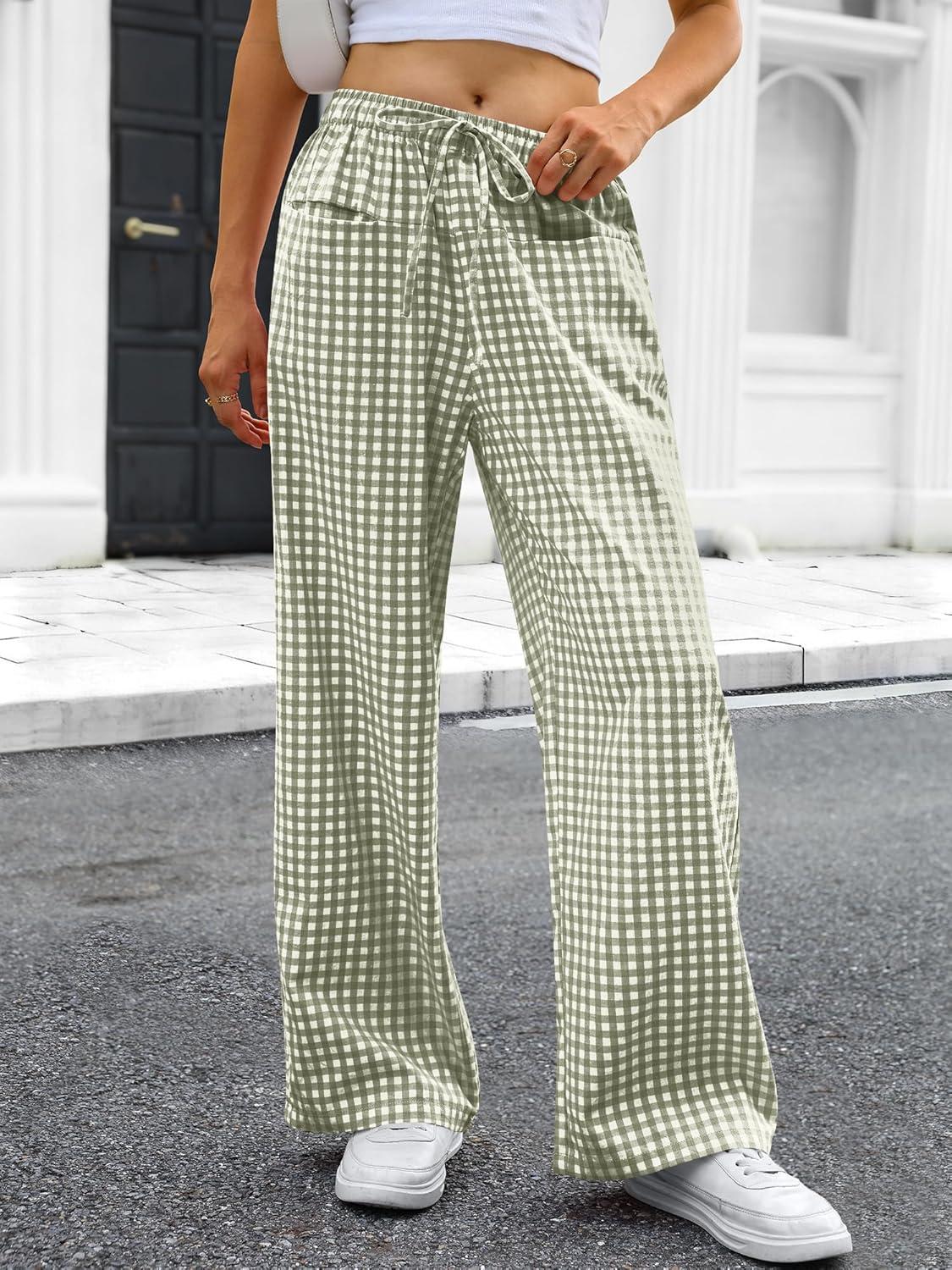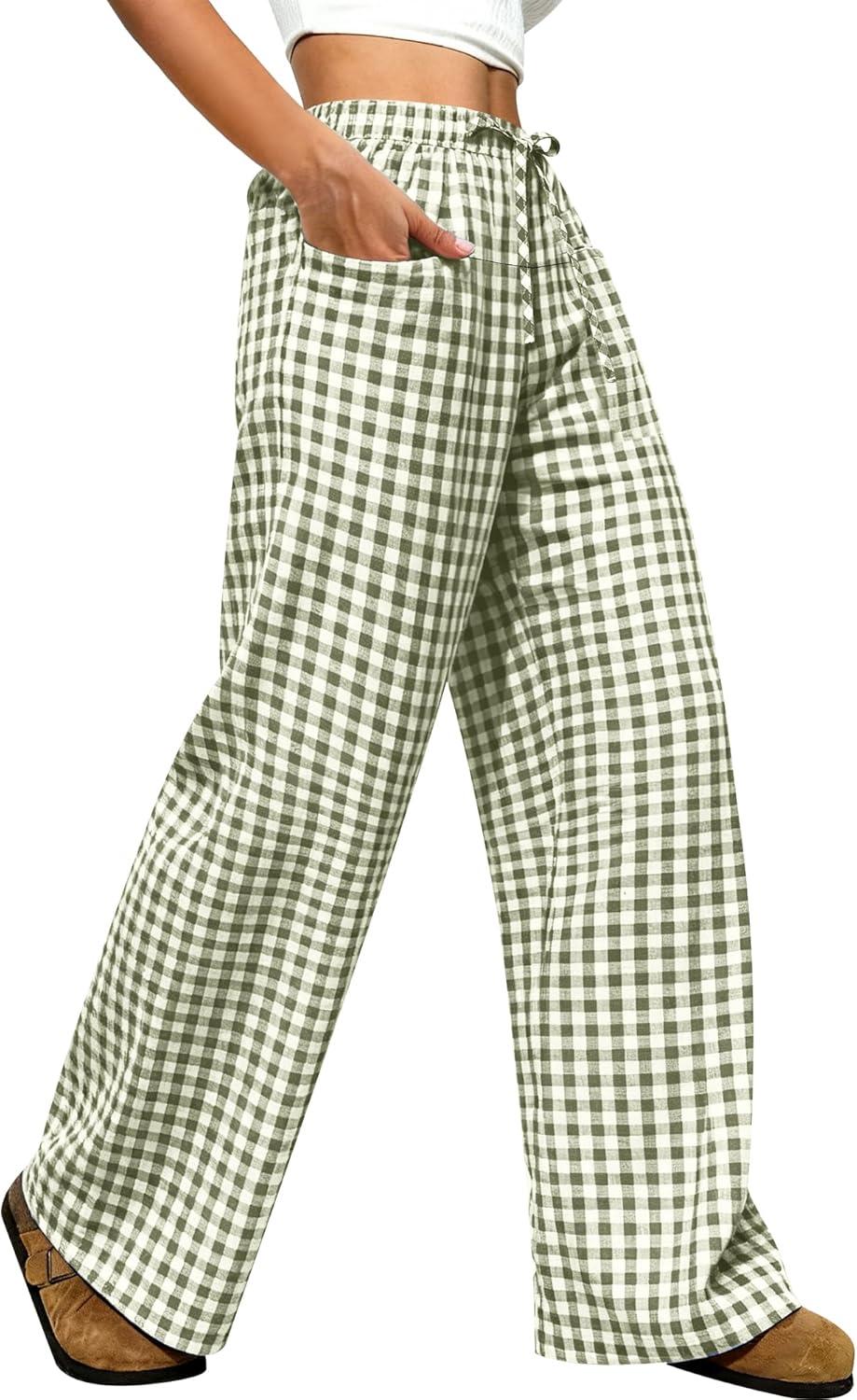 ANRABESS Womens Striped Gingham Pants 2025 Pajama Drawstring Wide Leg Lounge Plaid Pants Cute Casual Trousers with Pockets(Army Green White Plaid)