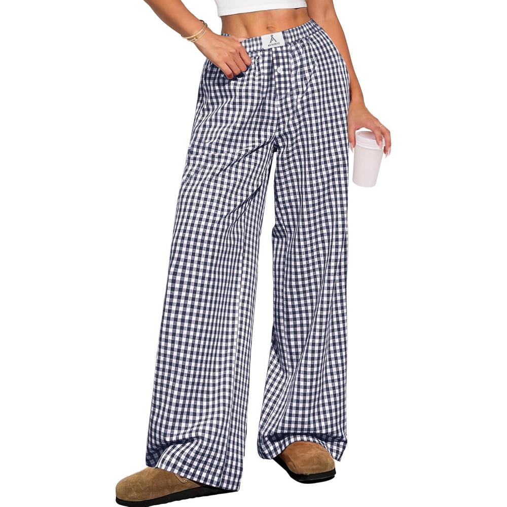 ANRABESS Womens Striped Gingham Pants 2025 Pajama Lounge Boxer Pants Cute Comfy PJ Bottoms with Pockets Y2K Plaid Outfits(Navy Blue White Plaid)