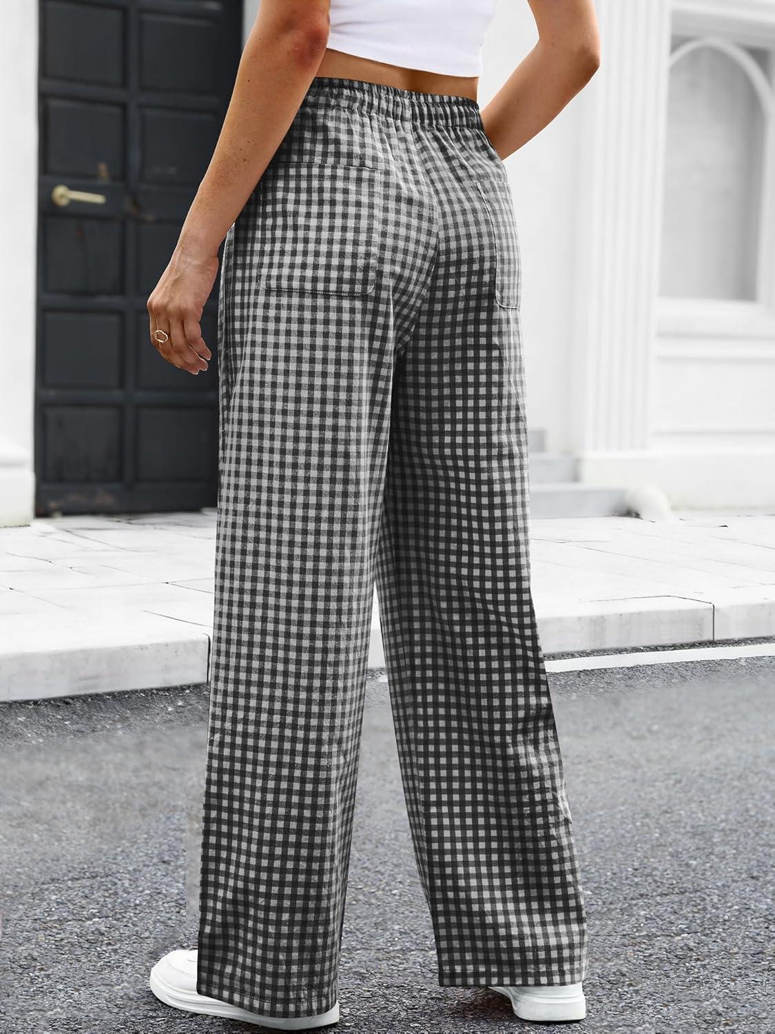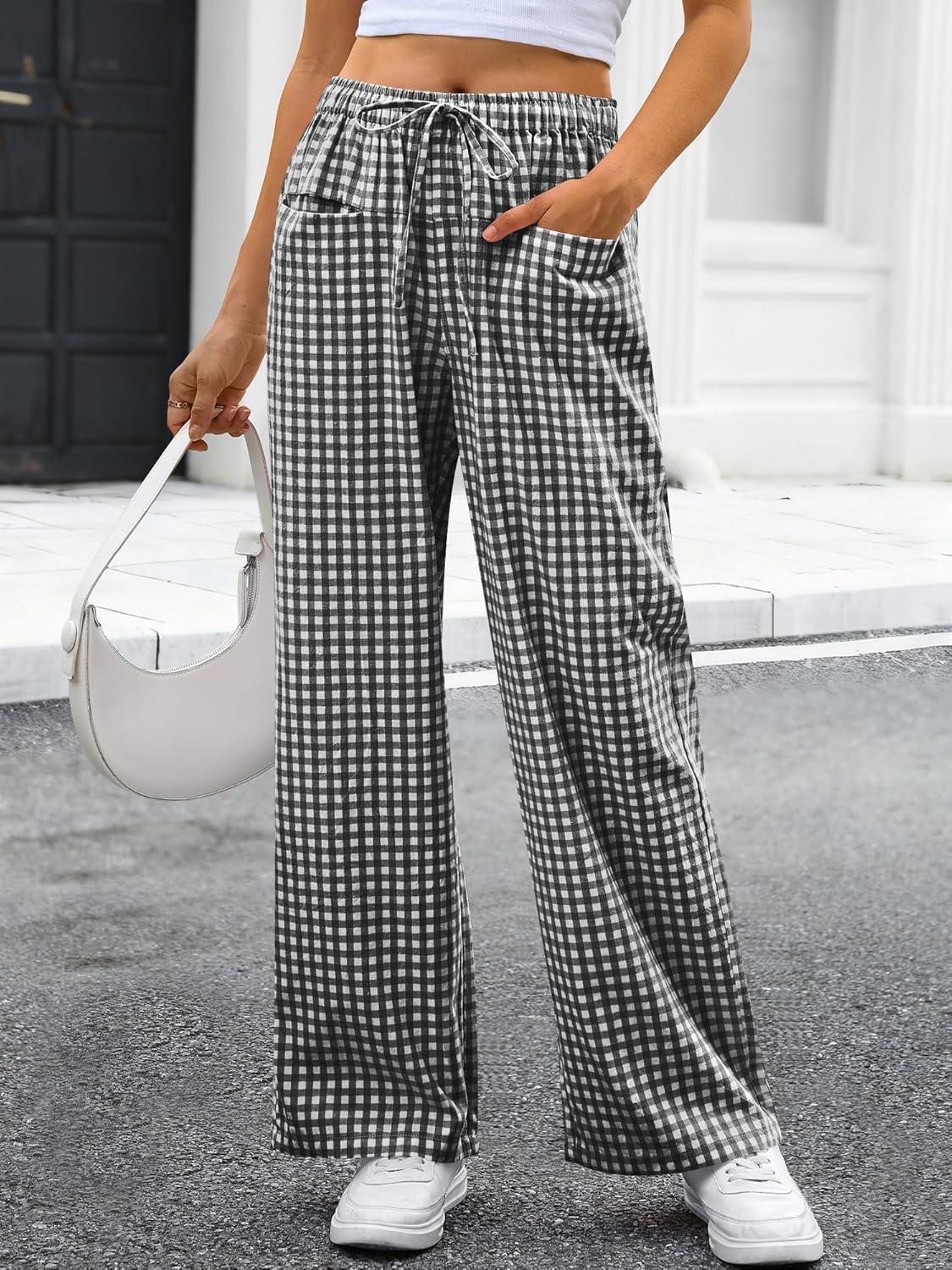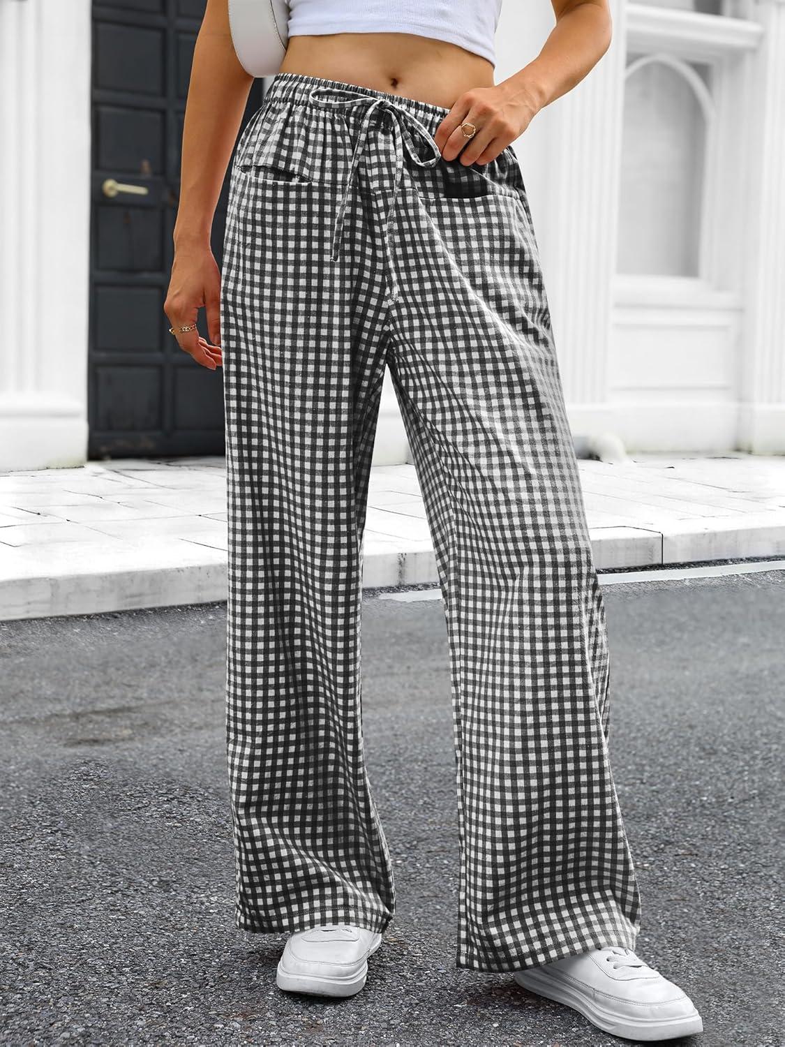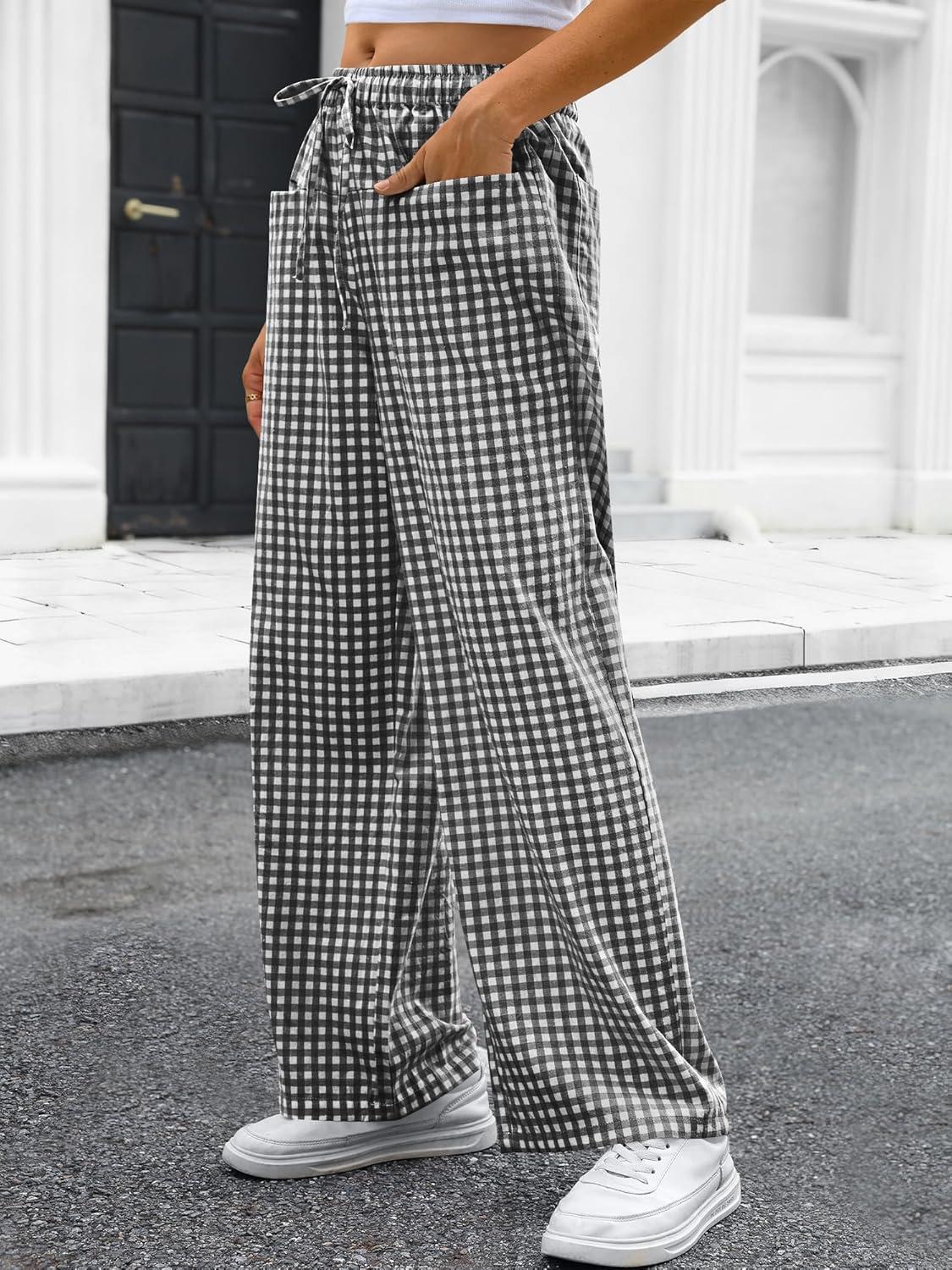 ANRABESS Womens Striped Gingham Pants 2026 Pajama Drawstring Wide Leg Lounge Plaid Pants Cute Casual Trousers with Pockets(Black White Plaid)
