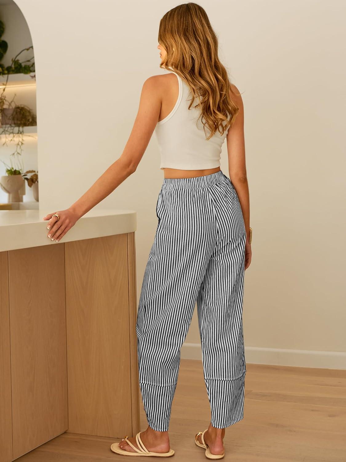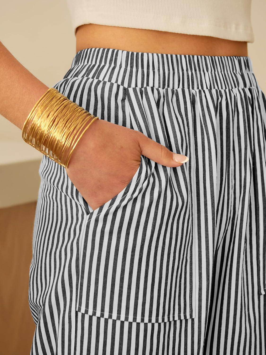 ANRABESS Womens Striped Gingham Pants Summer Lounge Cute PJ Bottom Plaid Pants Casual Wide Leg Beach Trouser with Pockets(Black White Stripe)