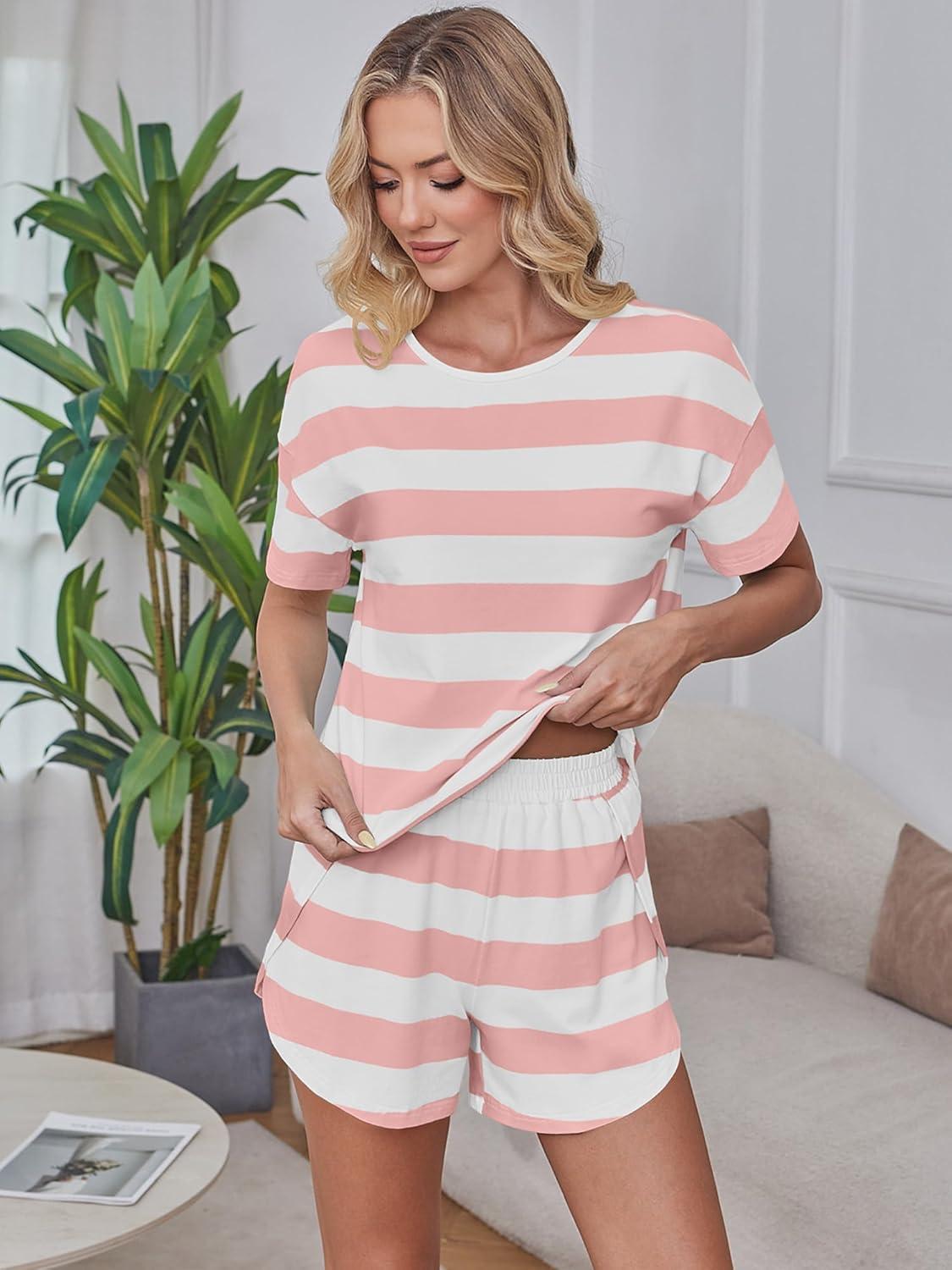 ANRABESS Womens Striped Pajamas Sets 2026 Summer 2 Piece Lounge Matching Short PJ Set Side Split Spring Sleepwear Outfits(Pink White Striped)
