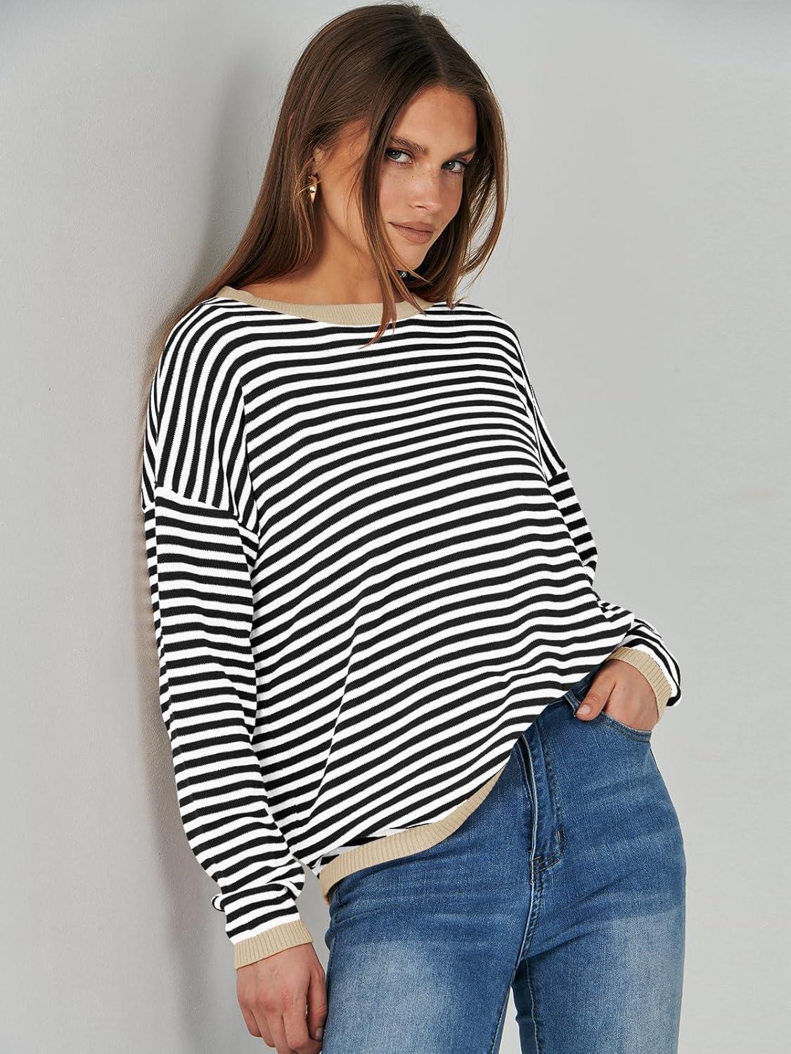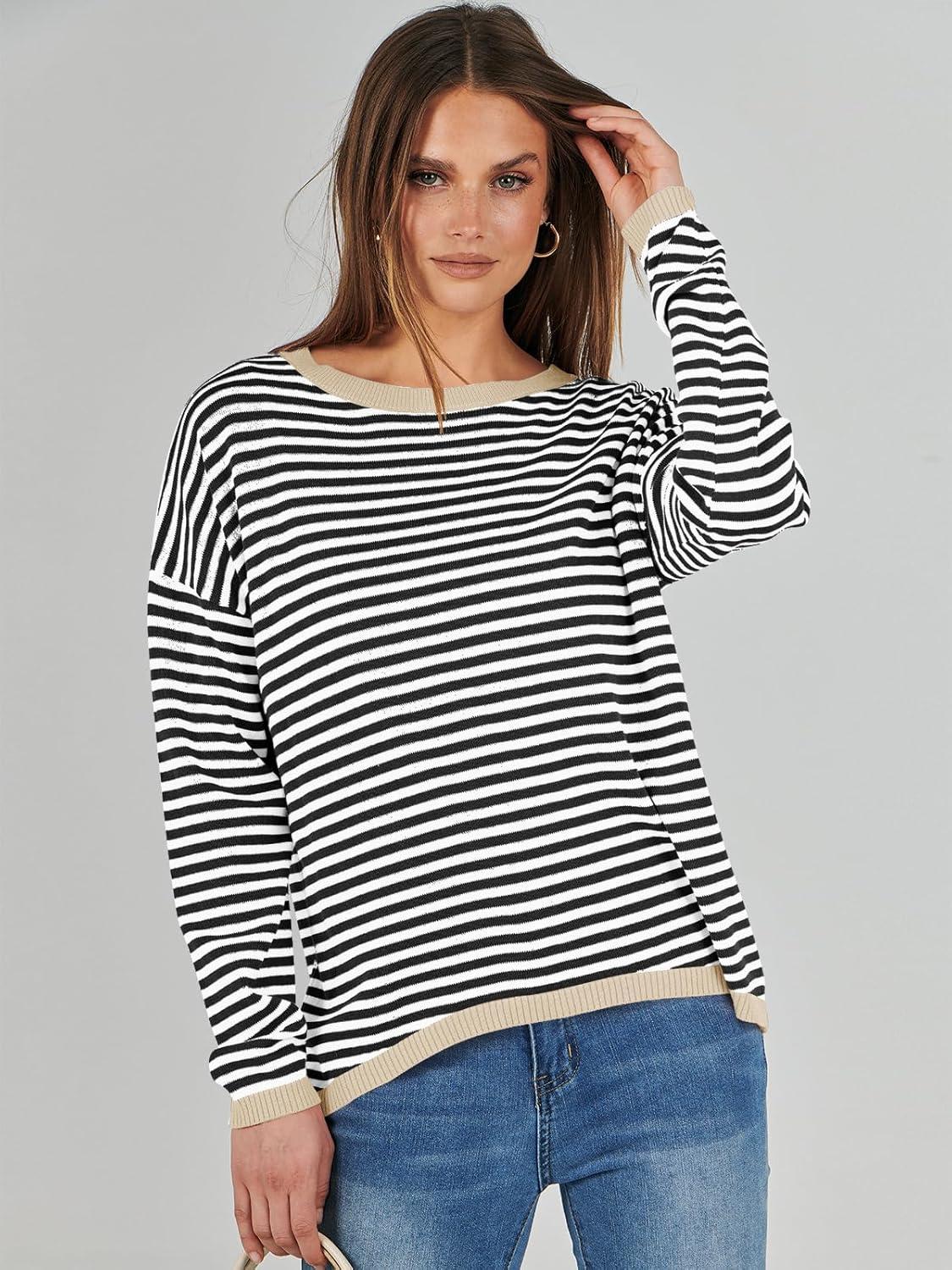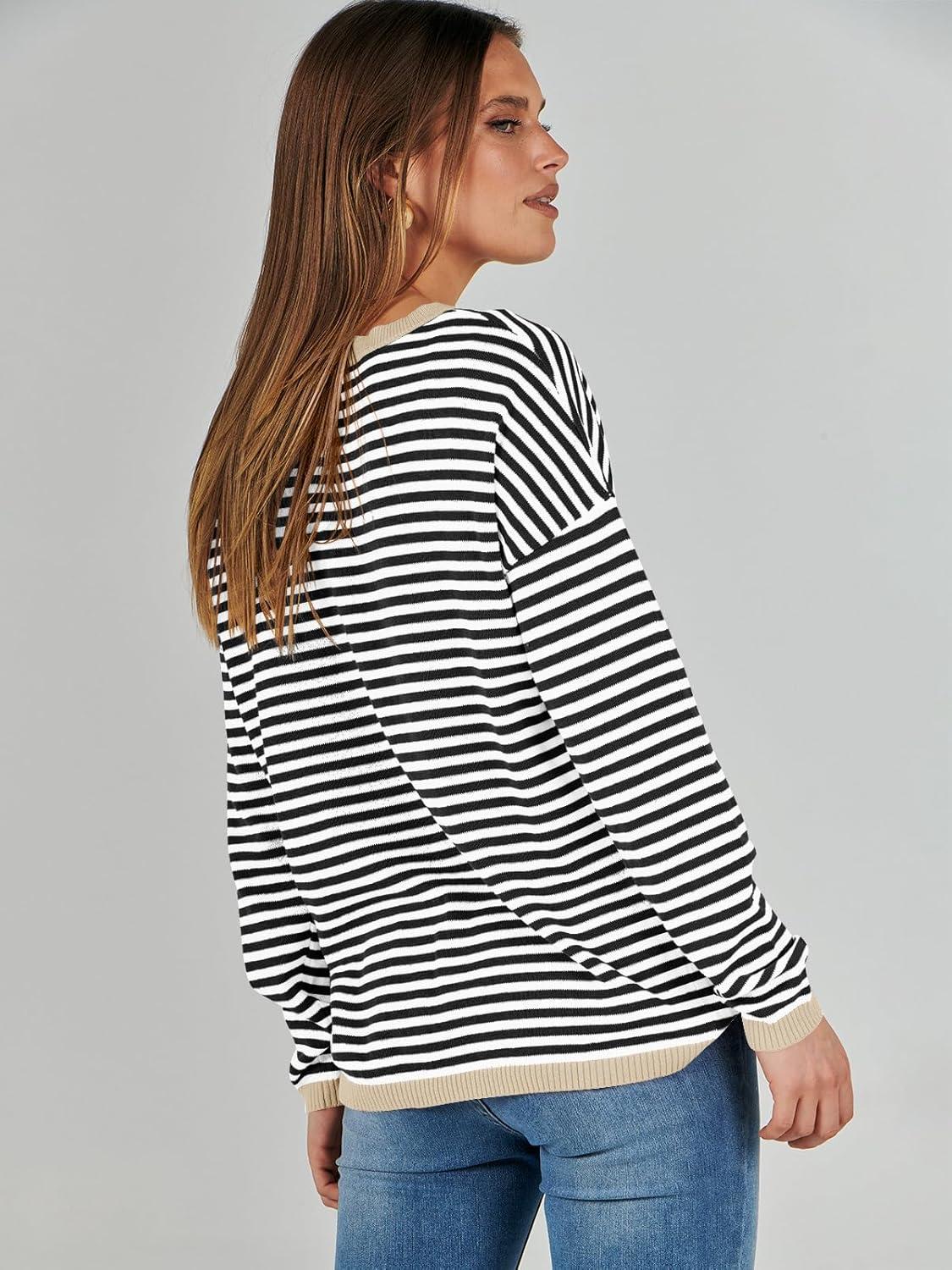 ANRABESS Womens Striped Sweaters Long Sleeve Top Crewneck Color Block Casual Loose Knitted Pullover Shirts 2025 Fall Outfits(Black White Blue)