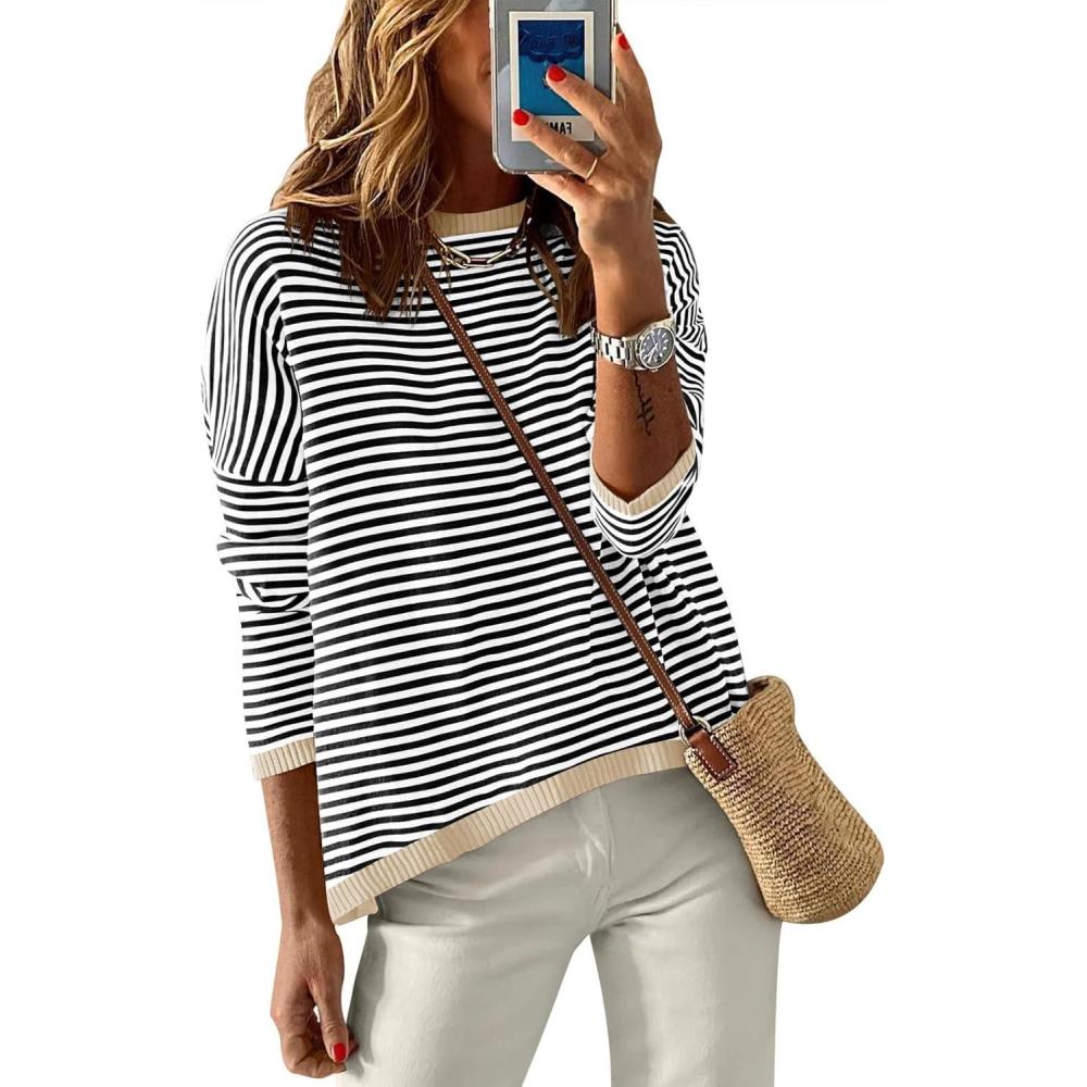 ANRABESS Womens Striped Sweaters Long Sleeve Top Crewneck Color Block Casual Loose Knitted Pullover Shirts 2025 Fall Outfits(Black White Apricot)