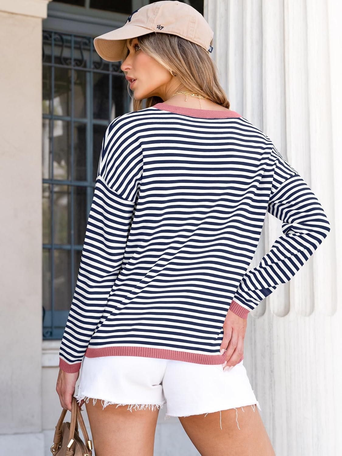 ANRABESS Womens Striped Sweaters Long Sleeve Top Crewneck Color Block Casual Loose Knitted Pullover Shirts 2025 Fall Outfits(Blue White Pink)