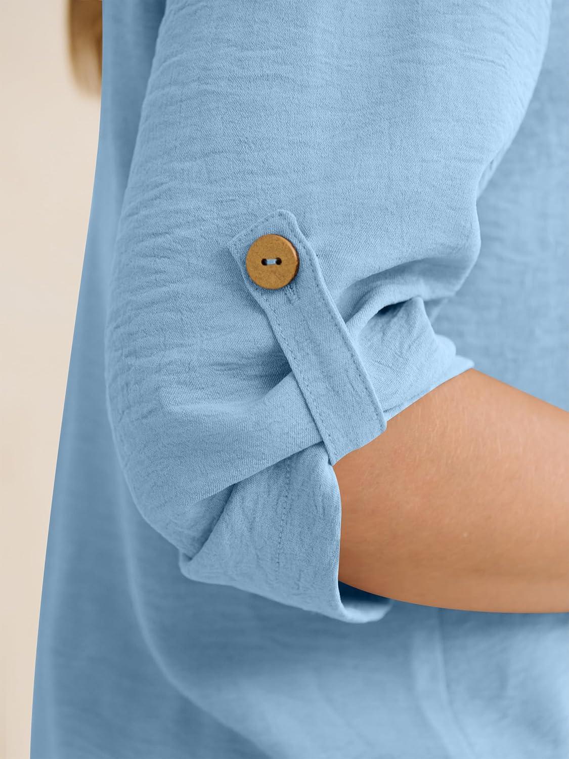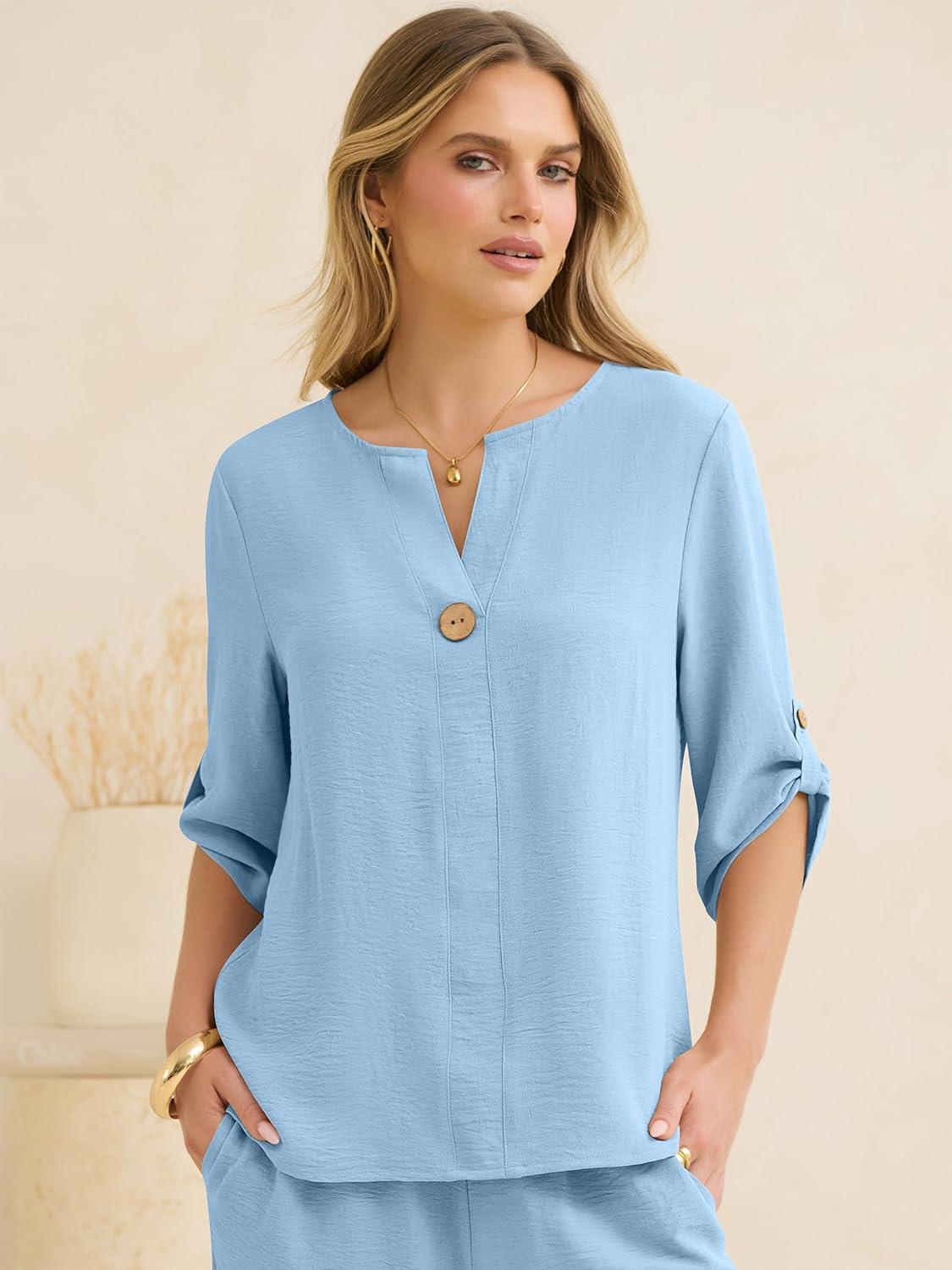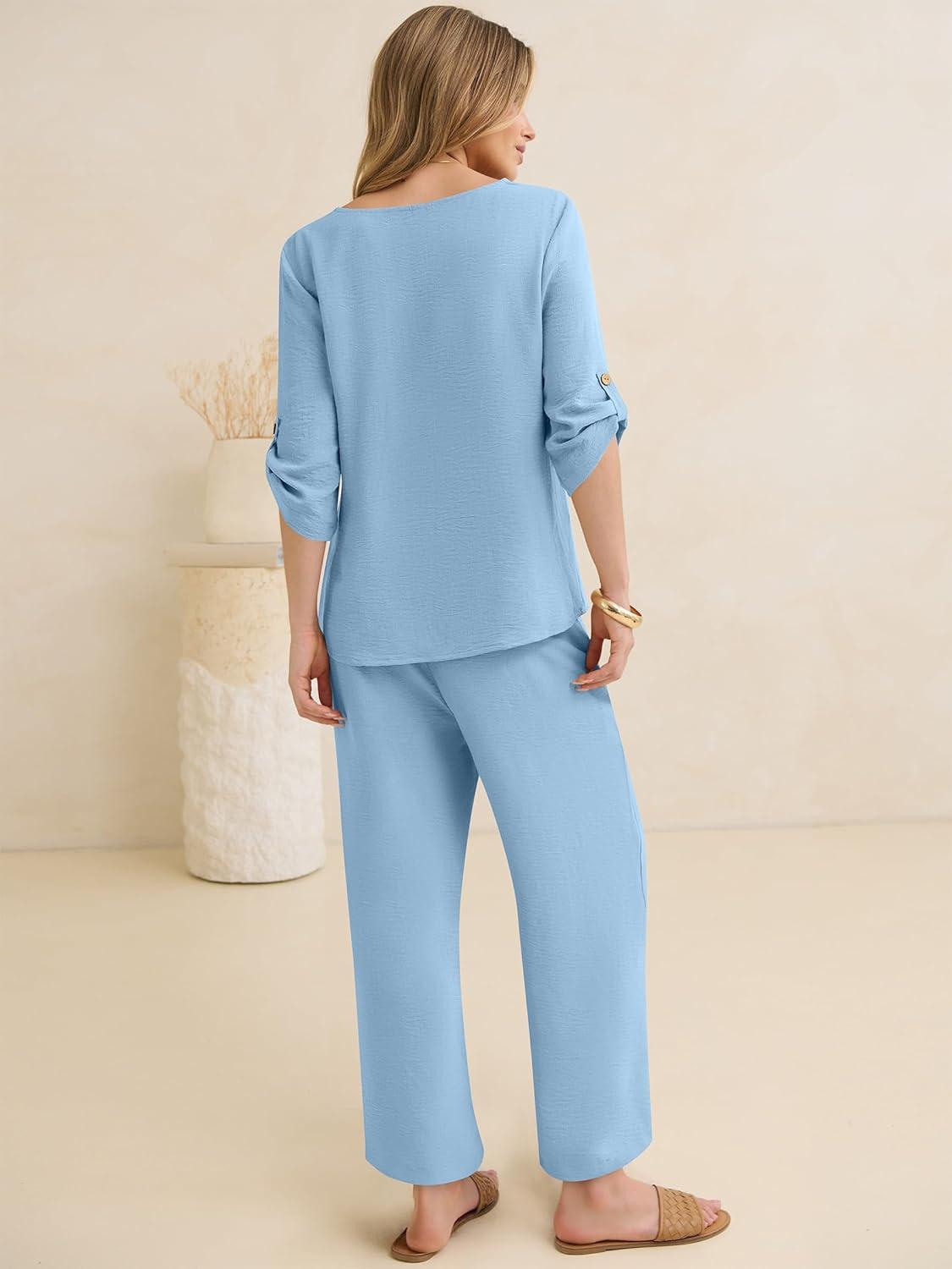 ANRABESS Womens Summer 2 Piece Lounge Sets 3/4 Sleeve V Neck Top Wide Leg Palazzo Pants Set 2026 Beach Travel Outfits(Bright Blue)