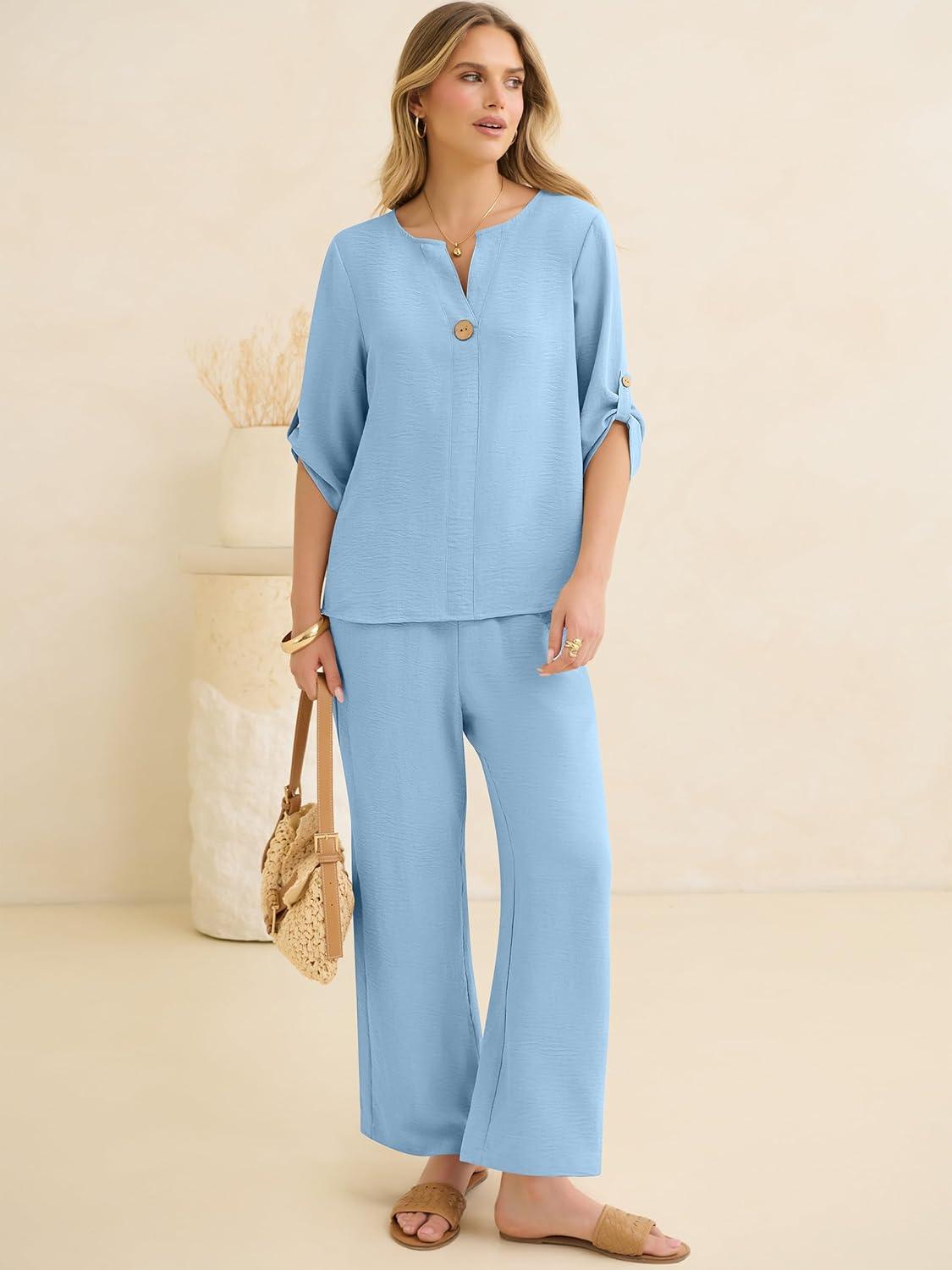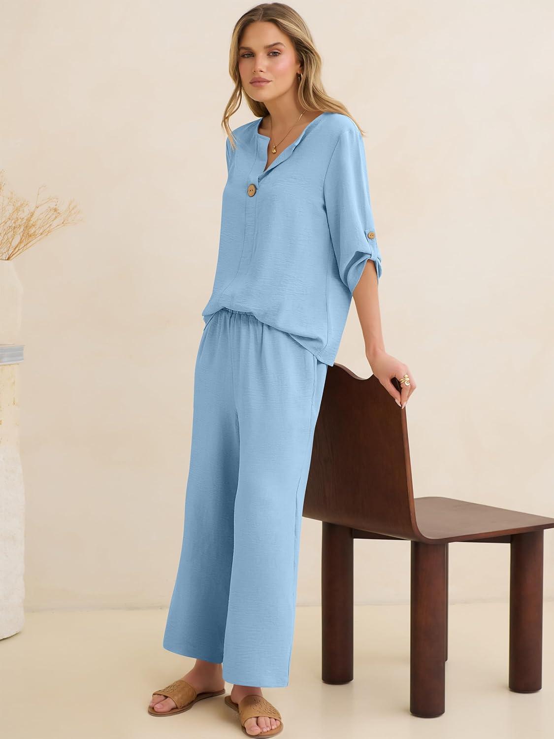 ANRABESS Womens Summer 2 Piece Lounge Sets Half Sleeve V Neck Top Linen Wide Leg Palazzo Pants Set 2026 Beach Travel Outfits(Bright Blue)