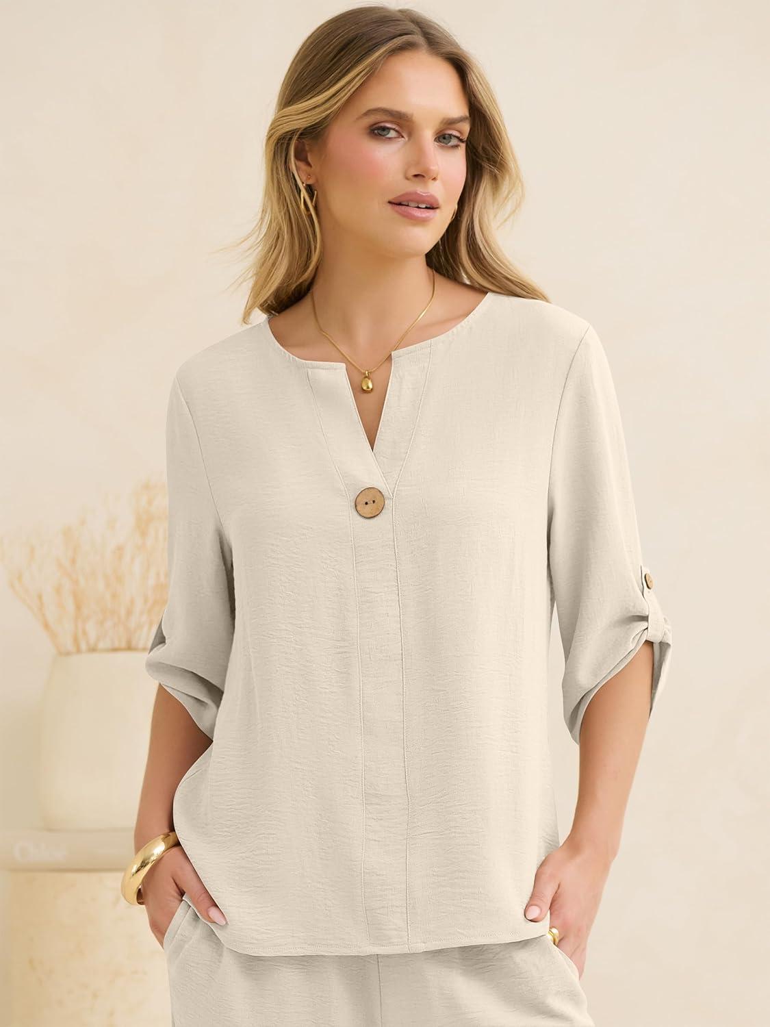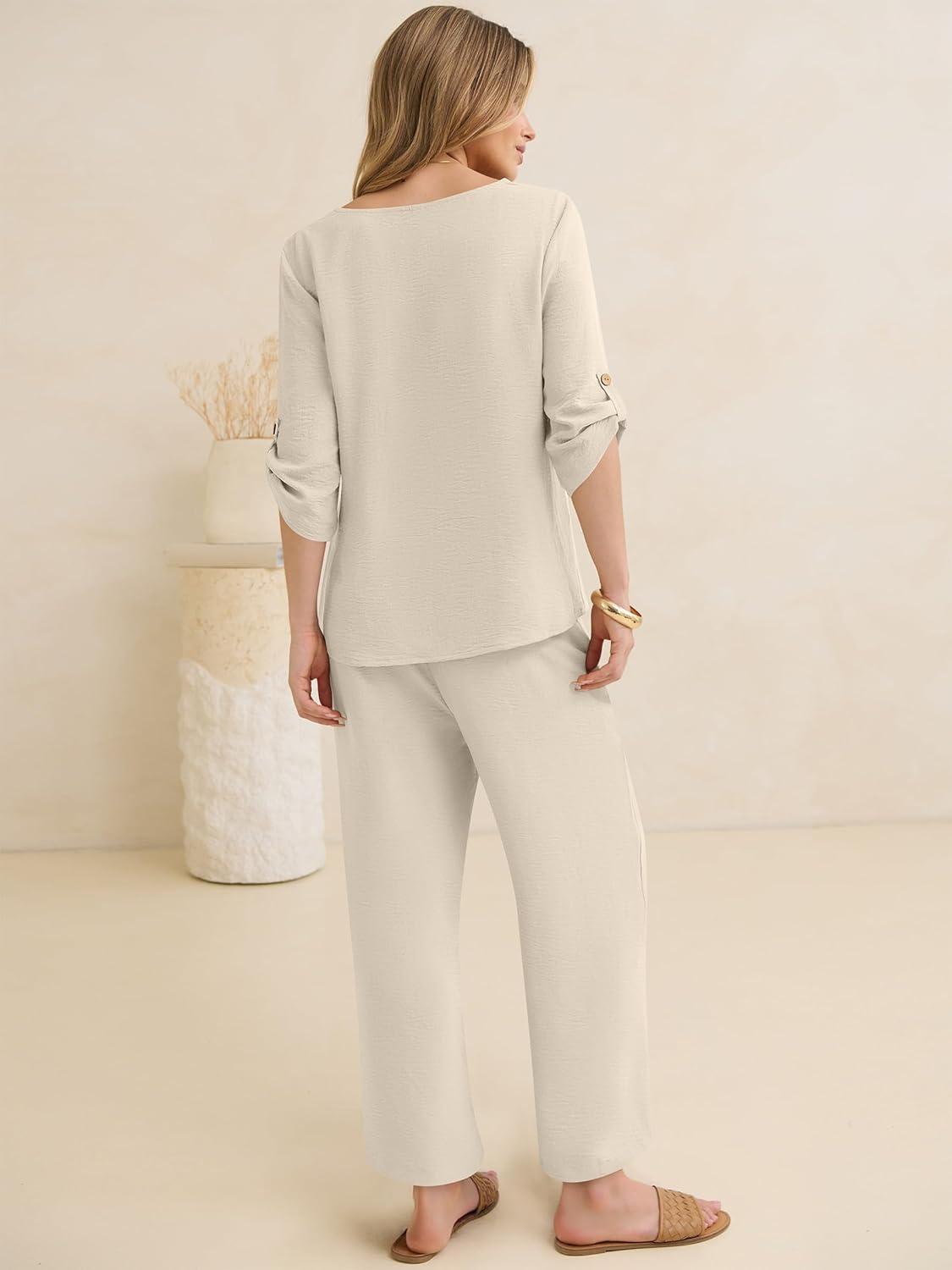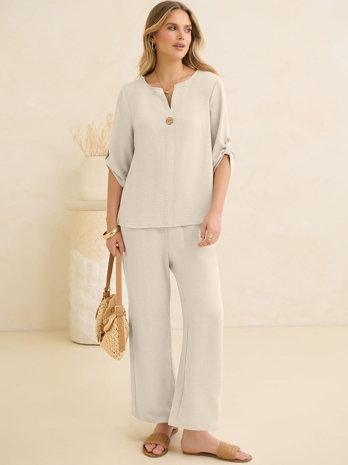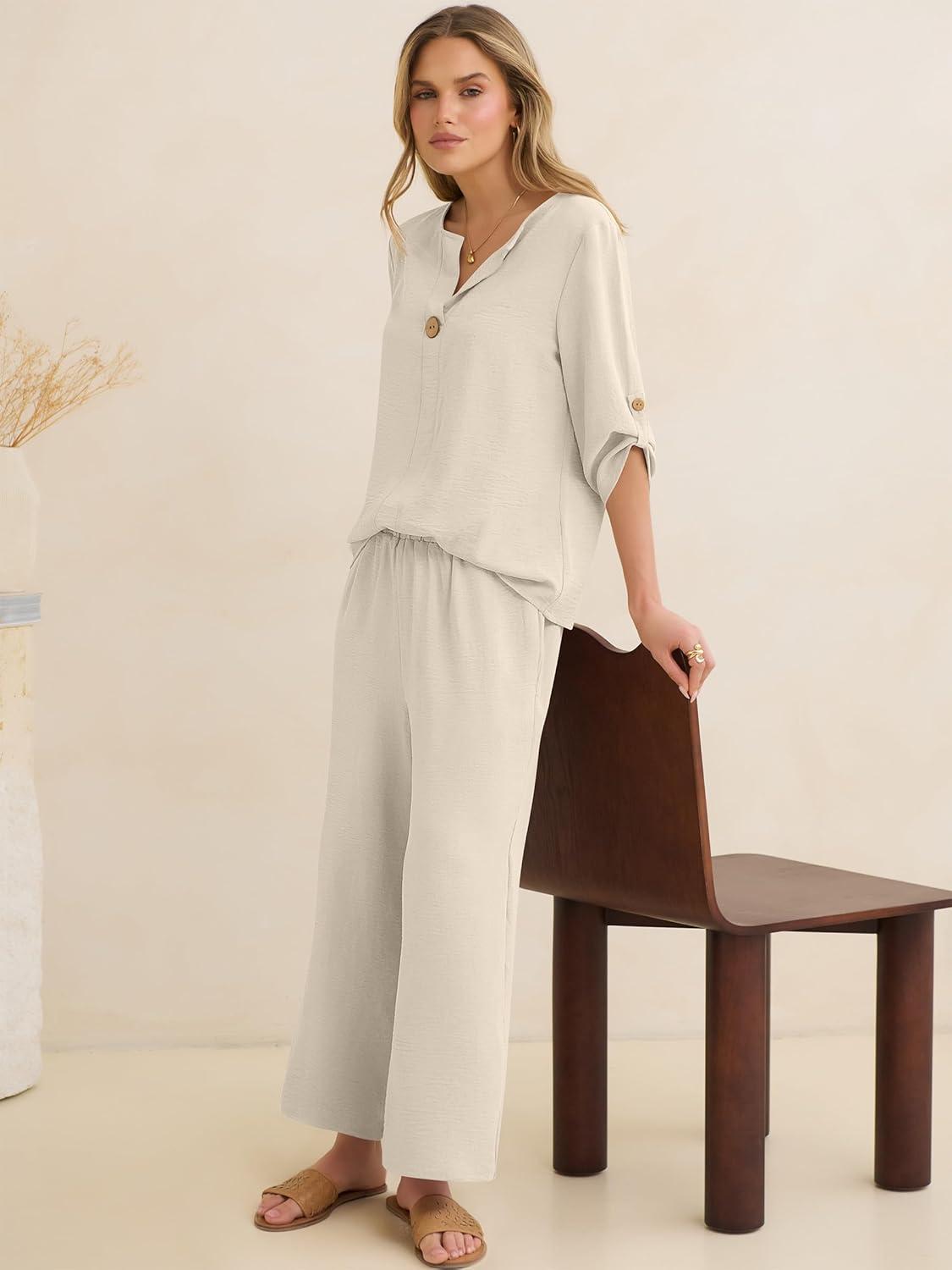 ANRABESS Womens Summer 2 Piece Lounge Sets Half Sleeve V Neck Top Linen Wide Leg Palazzo Pants Set 2026 Beach Travel Outfits(Lake)