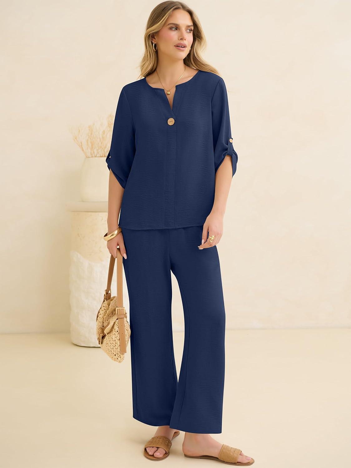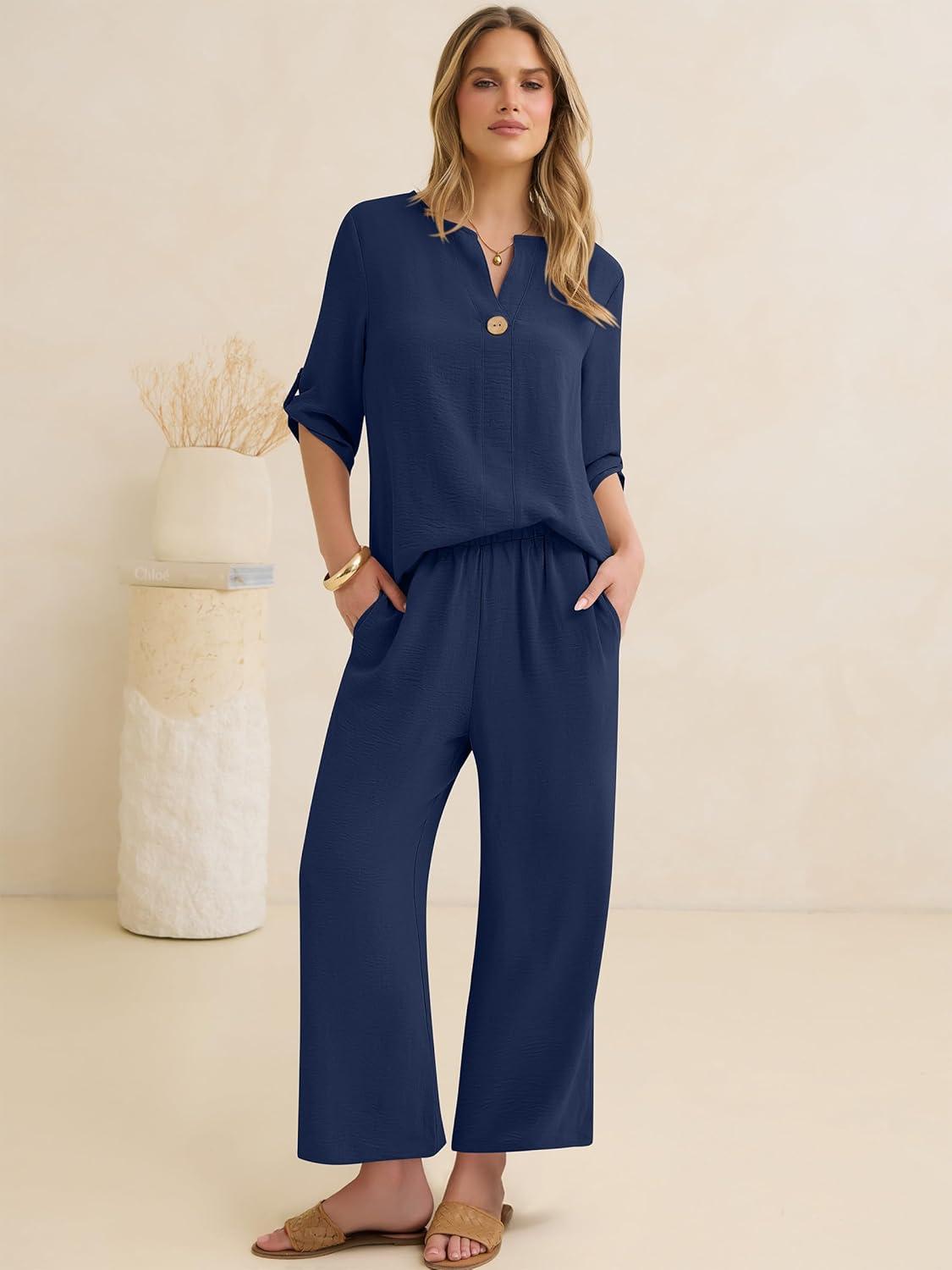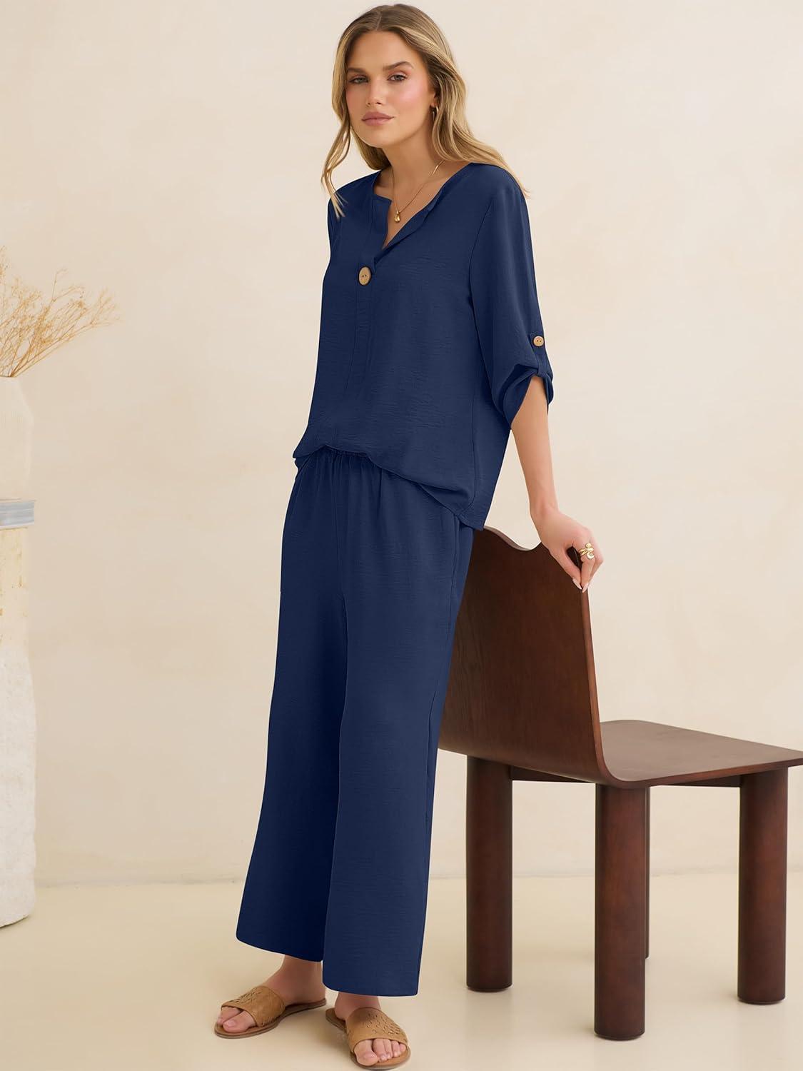 ANRABESS Womens Summer 2 Piece Lounge Sets Half Sleeve V Neck Top Linen Wide Leg Palazzo Pants Set 2026 Beach Travel Outfits(Navy Blue)