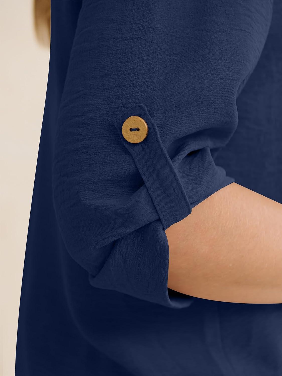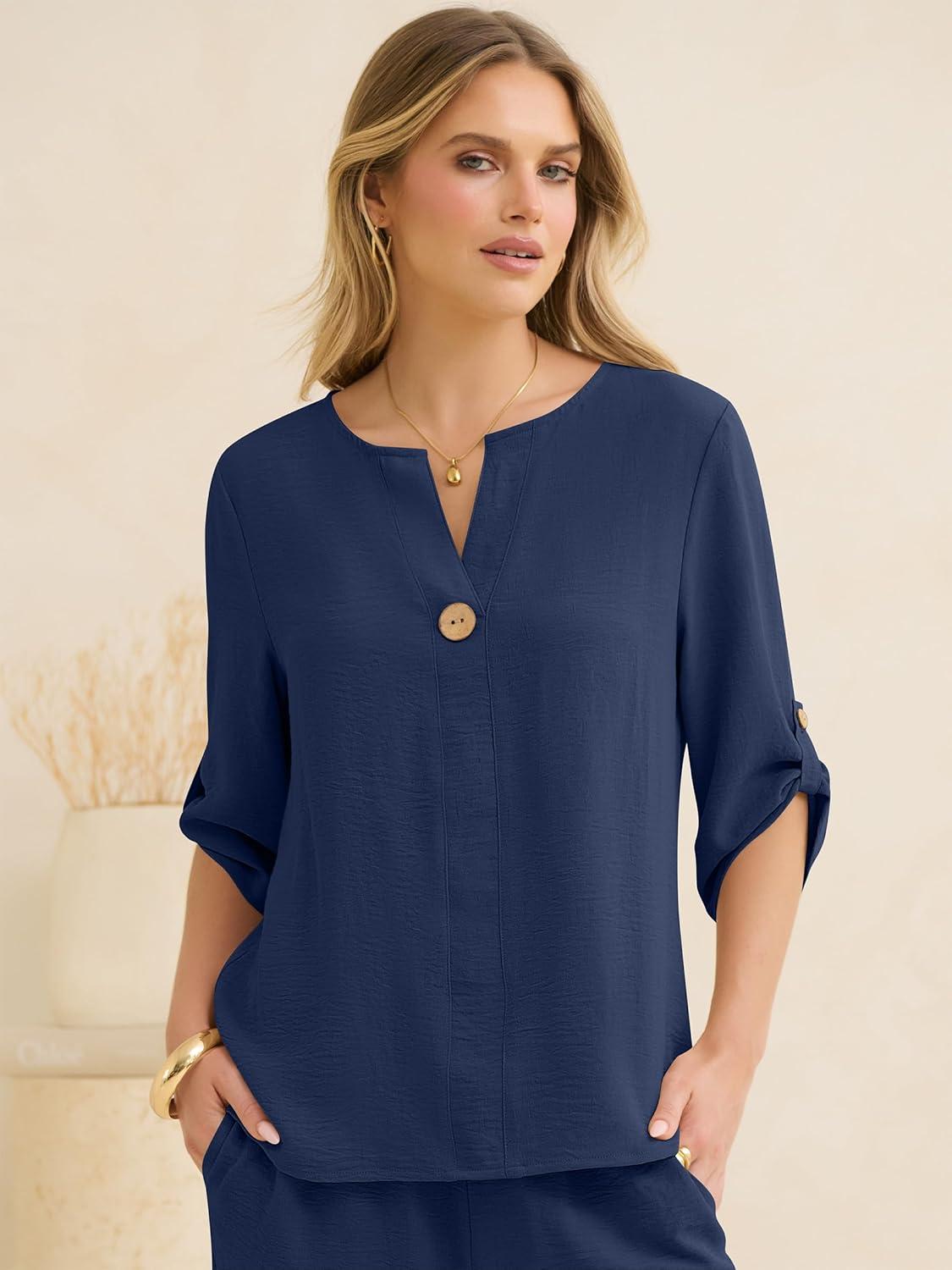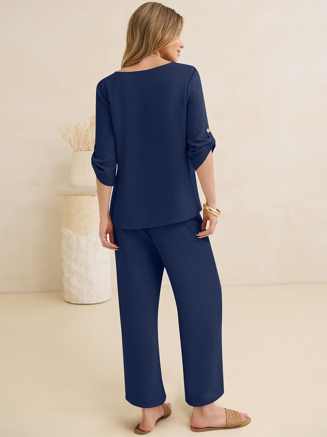 ANRABESS Womens Summer 2 Piece Lounge Sets Half Sleeve V Neck Top Linen Wide Leg Palazzo Pants Set 2026 Beach Travel Outfits(Navy Blue)