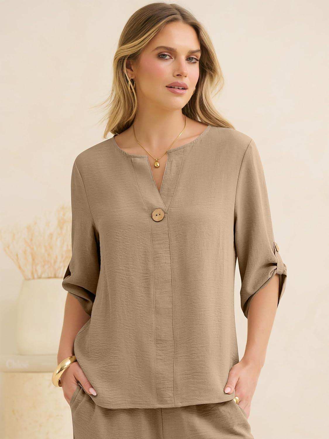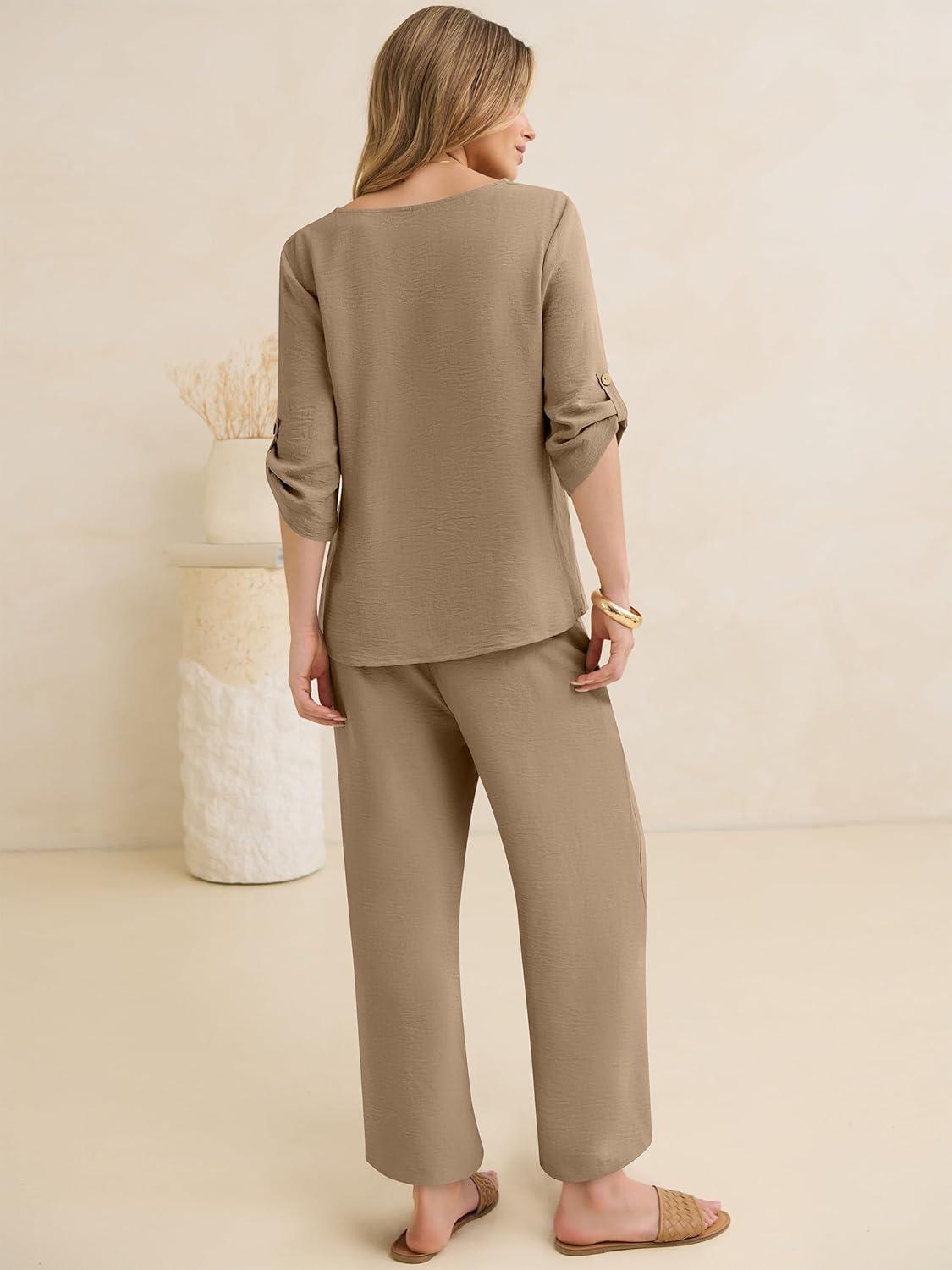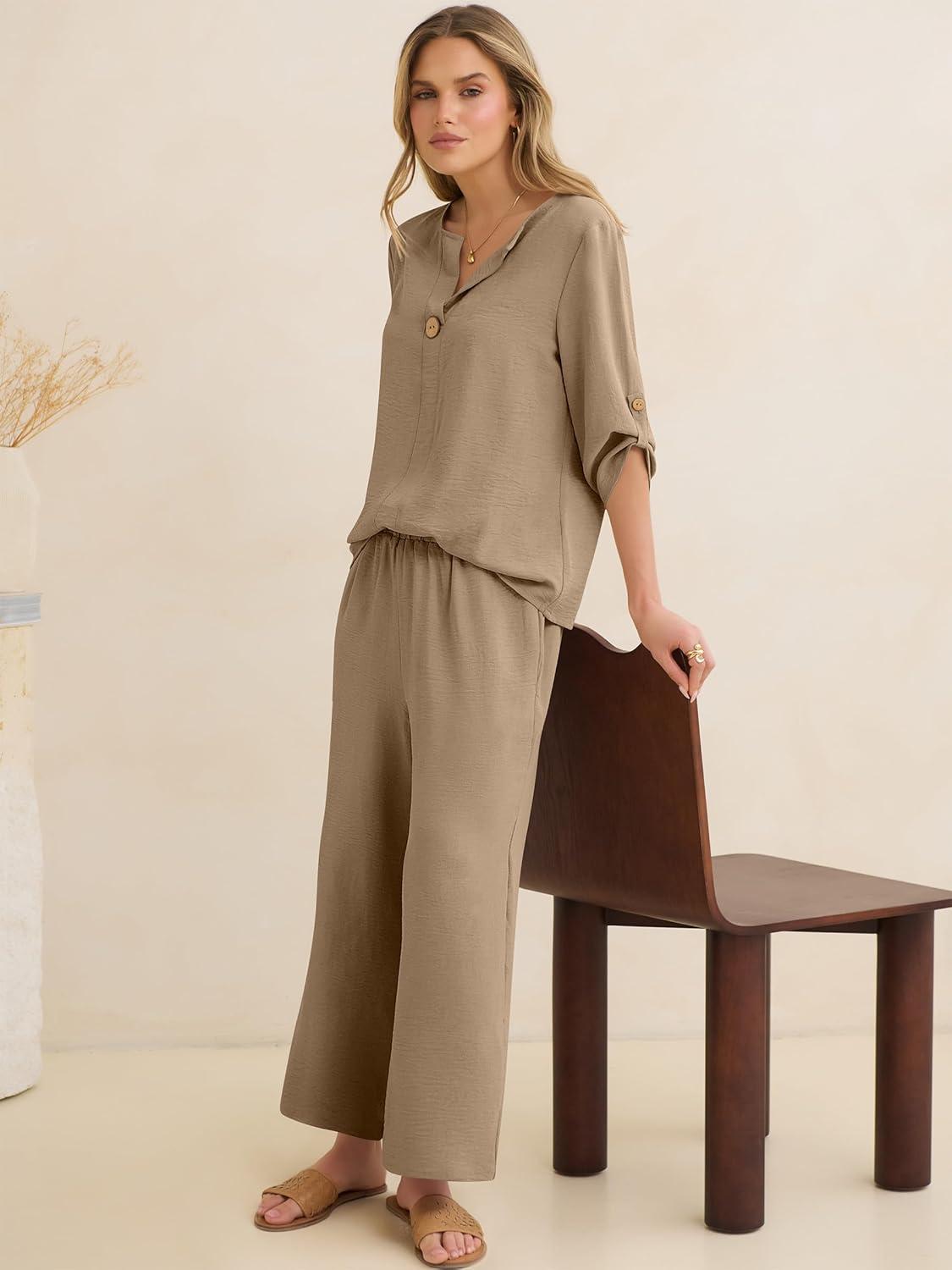 imageANRABESS Womens Summer 2 Piece Lounge Sets Half Sleeve V Neck Top Linen Wide Leg Palazzo Pants Set 2026 Beach Travel OutfitsYellow Khaki